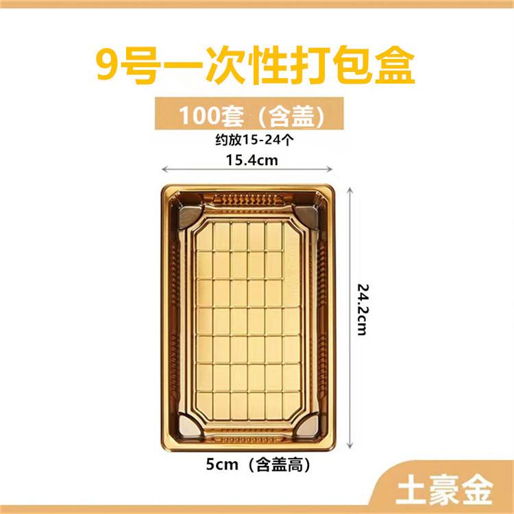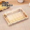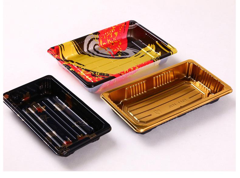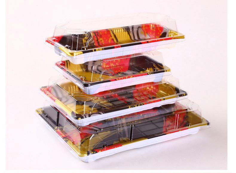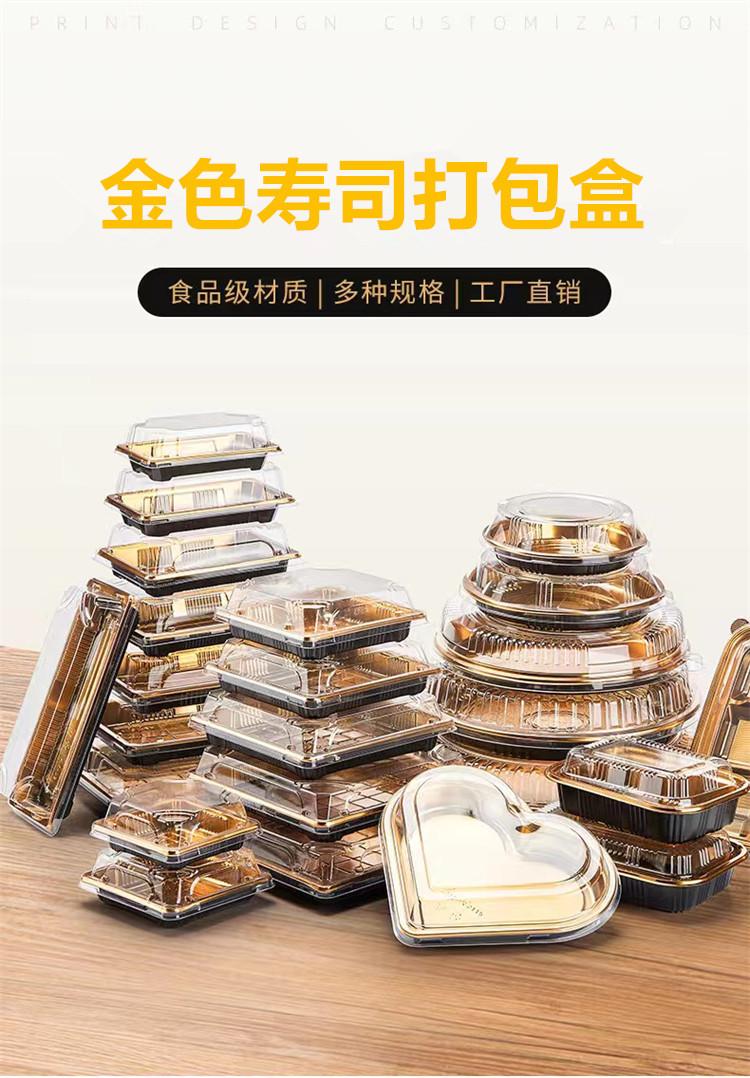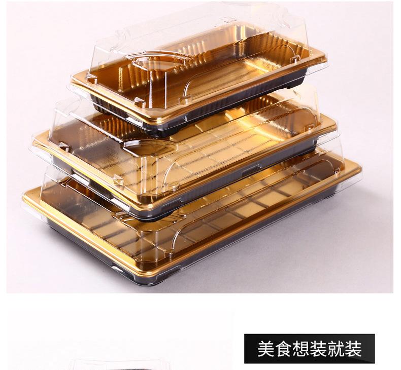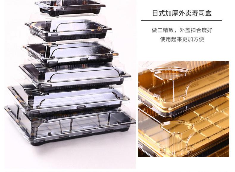 Caja de sushi dorada desechable para llevar, de plástico antivaho, PET, para salmón y sashimi, de alta gama.
