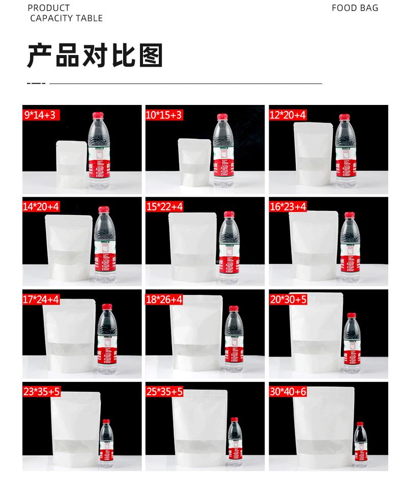 White cowhide HD window self-standing bag full set of samples; White kraft paper/PET/CPP
