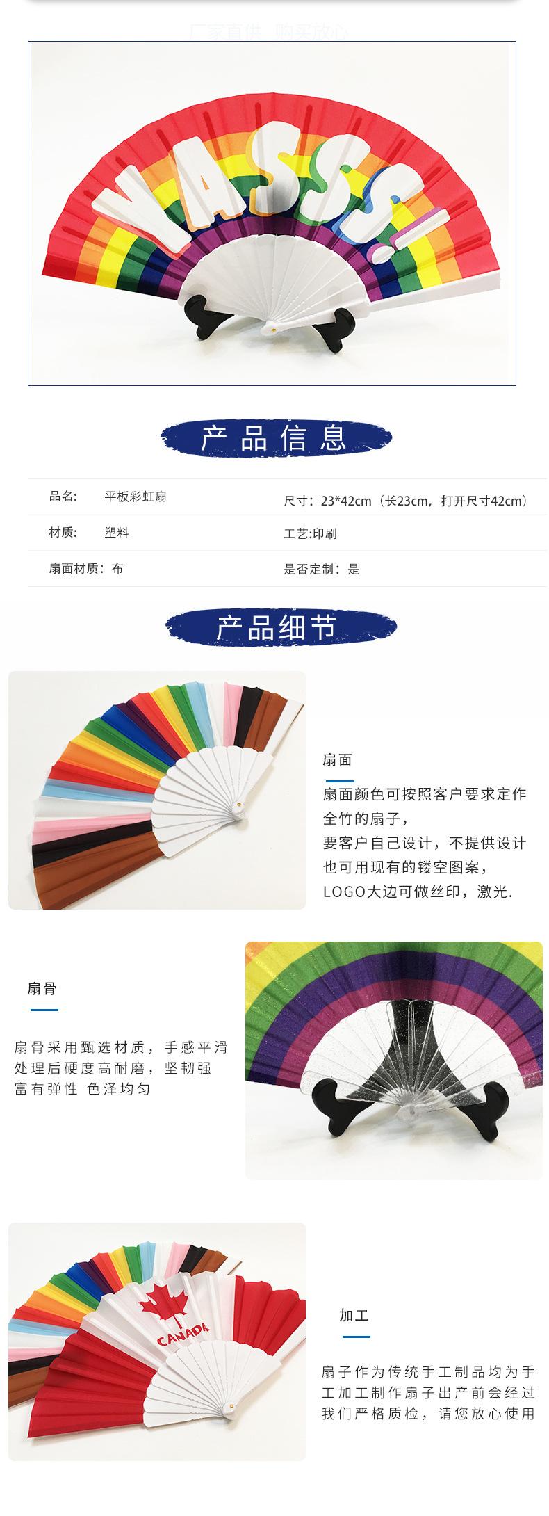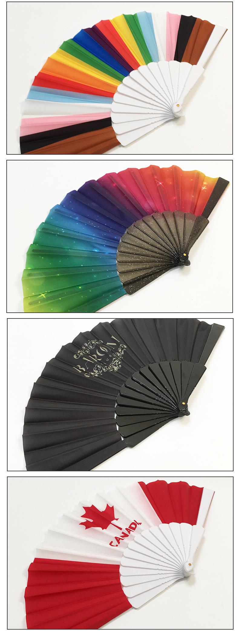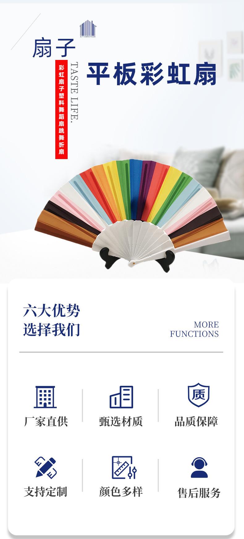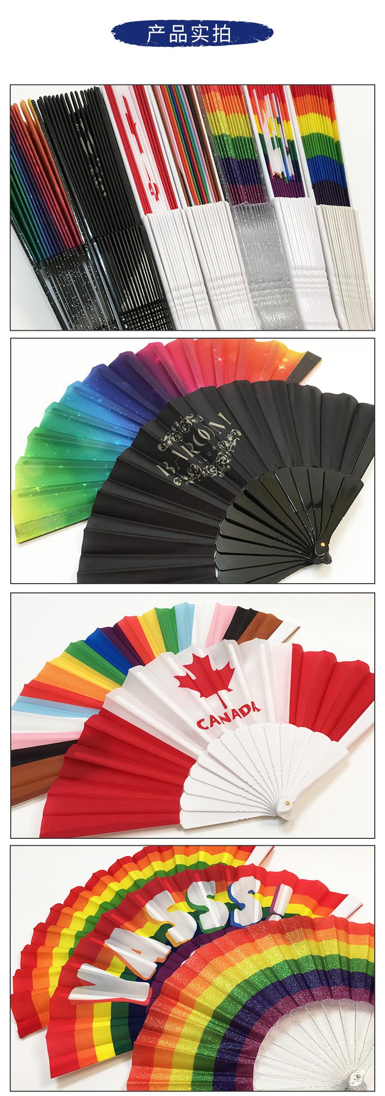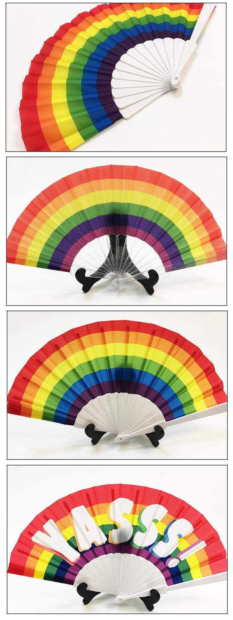 Abanico de arcoíris, abanico de baile de plástico, abanico plegable para bailar, abanico de tela, abanico publicitario, abanico español, fábrica de Guangzhou, venta al por mayor