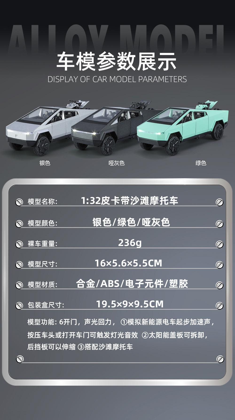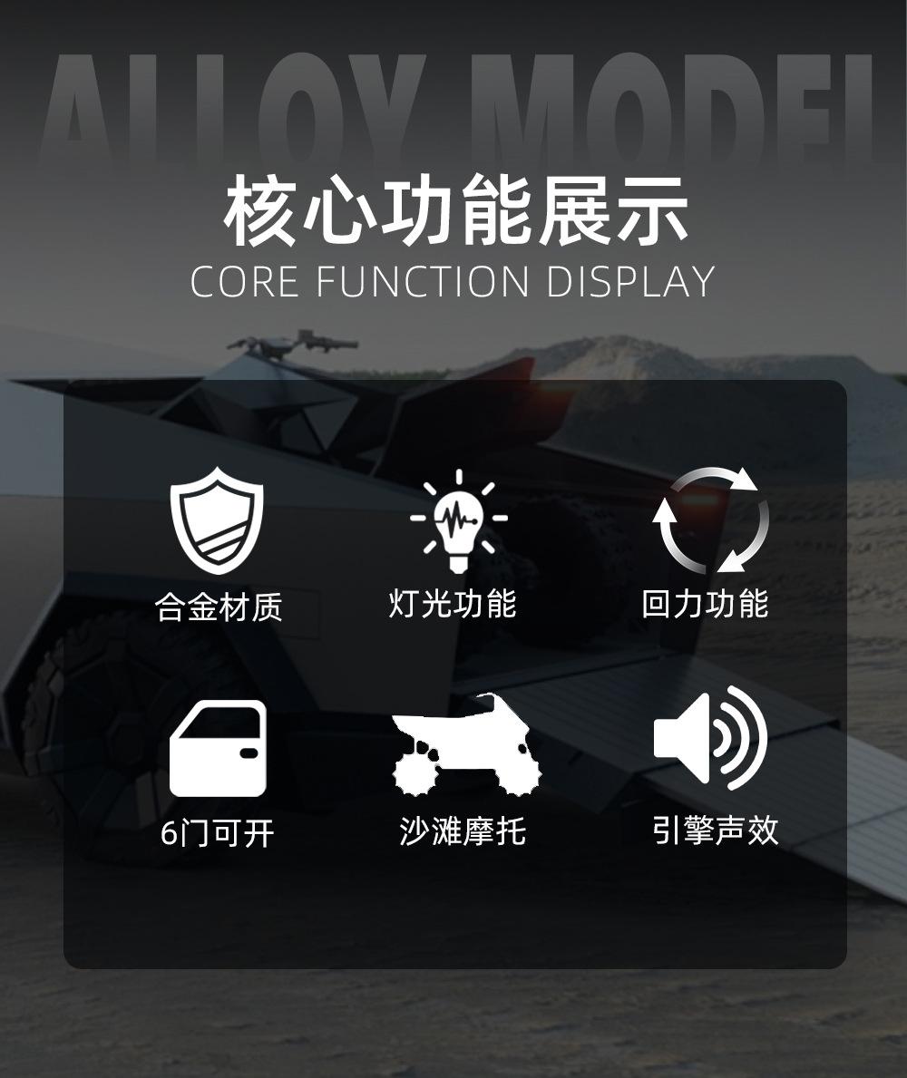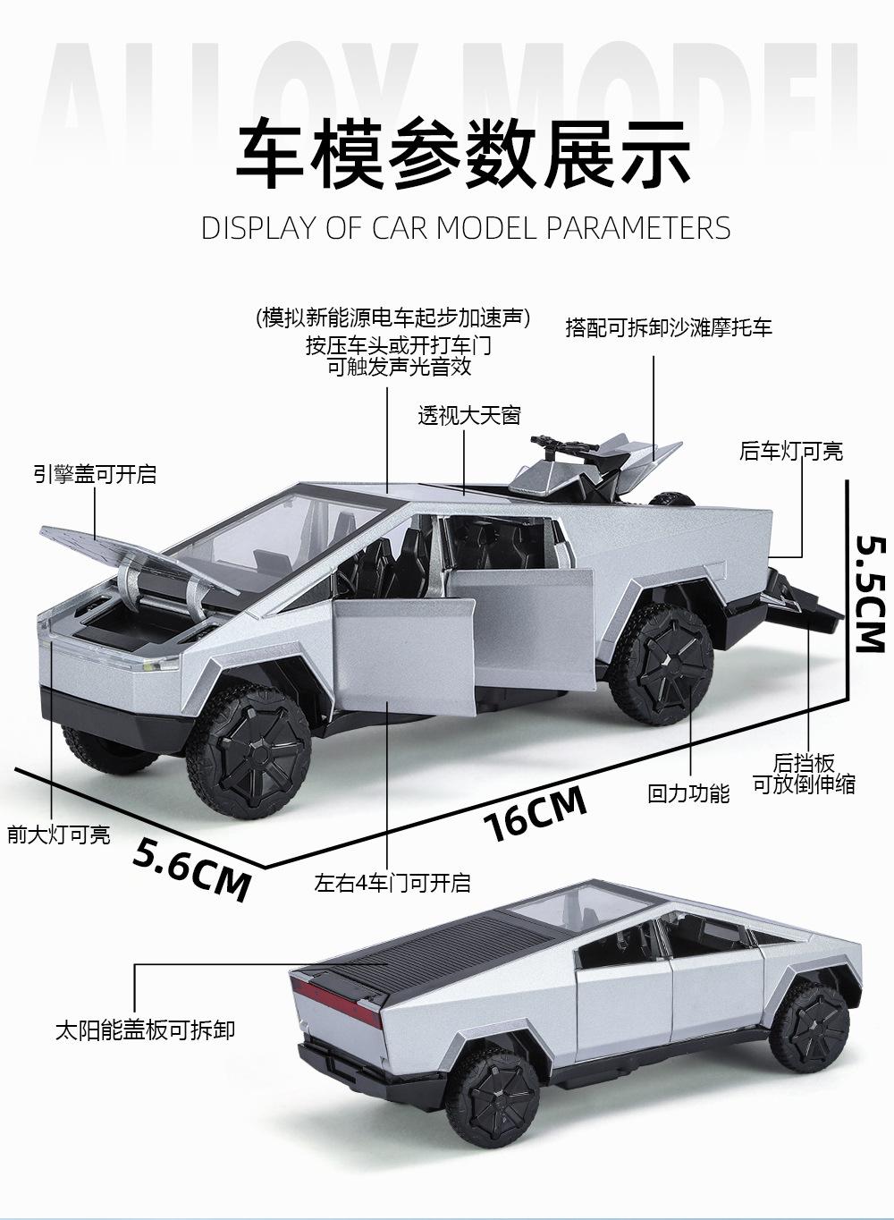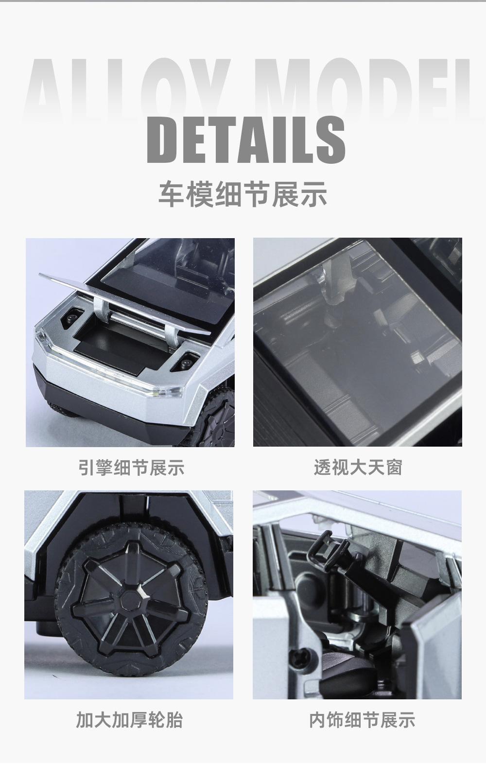 1. Material del producto: La parte delantera está hecha de material de aleación para crear los detalles y la textura del vehículo real. El compartimento trasero está hecho de plástico ABS, que es ligero y no se deforma fácilmente, manteniendo la belleza general del modelo.