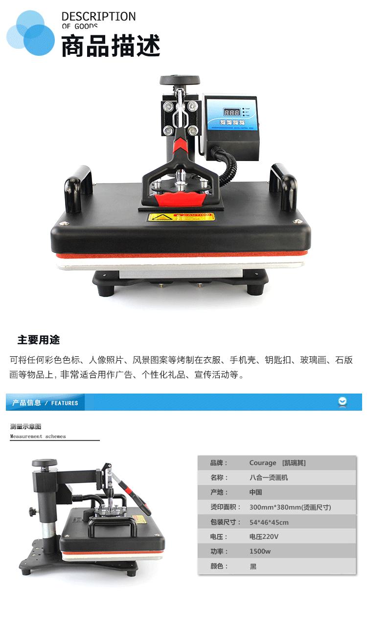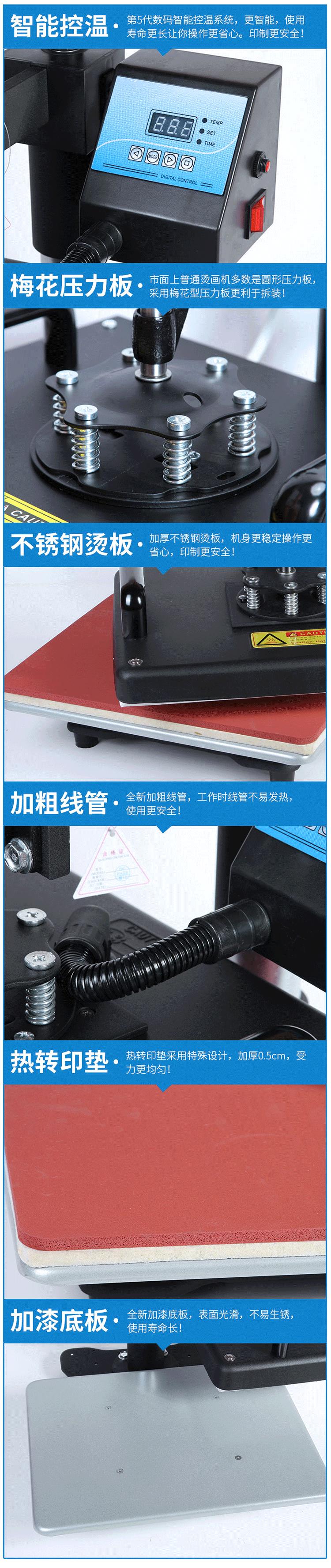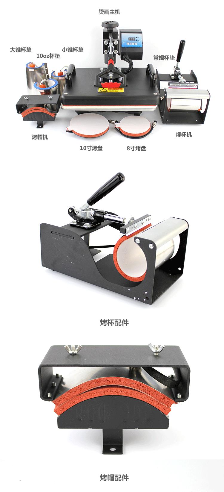 Esta máquina es una máquina de transferencia térmica multifuncional que puede imprimir imágenes en la superficie de camisetas, litografías, azulejos, tableros perlados, llaveros, bolsos, tazas, platos, sombreros, etc. Controlada electrónicamente, fácil de operar.