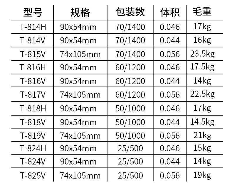 T-814 horizontal 90X54, T-814 vertical 54X90, T-815 vertical 74X105, T-816 horizontal 80X54, T-816 vertical 54...