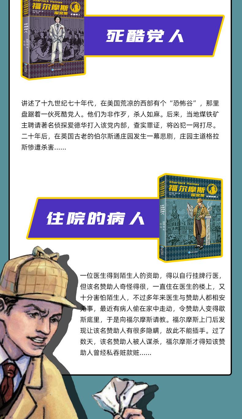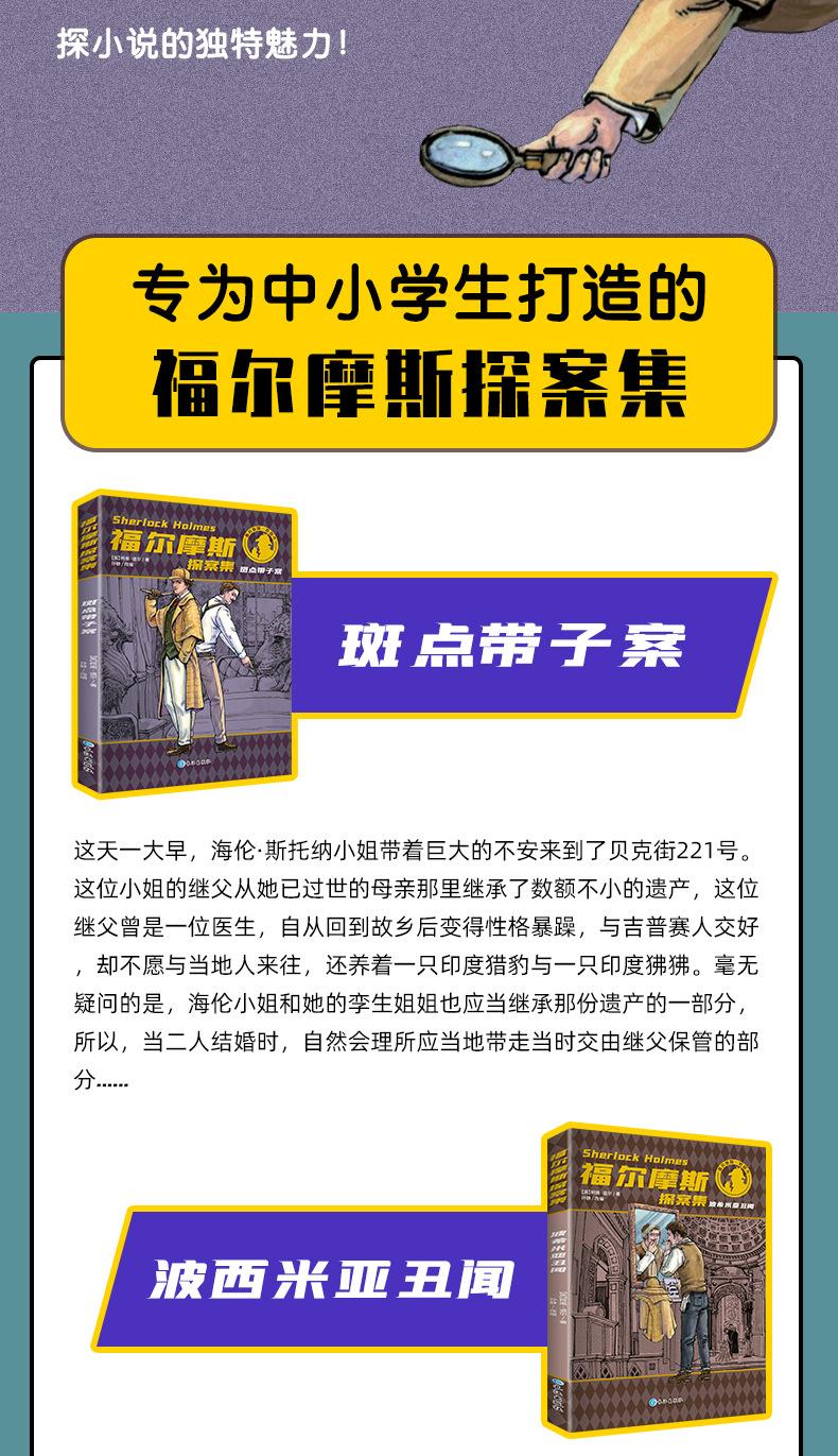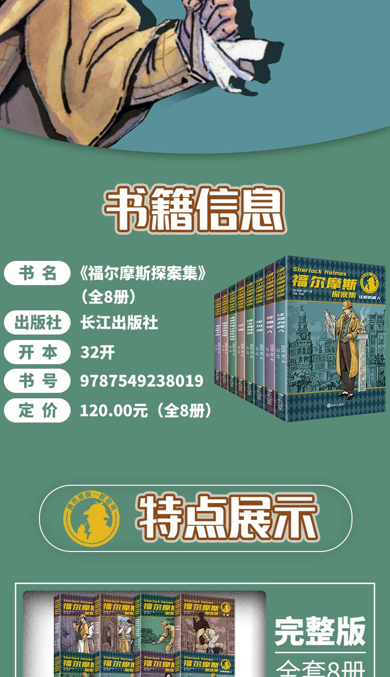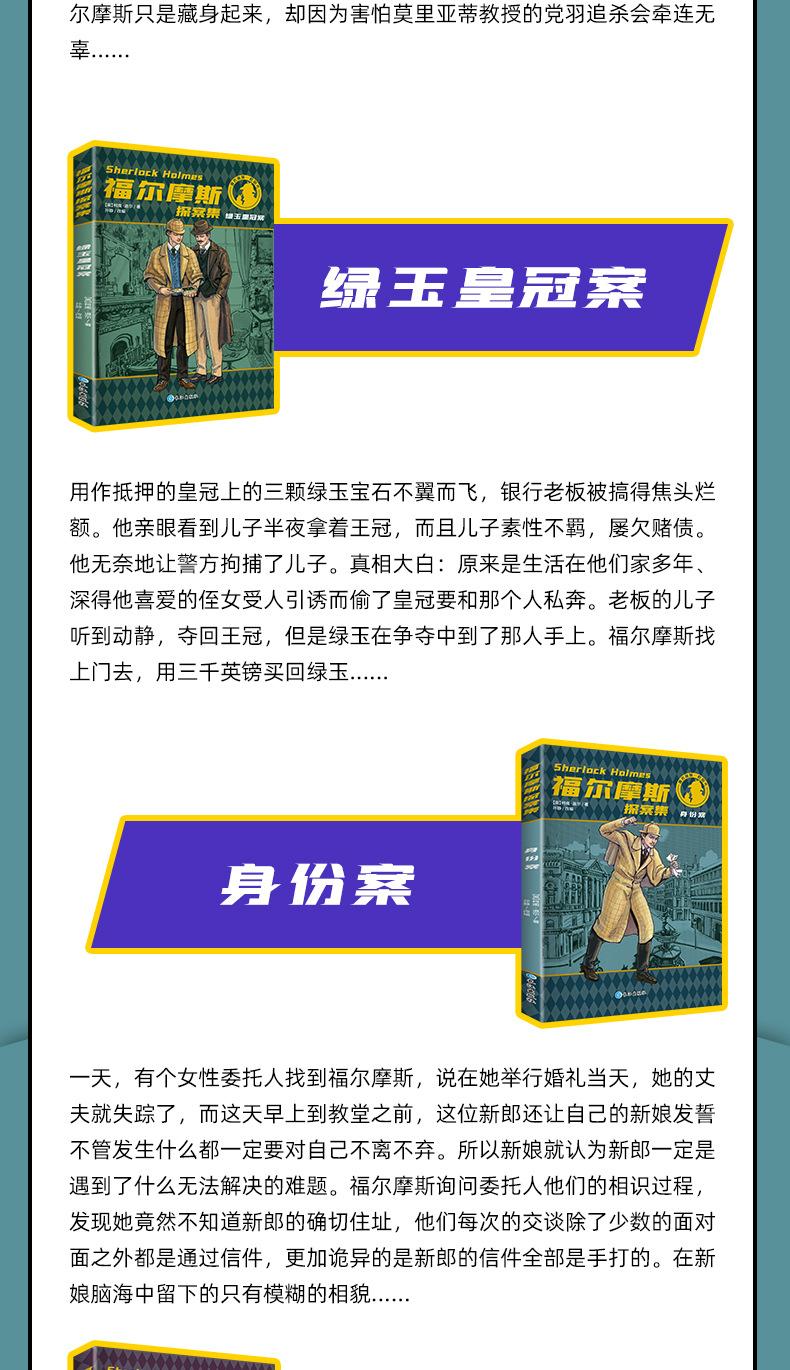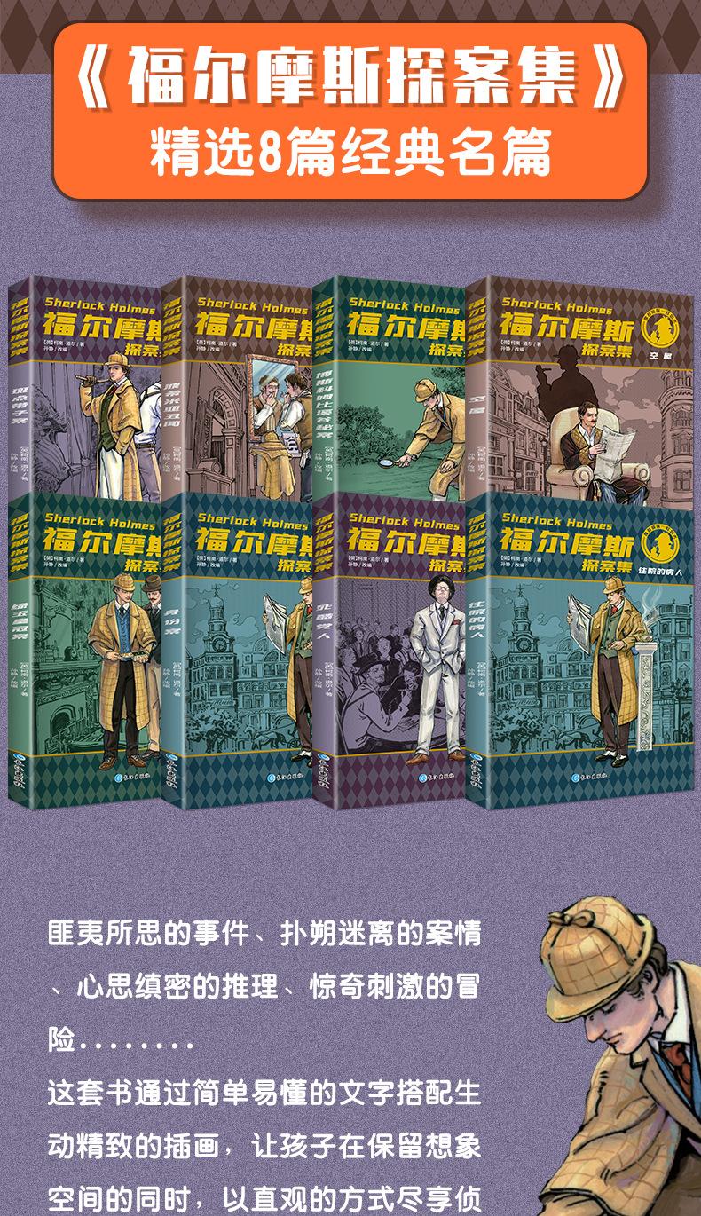 Las aventuras de Sherlock Holmes (8 volúmenes) incluye La casa vacía, El paciente del hospital, El caso de la corona verde, El misterio del valle de Foscombe, El caso de la identidad, El caso del cinturón moteado, El escándalo en Bohemia y La fiesta genial. Basado en las características de aprendizaje y los hábitos de lectura de los adolescentes, el libro ha sido adaptado razonablemente respetando la obra original. El texto de este conjunto de libros está cuidadosamente pulido y el lenguaje es fácil de entender. Para ayudar a los niños a comprender mejor el contenido de la novela, también se añaden hermosas imágenes al libro. La trama de la novela es intrincada, el caso es confuso, el razonamiento es fascinante, los personajes son vívidos y únicos, y las imágenes de los protagonistas Holmes y Watson están profundamente arraigadas en los corazones de la gente. Al leer este conjunto de libros, la capacidad de pensamiento lógico de los niños puede mejorar considerablemente, y su sentido de la justicia y la compasión puede fortalecerse.