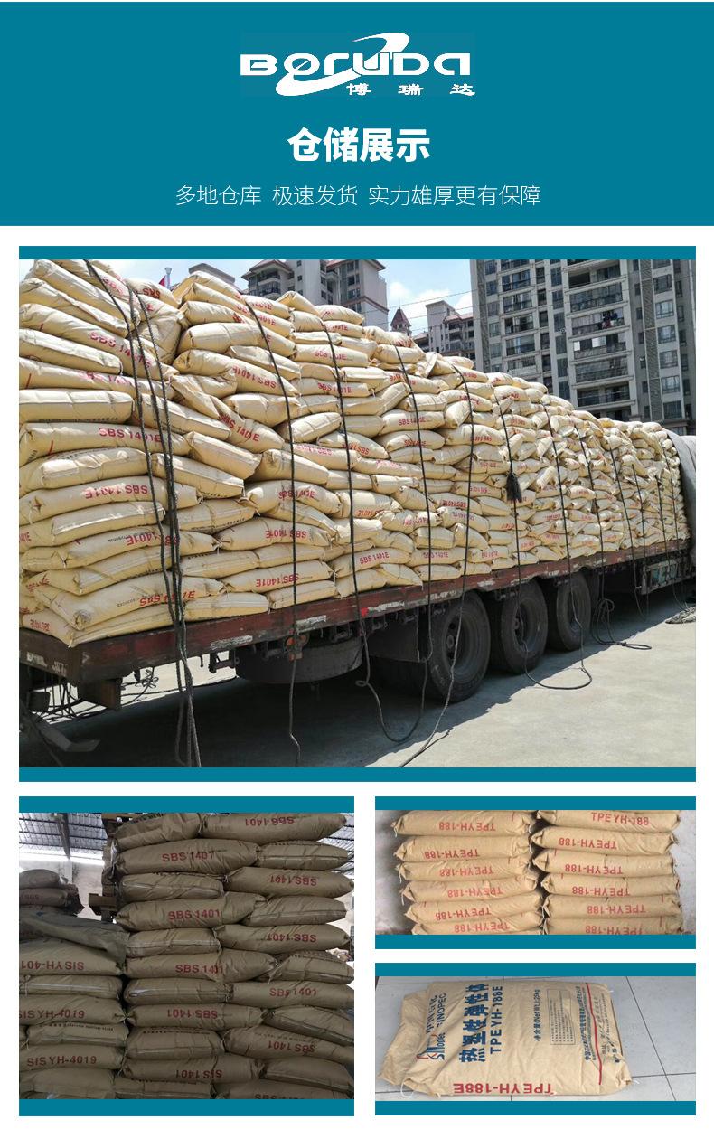 2) Empacado PetroquímicoSBS es un copolímero de bloque de estireno-butadieno, que aparece como partículas porosas blancas o polvo. Tiene las ventajas de elasticidad de caucho y procesabilidad plástica, y tiene buena resistencia a bajas temperaturas, permeabilidad al aire y propiedades antideslizantes. Se utiliza ampliamente en los campos de materiales para suelas, modificación de plásticos, adhesivos y modificación de asfalto.