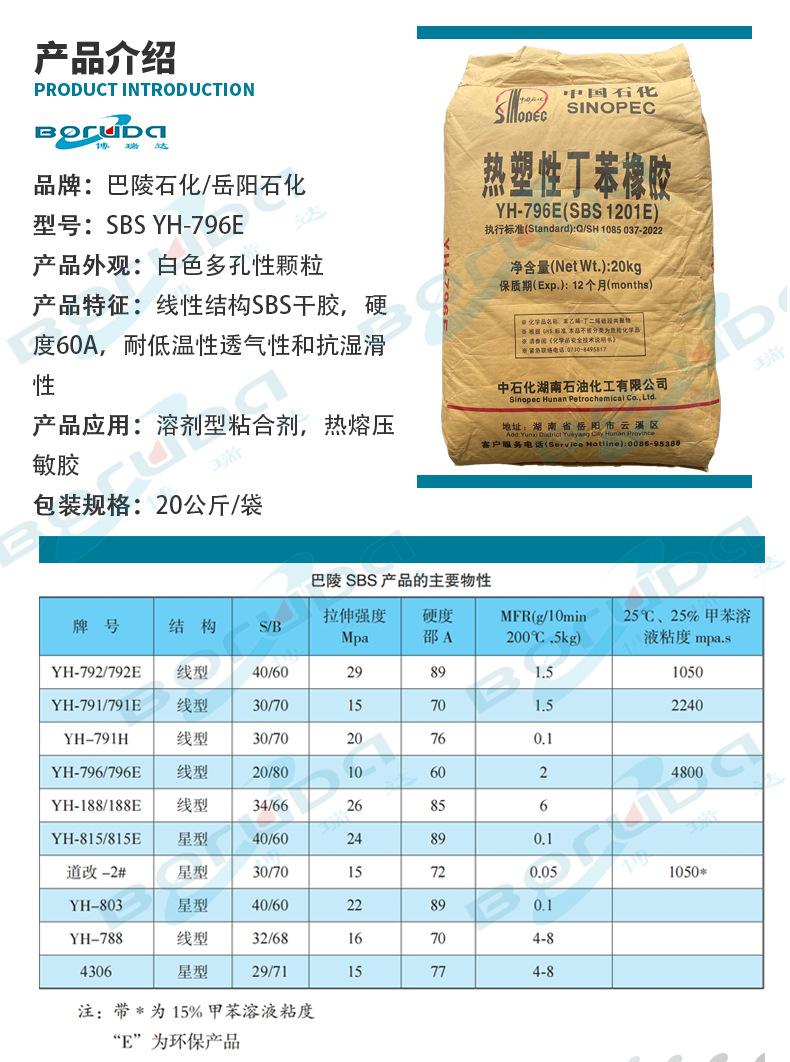 1) Baling Petrochemical SBS YH-796E es un elastómero termoplástico con una estructura lineal y contenido de estireno. Su apariencia es:Partículas porosas blancas,Con alta viscosidad, se utiliza en adhesivos base solvente, adhesivos hot melt sensibles a la presión, modificación de plásticos, etc.