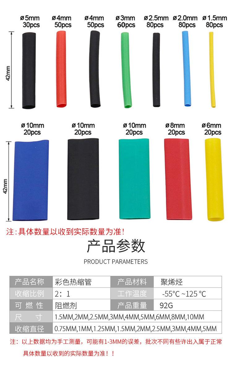 Los parámetros de los tubos termorretráctiles de 530 piezas son los siguientes: