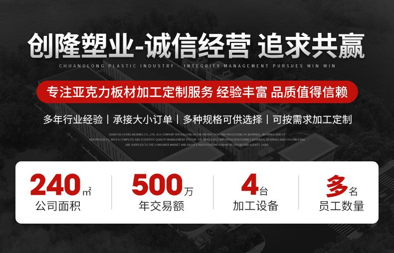 Introducción del material Las principales características de los materiales acrílicos se explican a continuación: Para láminas de acrílico domésticas en industrias generales, 1MM 2MM 3MM 4MM 5MM 6MM 8MM 10MM 20MM 30MM. Generalmente, las láminas reales serán más delgadas, 0,1-0,5MM, y el error de tamaño de corte por láser está dentro de 0,1-0,3MM. ¡Los clientes altos deben contactar primero con el servicio al cliente! Instrucciones para el cliente: 1. Tamaño: El tamaño de la placa de acrílico en stock es: 1,2 metros * 1,8 metros, 1,2 * 2,4 metros, 2 metros * 3 metros, 1,6 metros * 3 metros. El tamaño máximo de corte se puede cortar dentro de estos tamaños. El tamaño general de entrega exprés es de 1000 mm * 1000 mm (el tamaño real depende de las diferentes regiones, consulte con el servicio al cliente para obtener más detalles). Los tamaños más grandes requieren logística.