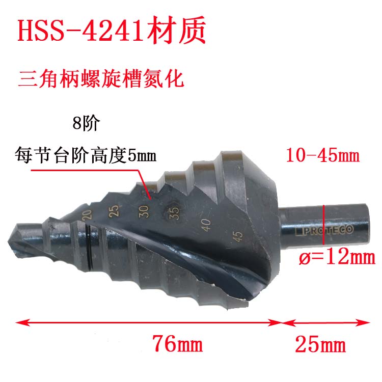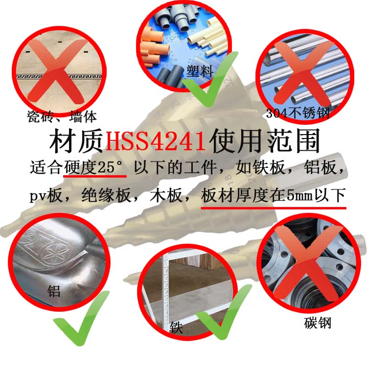 Material: Acero de alta velocidad 4241 (adecuado para piezas de trabajo con una dureza inferior a 25°, como acero al carbono, placa de hierro delgada, placa de aislamiento, placa de PVC, placa de madera, espesor de placa inferior a 5 mm)