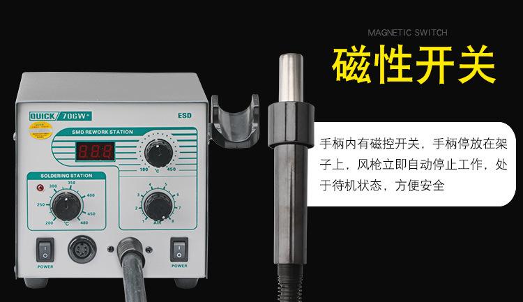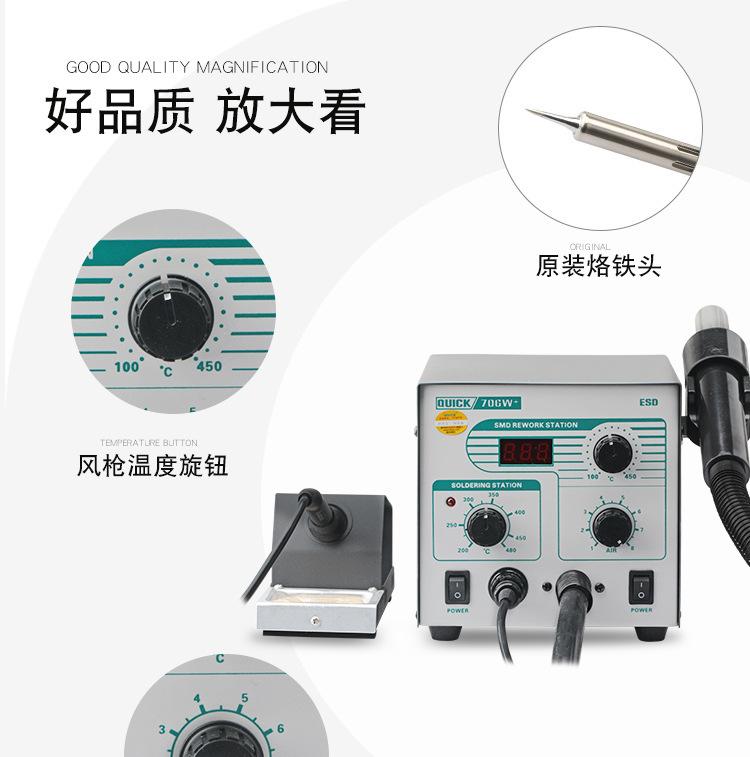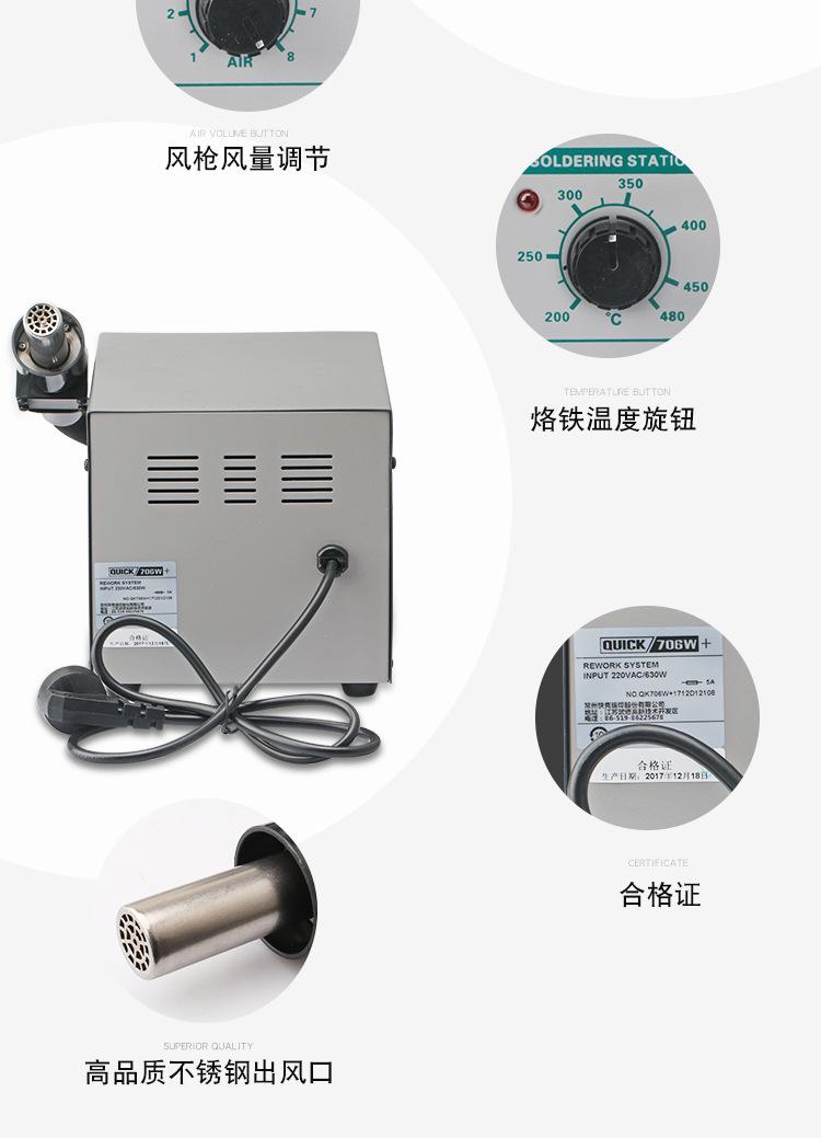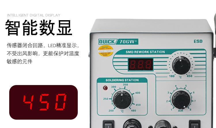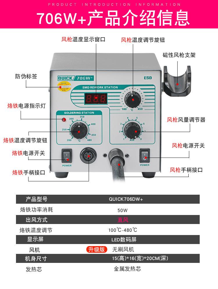 (4) Tamaño pequeño y diseño de doble estación, ocupando una pequeña superficie de trabajo, especialmente adecuado para el desensamblaje y soldadura de placas de circuito sin plomo. Consumo de energía del soldador 50W Rango de temperatura 200--480 grados Consumo de energía de la pistola de aire 580W Tipo de flujo de aire: aire suave giratorio Flujo de aire: 10 litros/minuto (máximo) Forma de visualización de la temperatura: pantalla digital LED (resolución 1 grado) Rango de ajuste de temperatura: 100--450 grados
