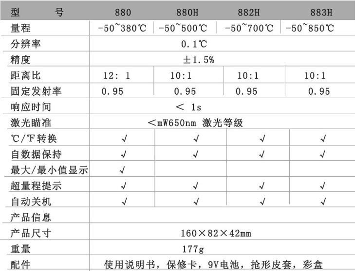 Dt-880v*-50~380℃*±1.5%*0.1℃*infrared thermometer*160*82*42*177g, Dt-880h-v*-50~380 ℃ *±1.5%*0.1 ℃ *infrared th...