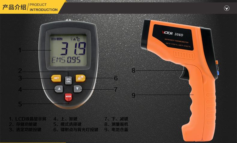 Termómetro infrarrojo de alta precisión Victory VC308D pistola de temperatura de grado industrial termómetro infrarrojo portátil de alta temperatura