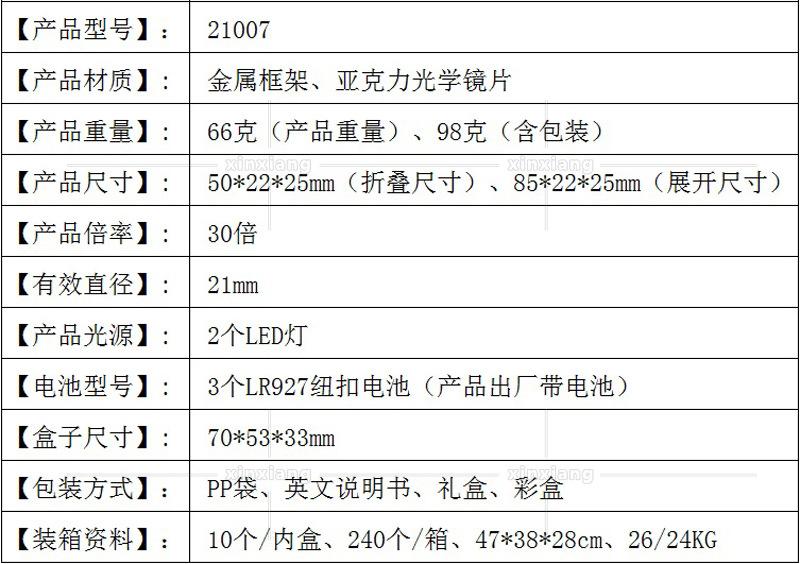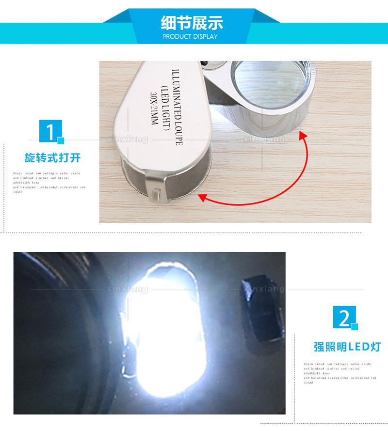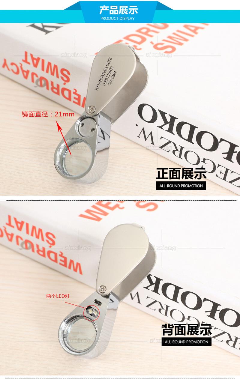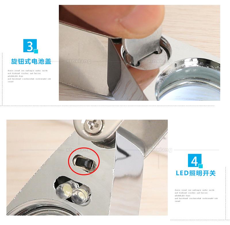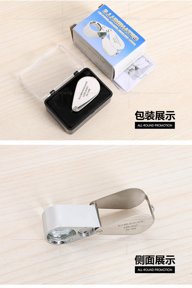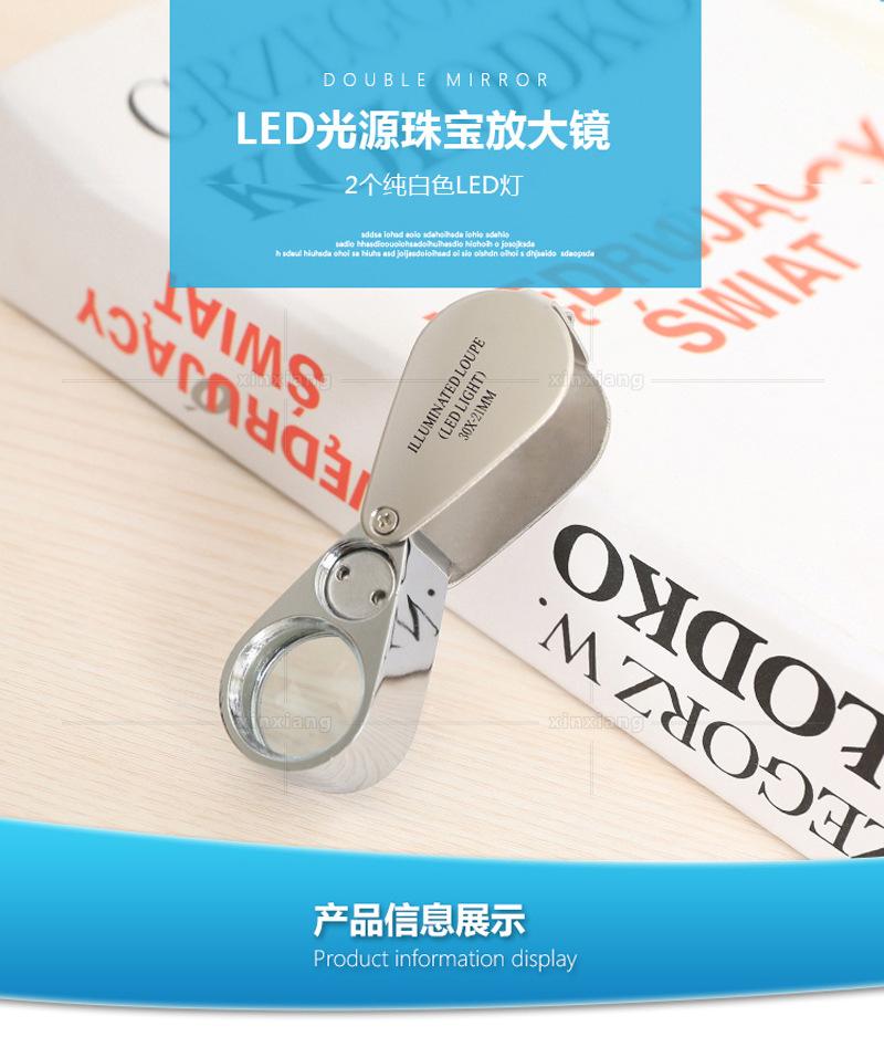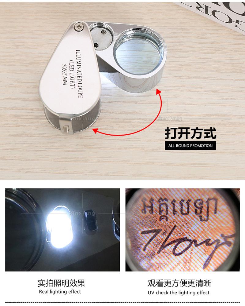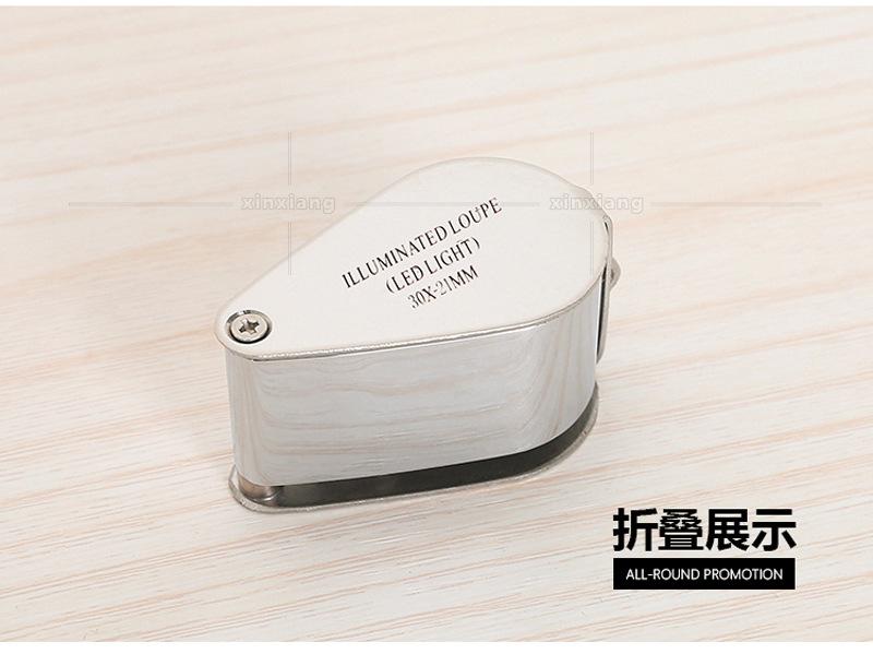 Espejo de joyería de identificación plegable totalmente metálico de 21 mm, 30 veces, luz LED de acero inoxidable, lupa de jade con diamante antiguo