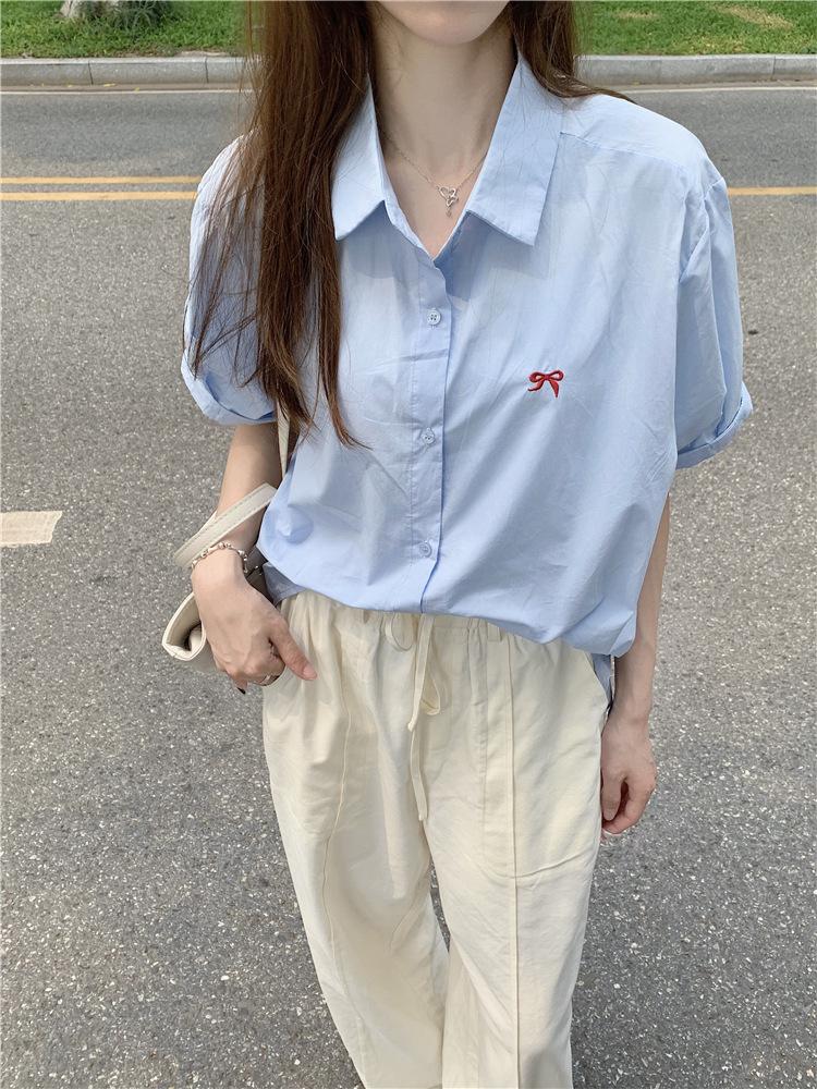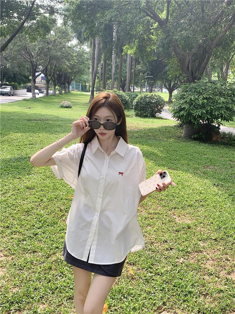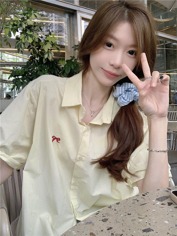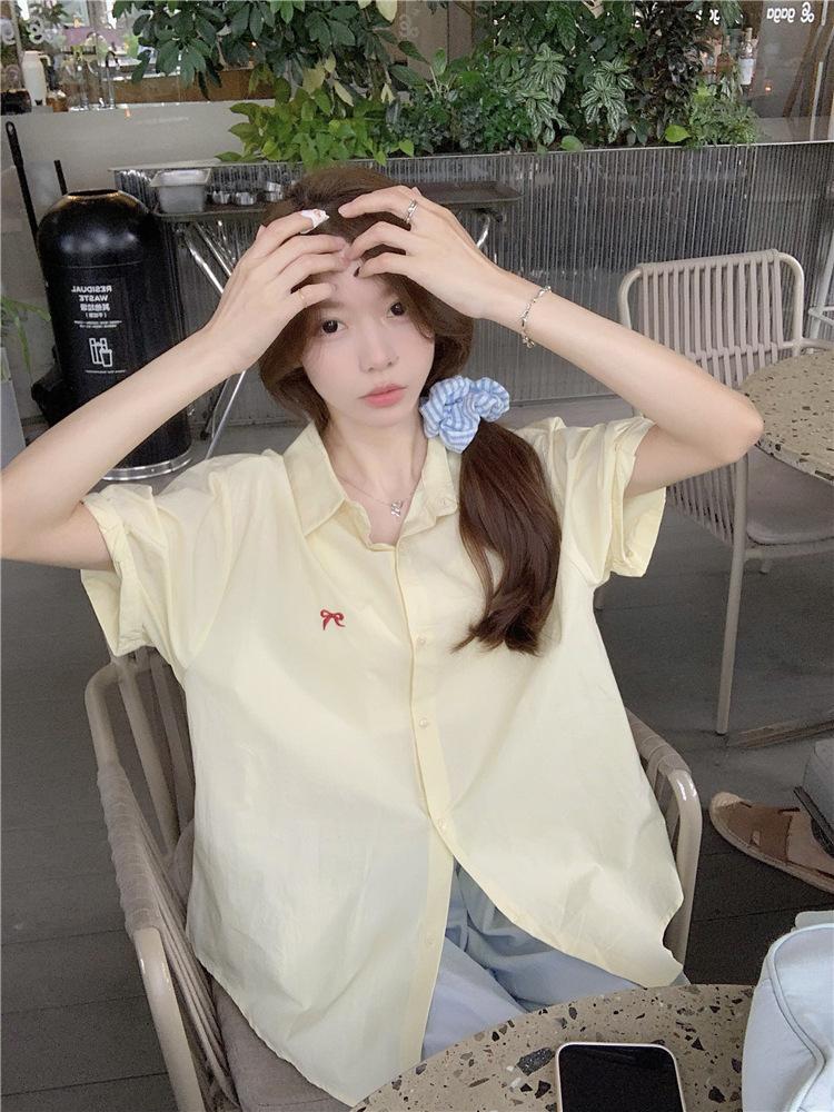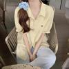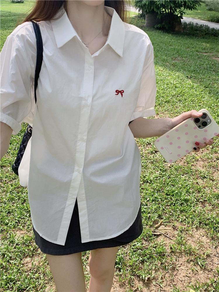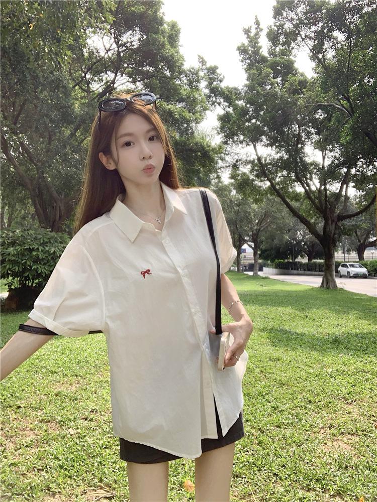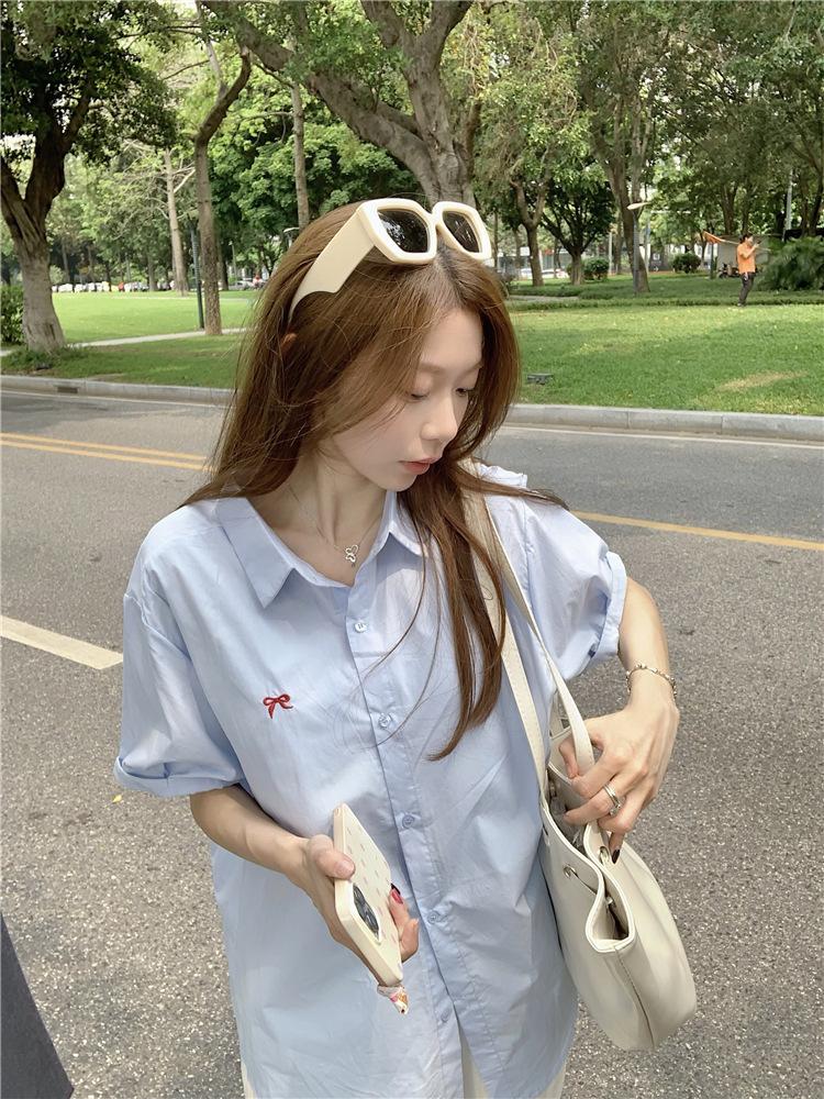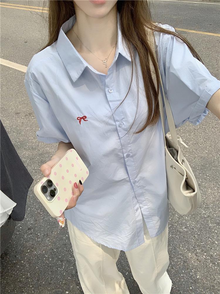 Dai Jiawen 2024 Diseño Polo Cuello Camisa de Manga Corta Abrigo Top de Largo Medio Bordado con Lazo para Mujer Verano