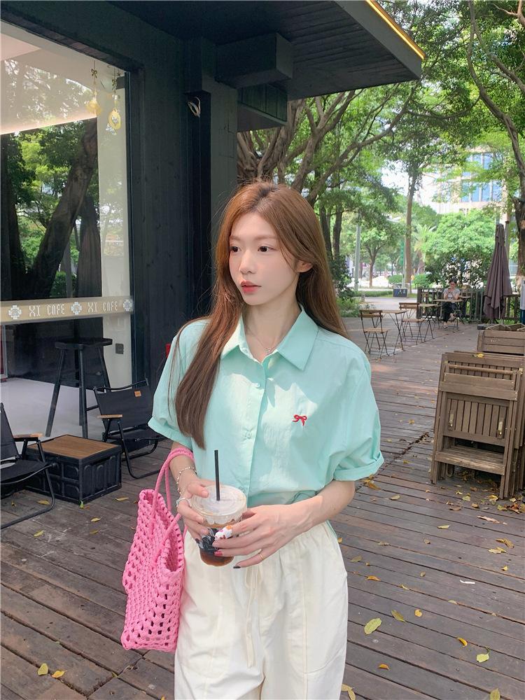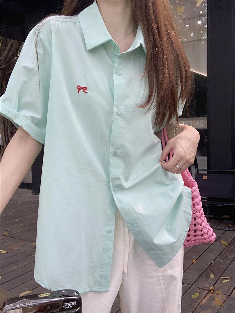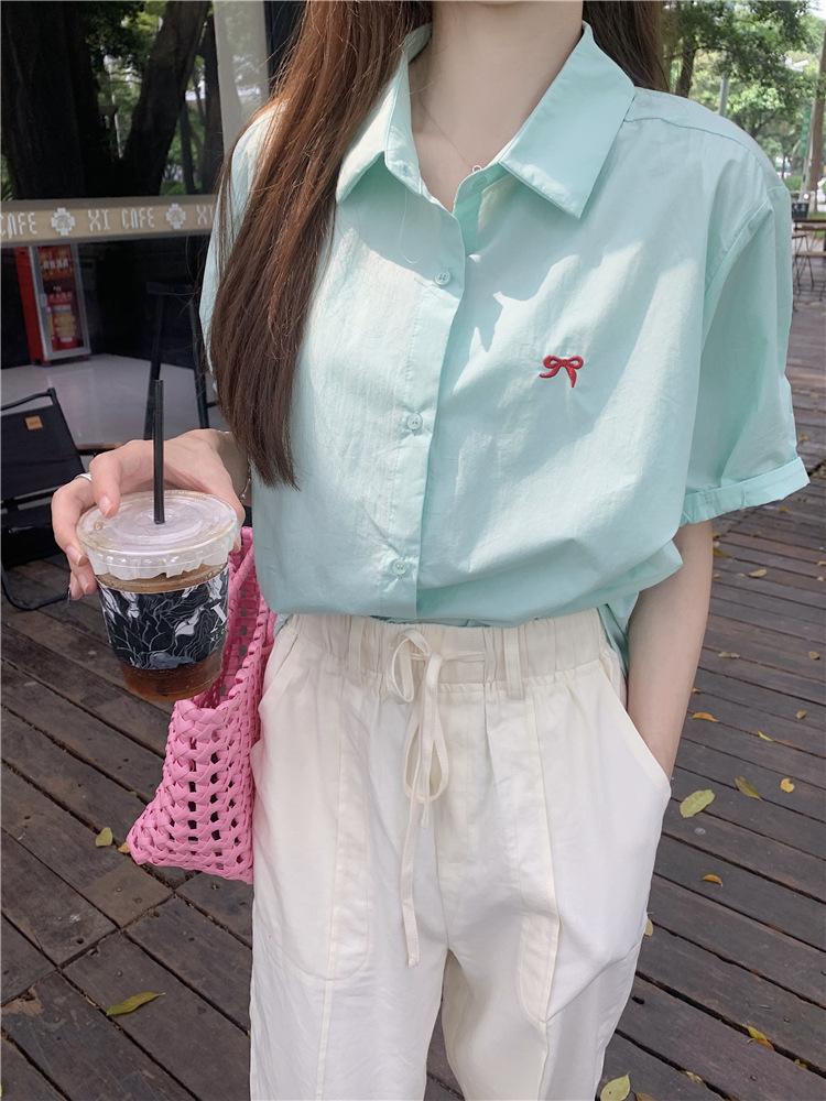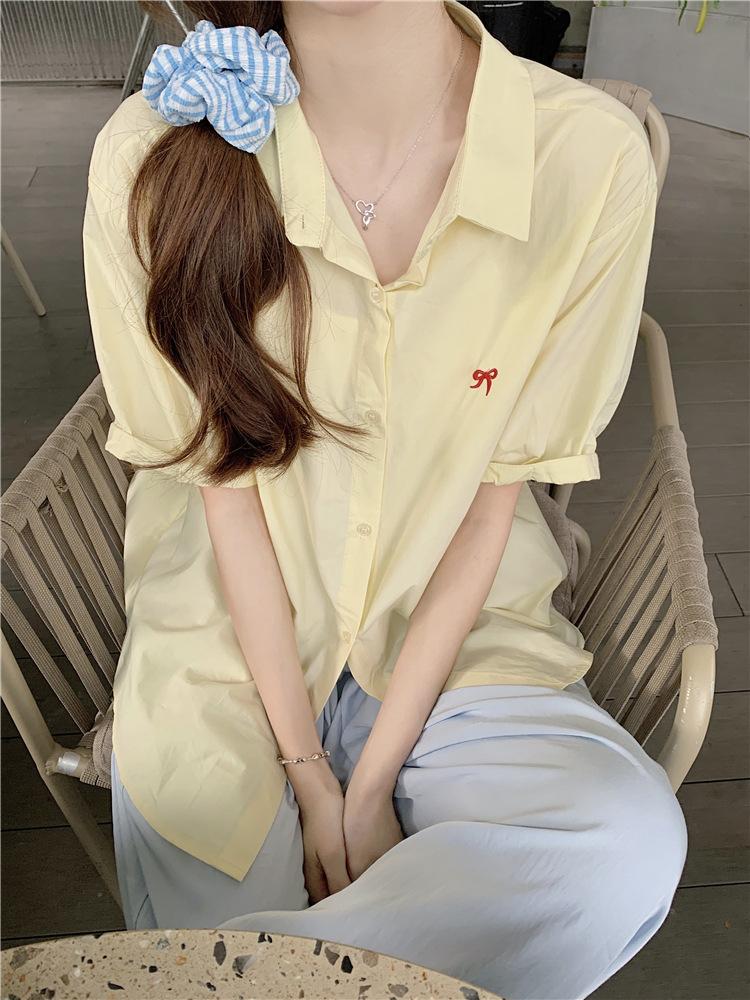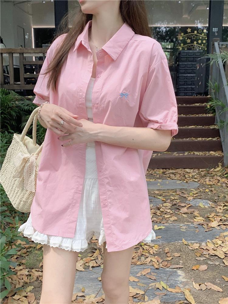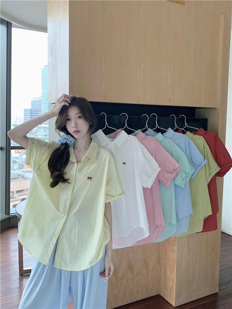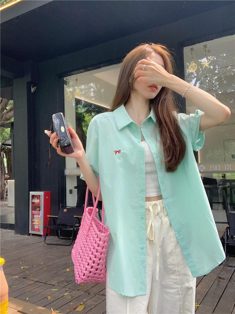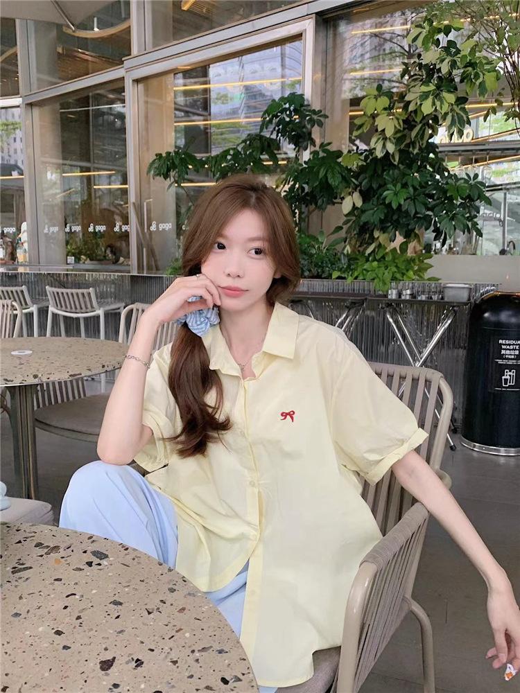 Dai Jiawen 2024 Diseño Polo Cuello Camisa de Manga Corta Abrigo Top de Largo Medio Bordado con Lazo para Mujer Verano
