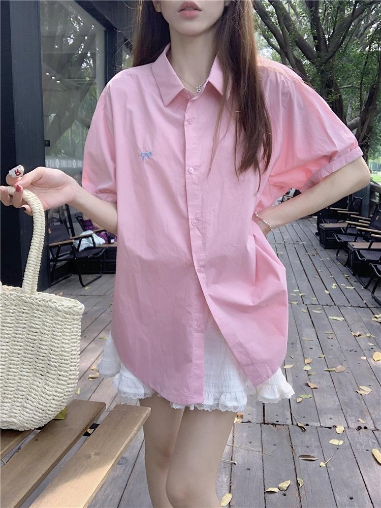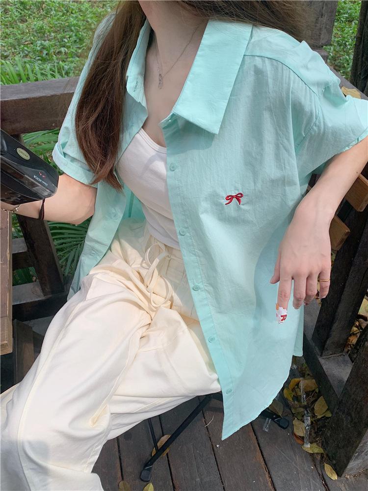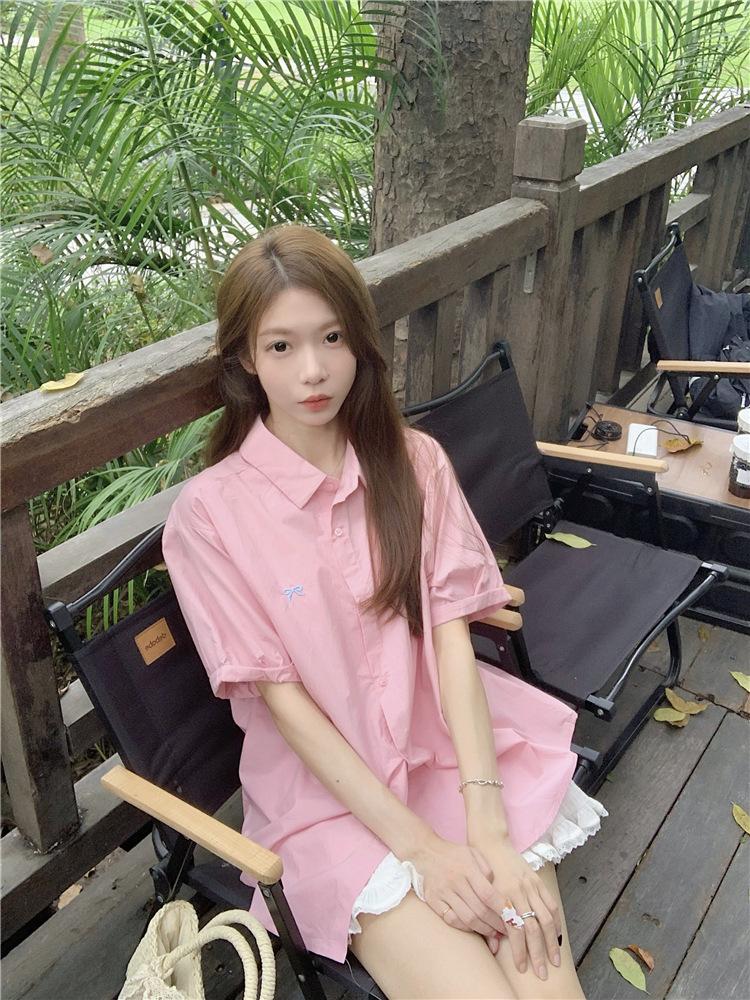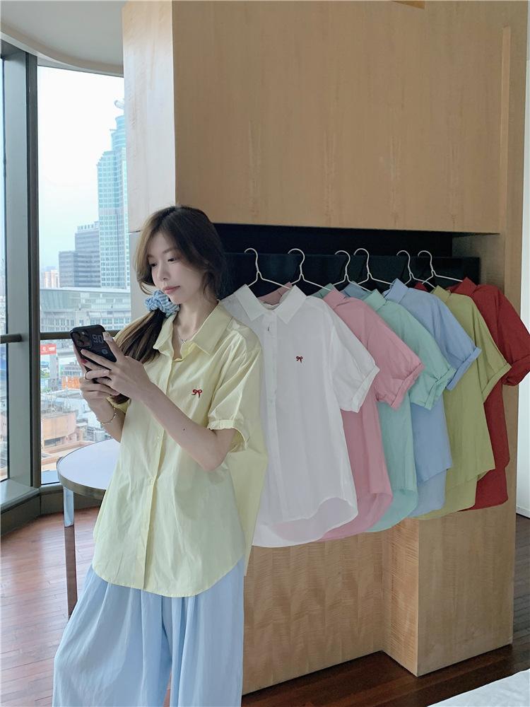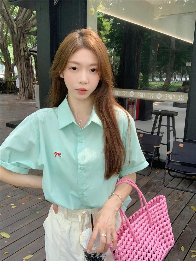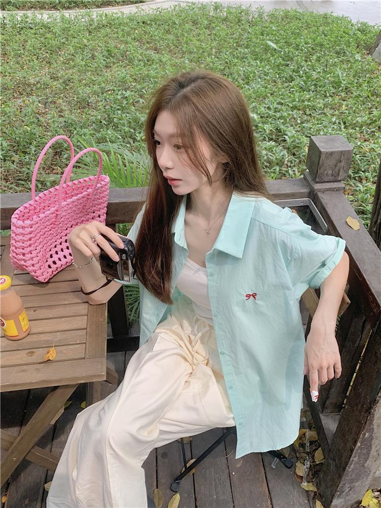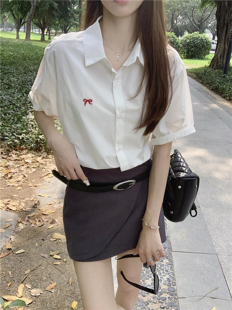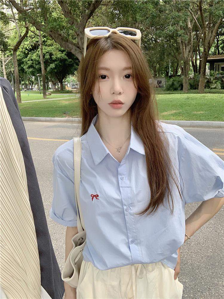 Dai Jiawen 2024 Diseño Polo Cuello Camisa de Manga Corta Abrigo Top de Largo Medio Bordado con Lazo para Mujer Verano