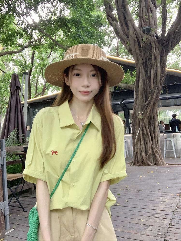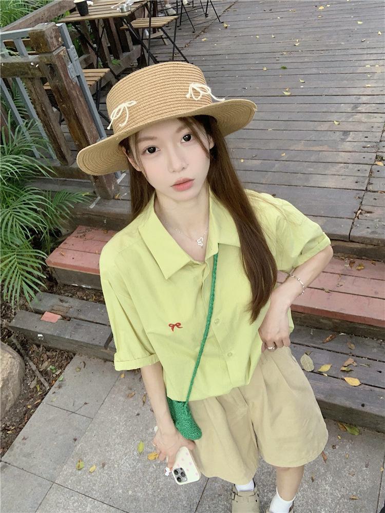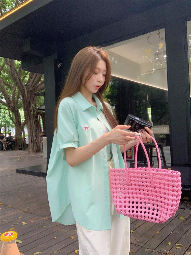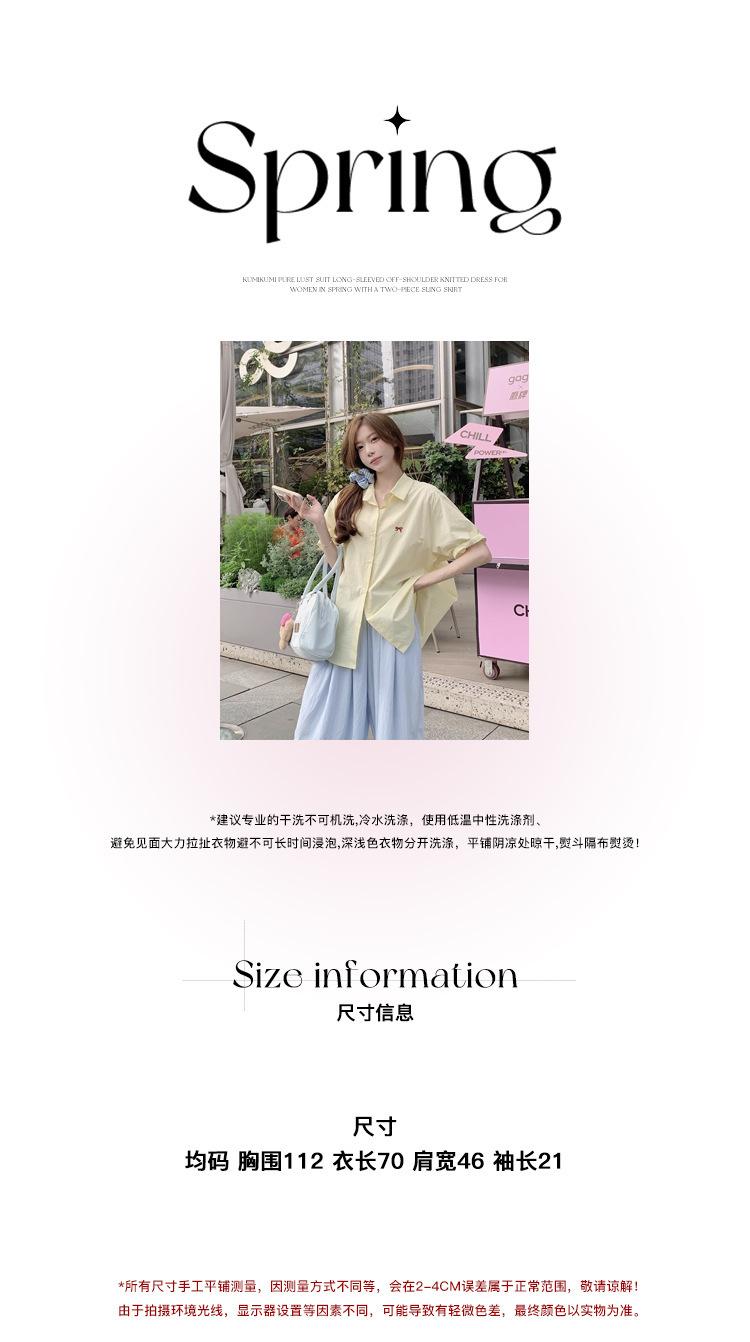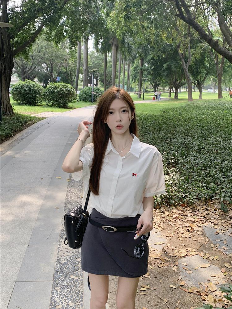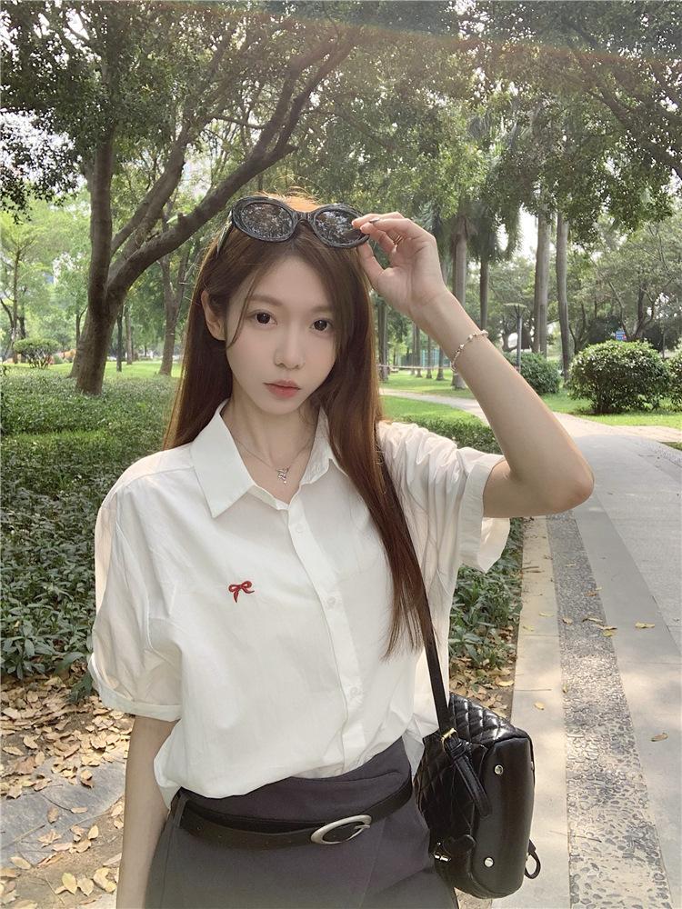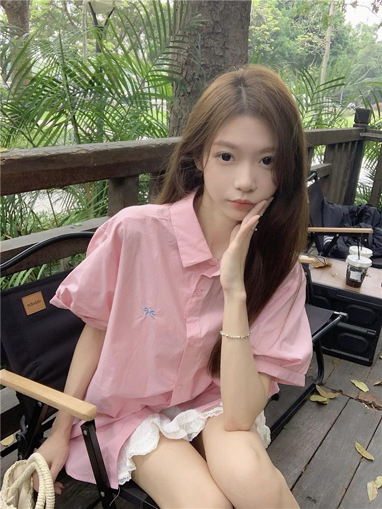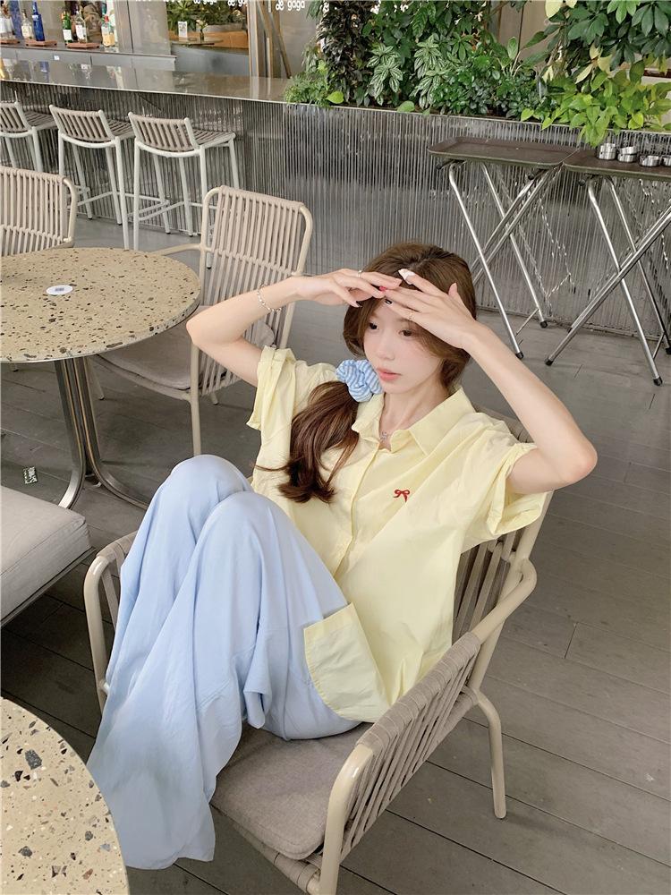 Dai Jiawen 2024 Diseño Polo Cuello Camisa de Manga Corta Abrigo Top de Largo Medio Bordado con Lazo para Mujer Verano