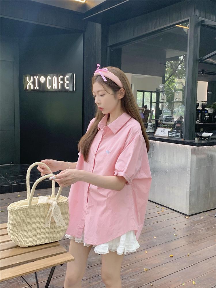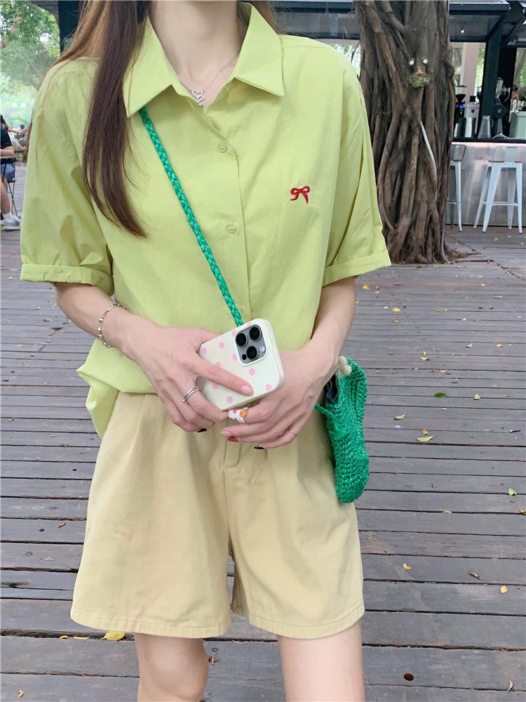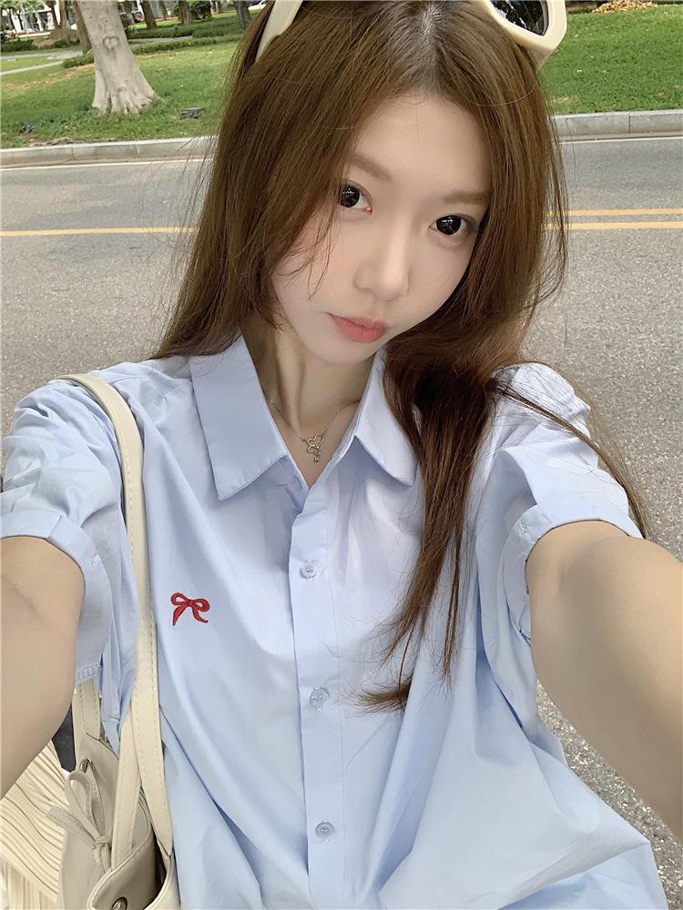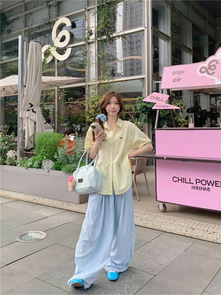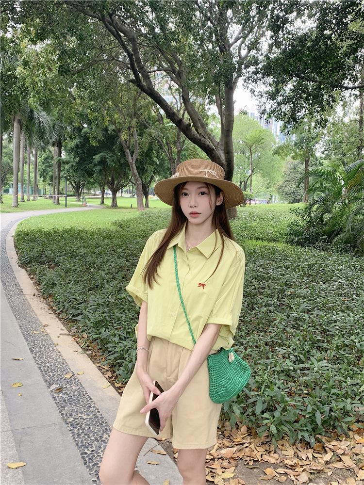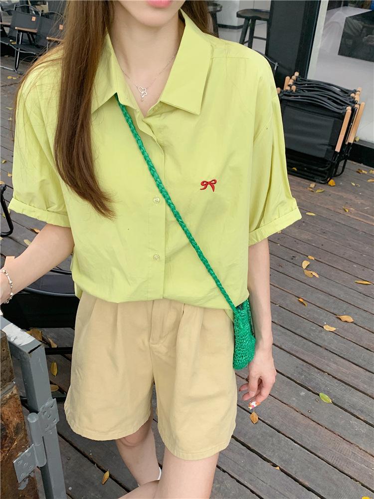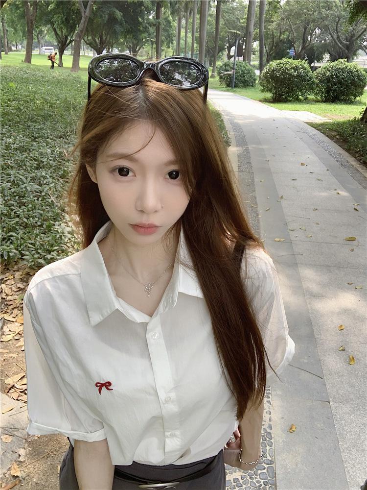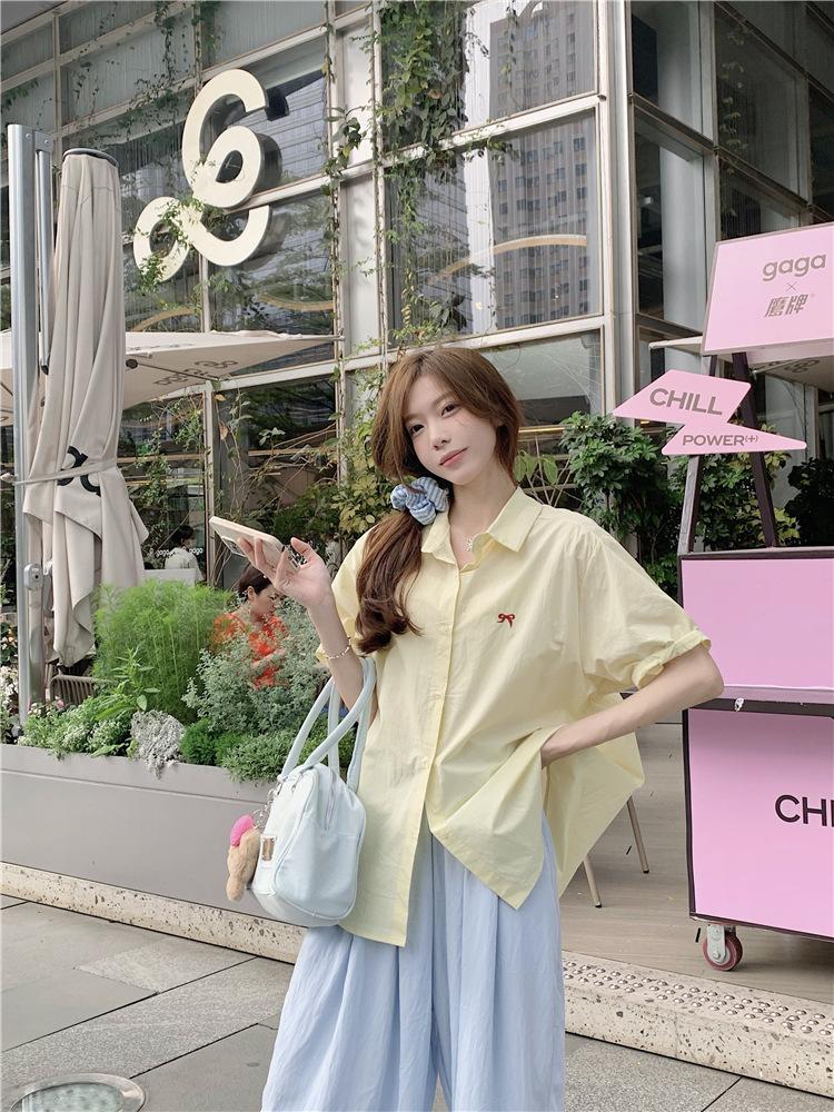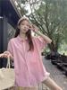 Dai Jiawen 2024 Diseño Polo Cuello Camisa de Manga Corta Abrigo Top de Largo Medio Bordado con Lazo para Mujer Verano