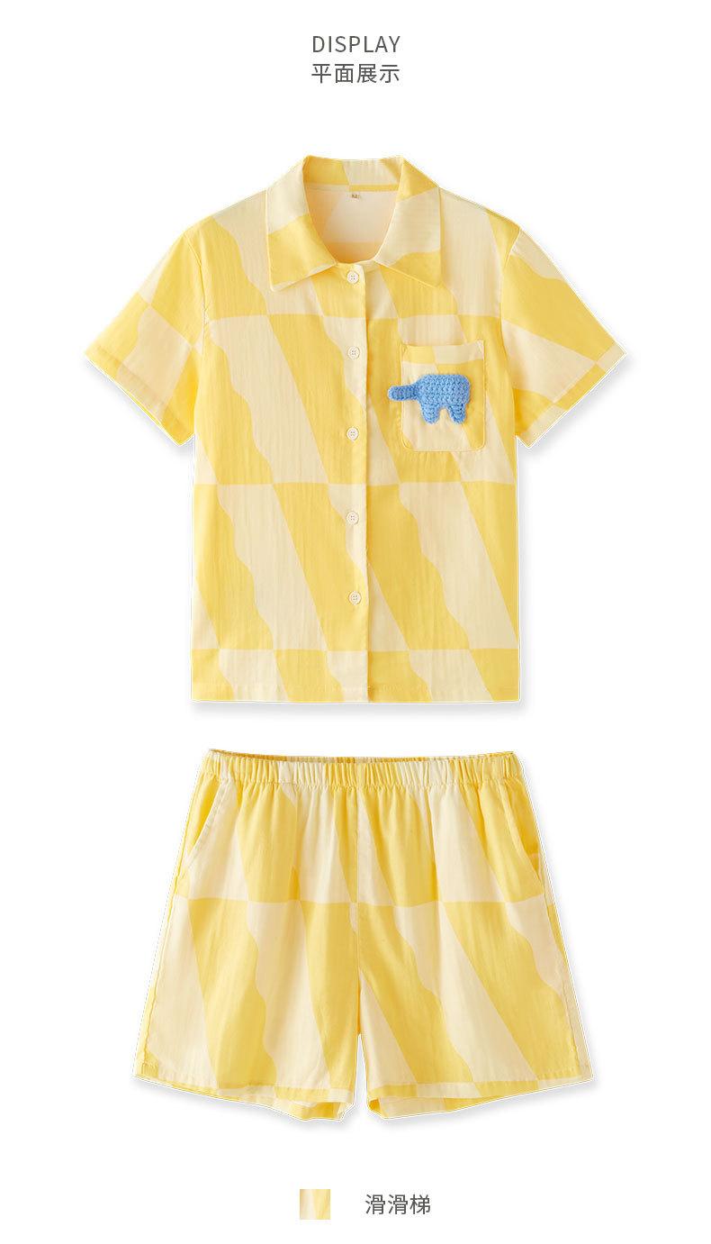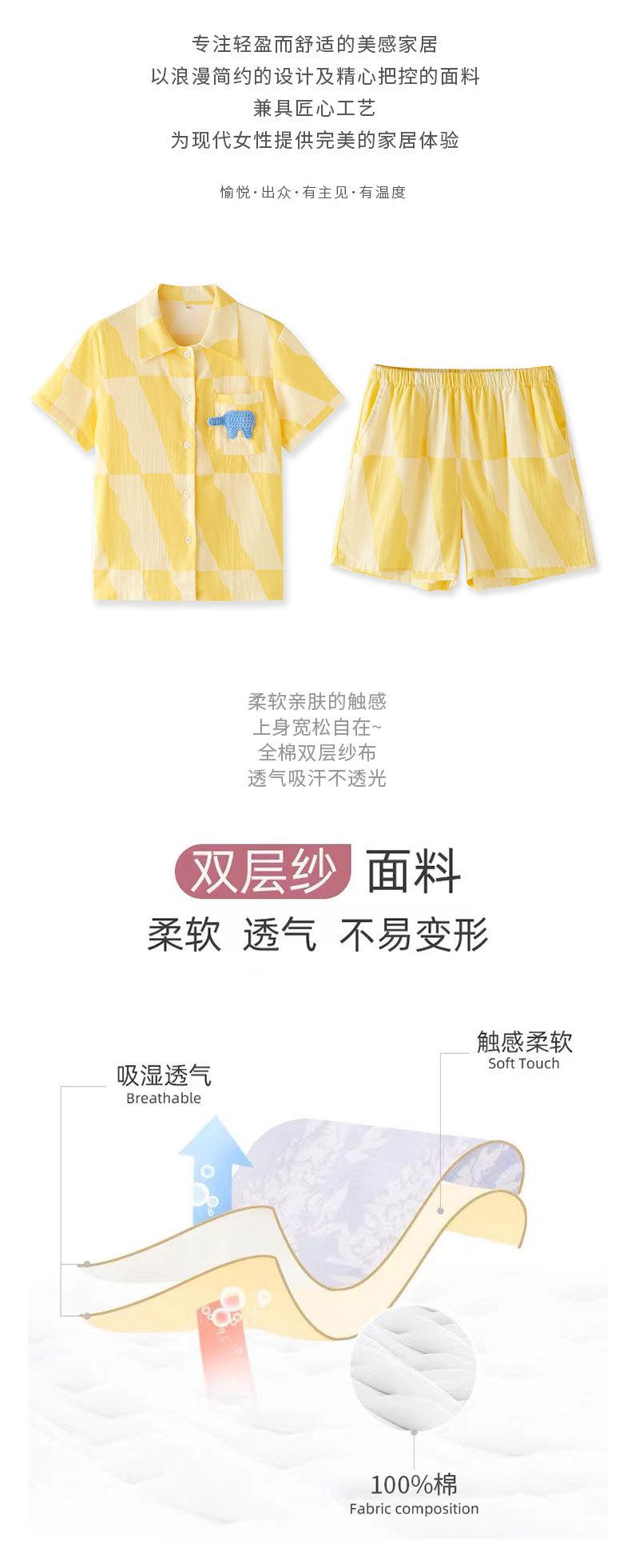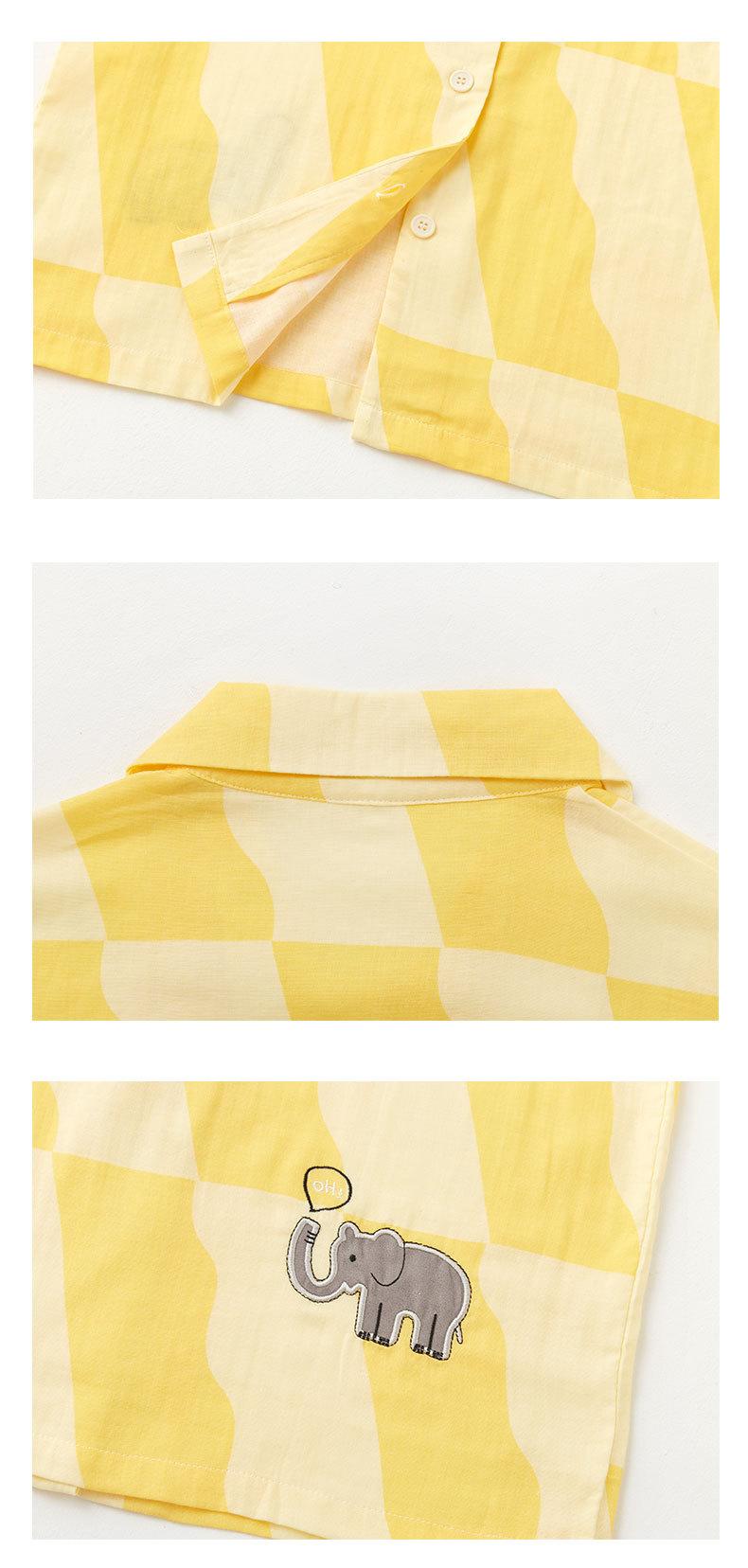 Nuevo Algodón Gasa Doble Capa Solapa Bolsillo Ropa para el Hogar Pijama de Manga Corta Bordado de Elefante de Dibujos Animados