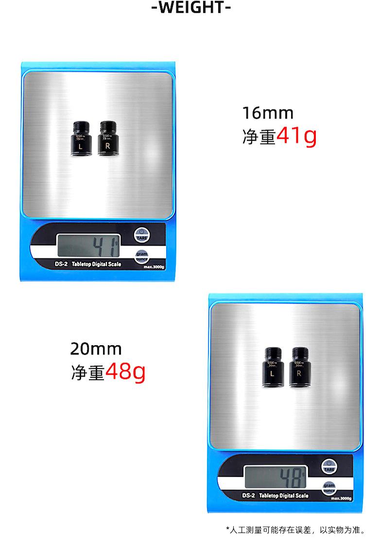 Peso: 16mm (43g/par), 20mm (aproximadamente 48g/par)