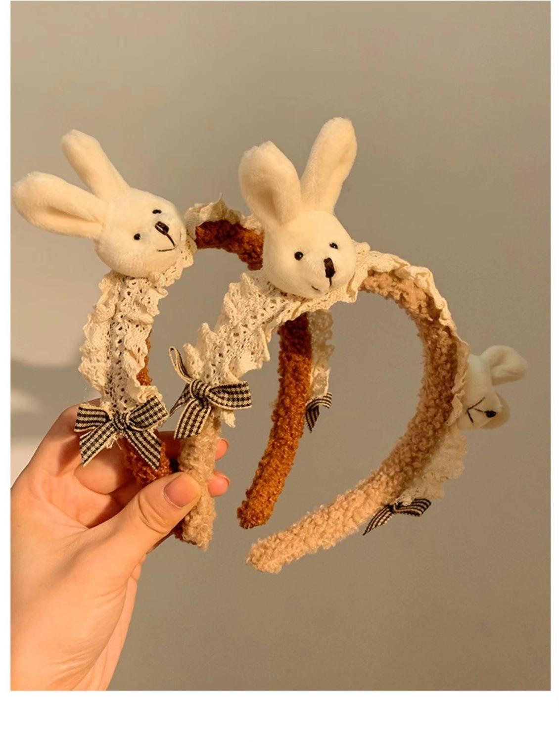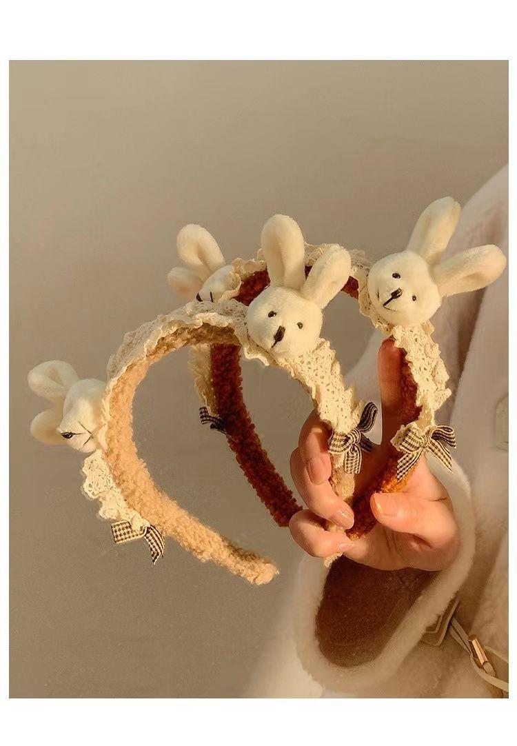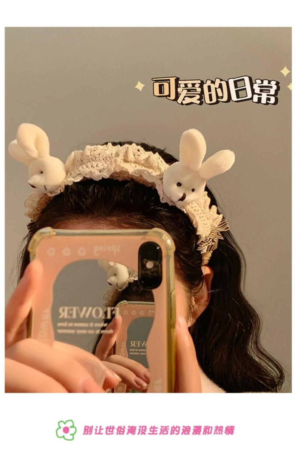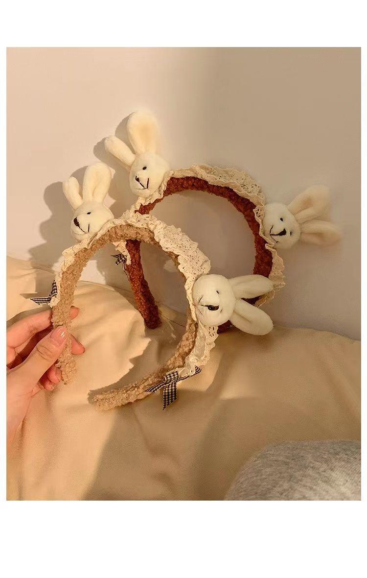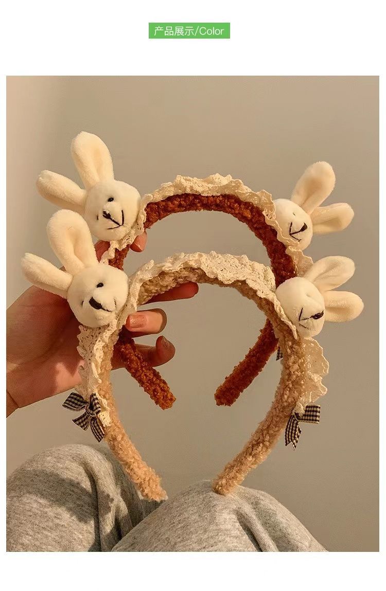 Diadema de felpa suave y linda con lazo de encaje de conejo para niñas Lolita, máscara para lavar la cara, horquilla diadema