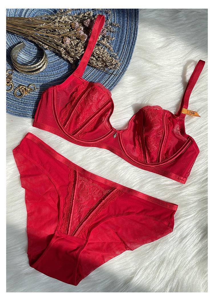 Conjunto de sujetador de media copa, sexy, de encaje, ultrafino, transparente, sin relleno