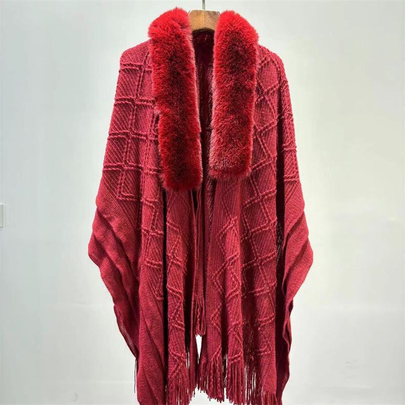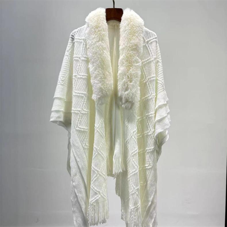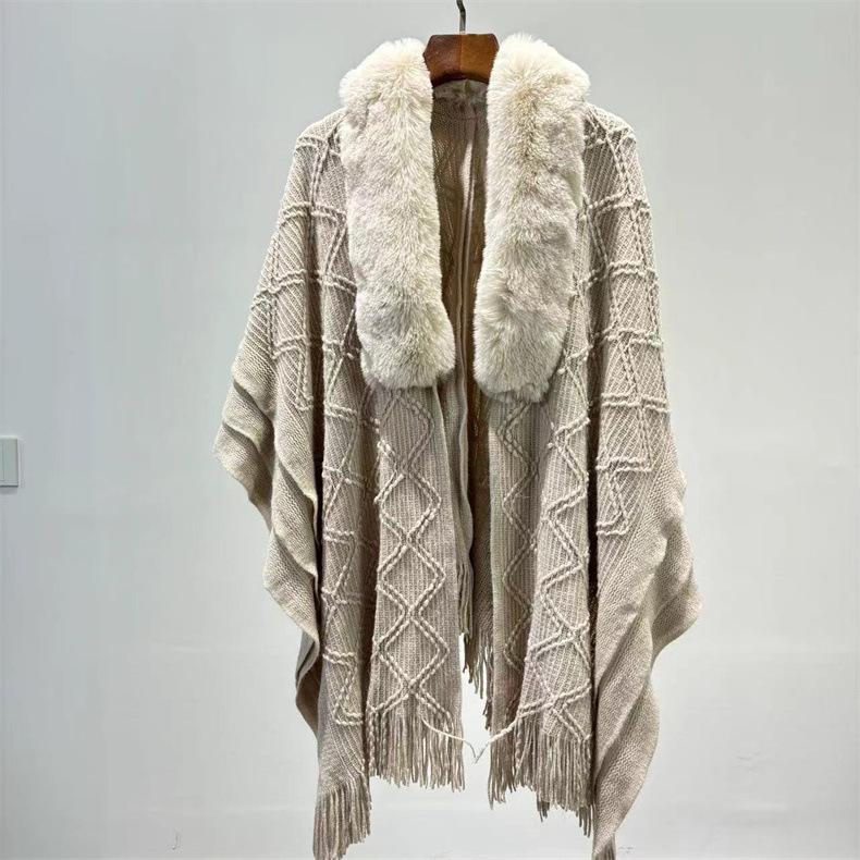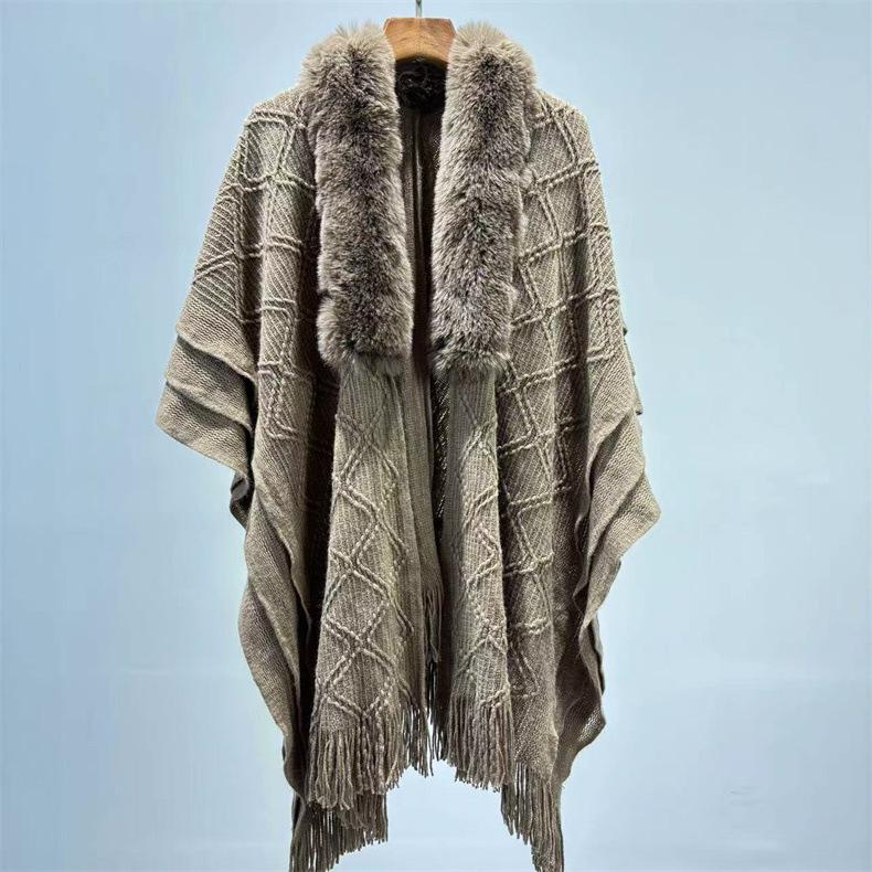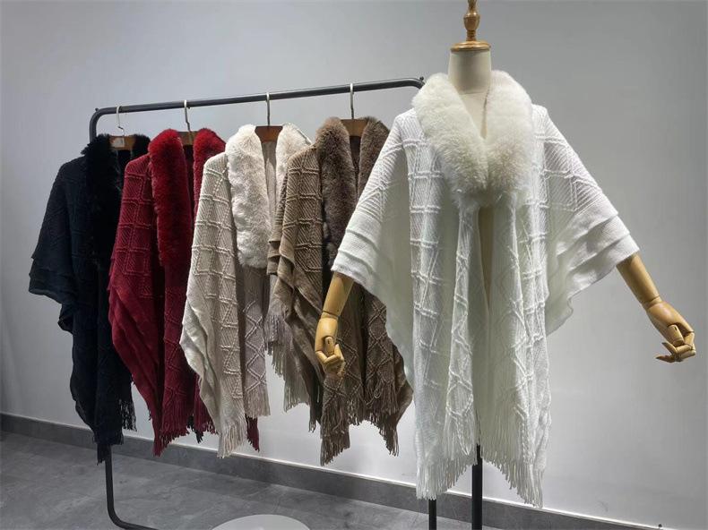 Venta al por mayor 24 otoño e invierno nuevo abrigo tipo capa europeo y americano holgado chal con flecos moda comodín cuello grande de piel suéter