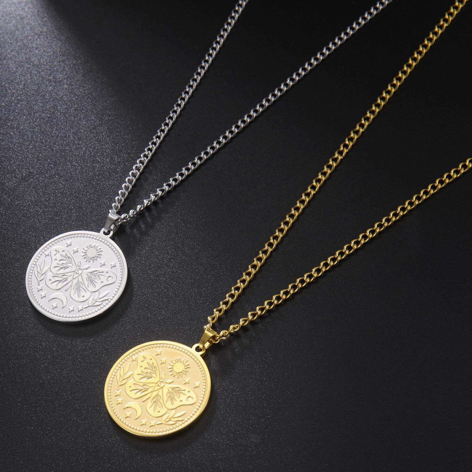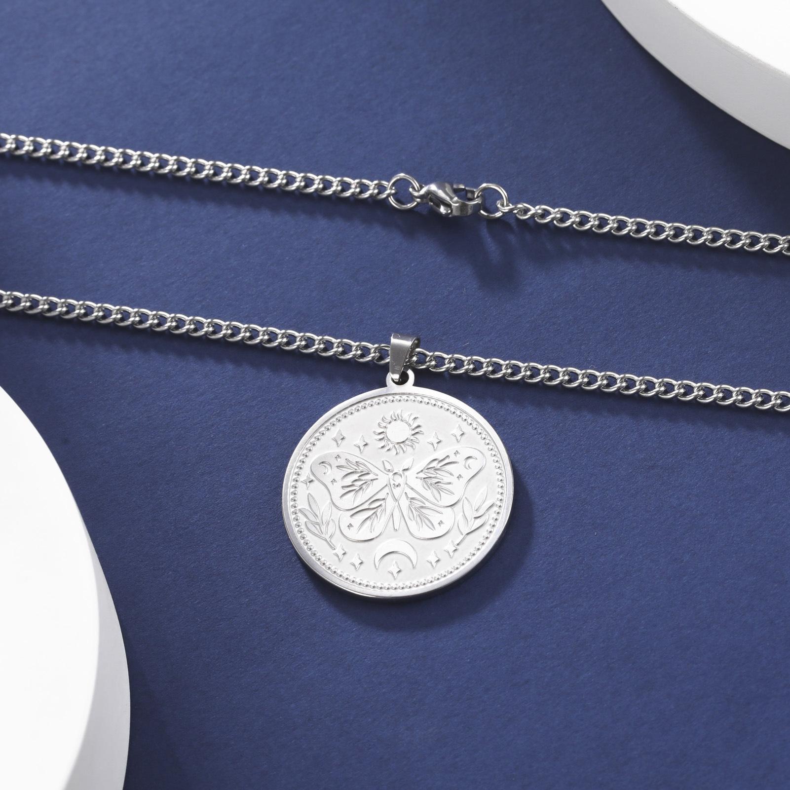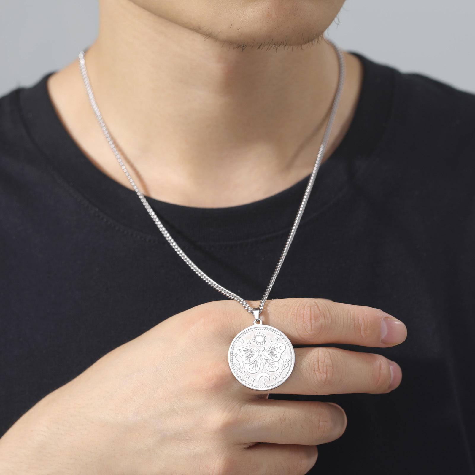 Collar de acero de titanio para hombre, cadena de suéter de moda de invierno, con diseño de mariposa, sol y luna, de marca europea y americana, con combinación de estilo redondo sólido
