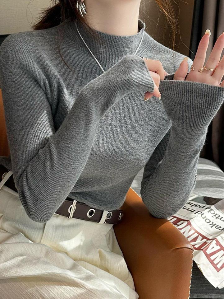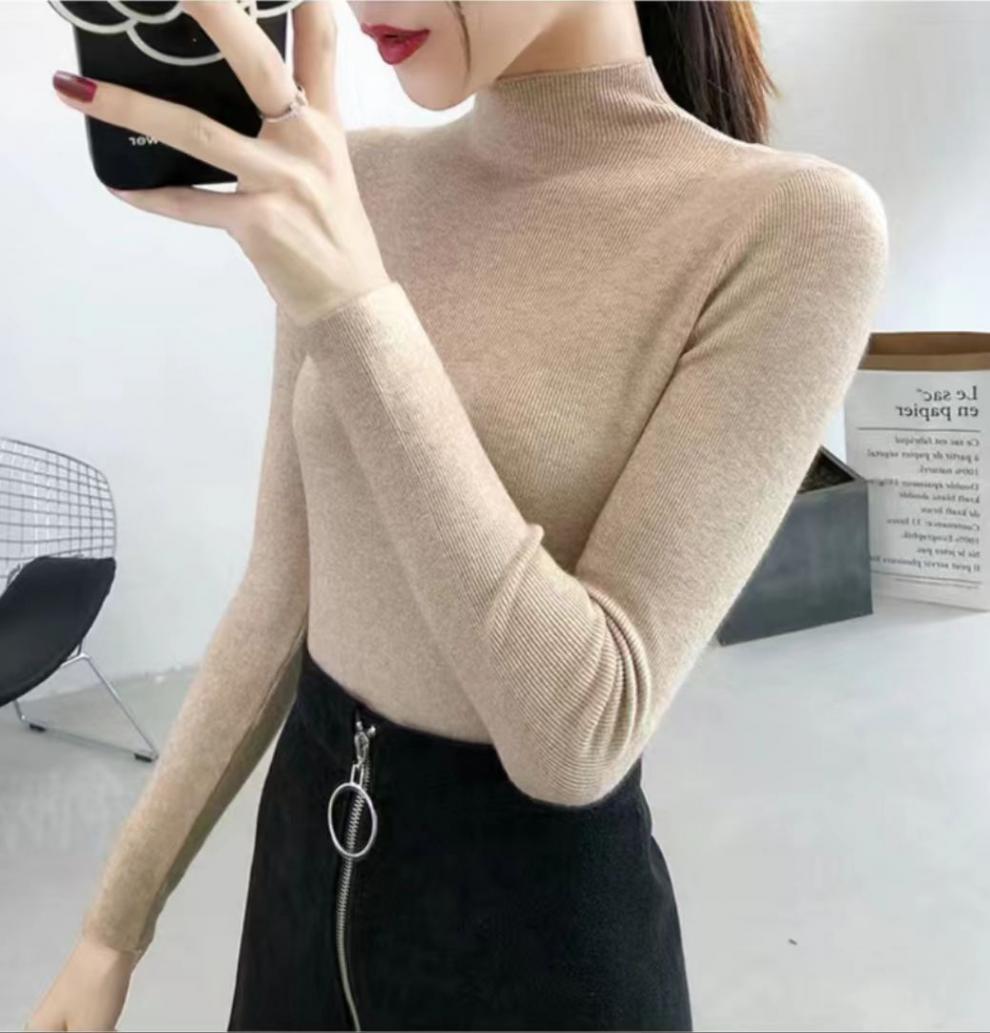 Suéter ajustado de cuello alto medio color café para mujer, suéter interior de estilo occidental de otoño e invierno, camisa ajustada versátil para mujer