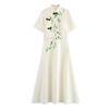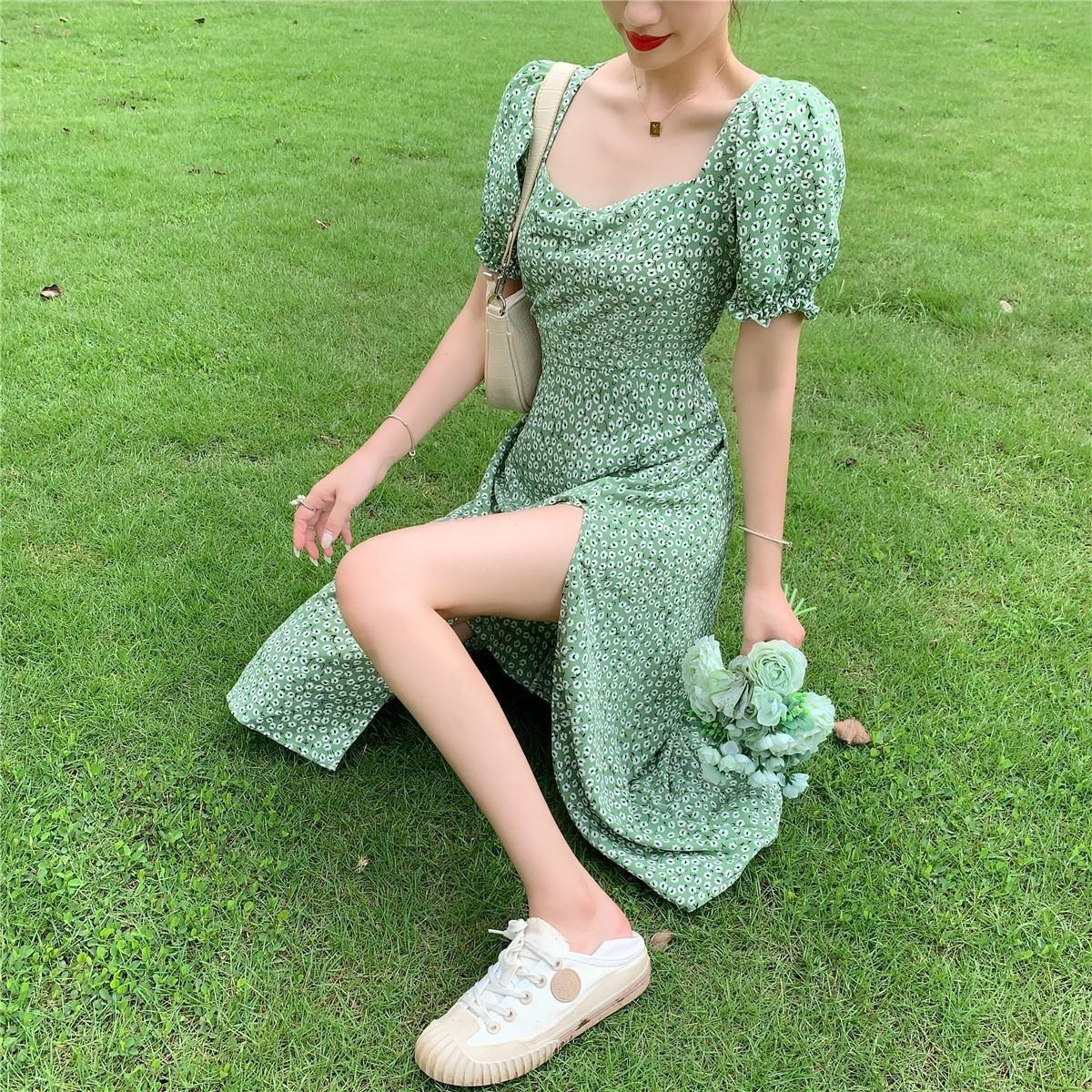 Vestido floral con cuello cuadrado francés transfronterizo para mujer, novedad de verano 2024, falda elegante de manga corta con abertura y adelgazamiento a la moda