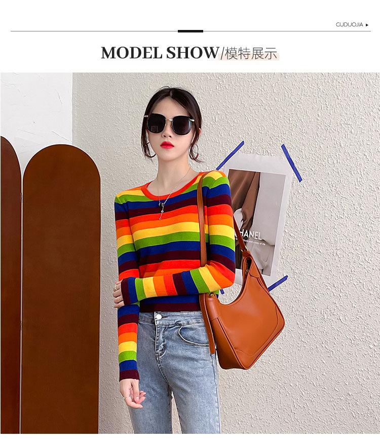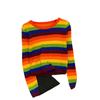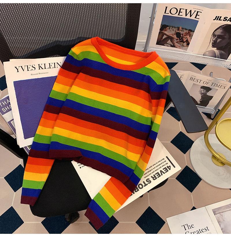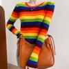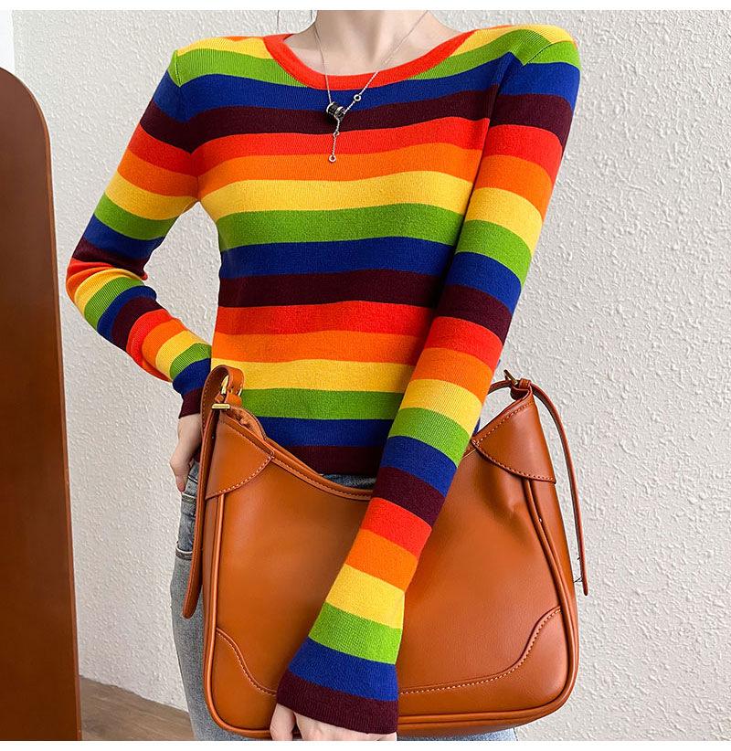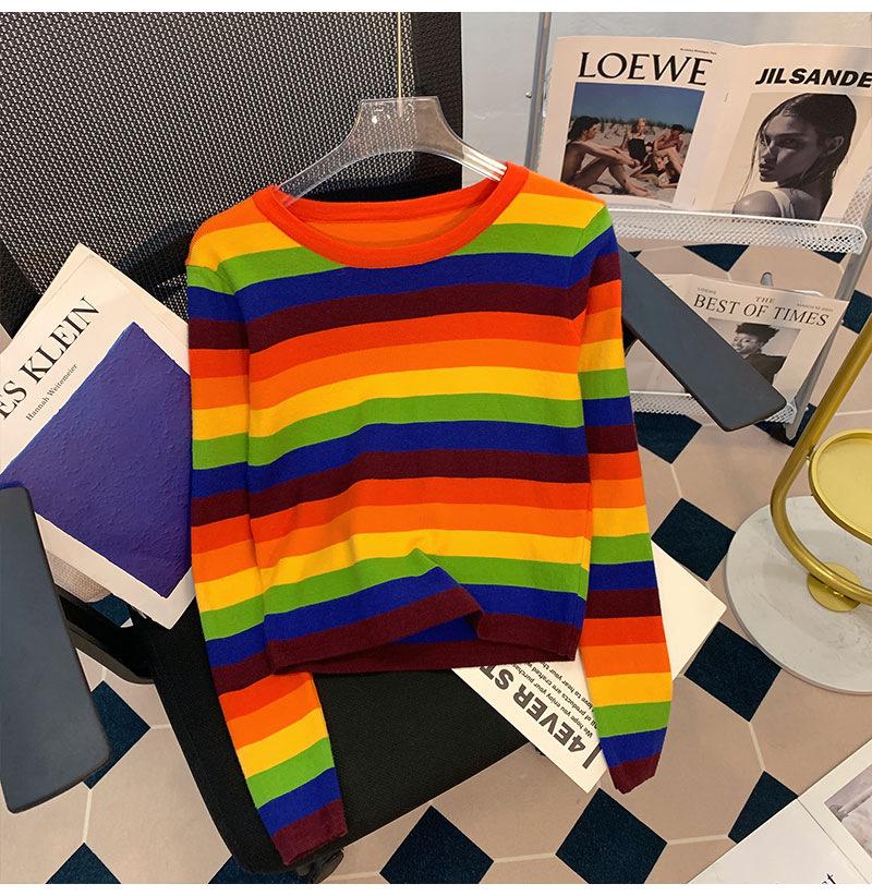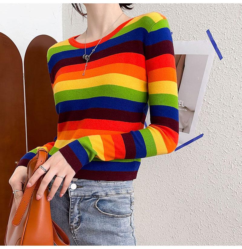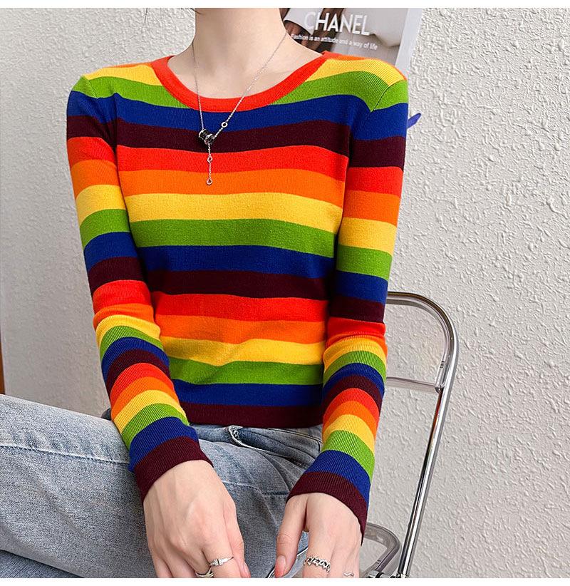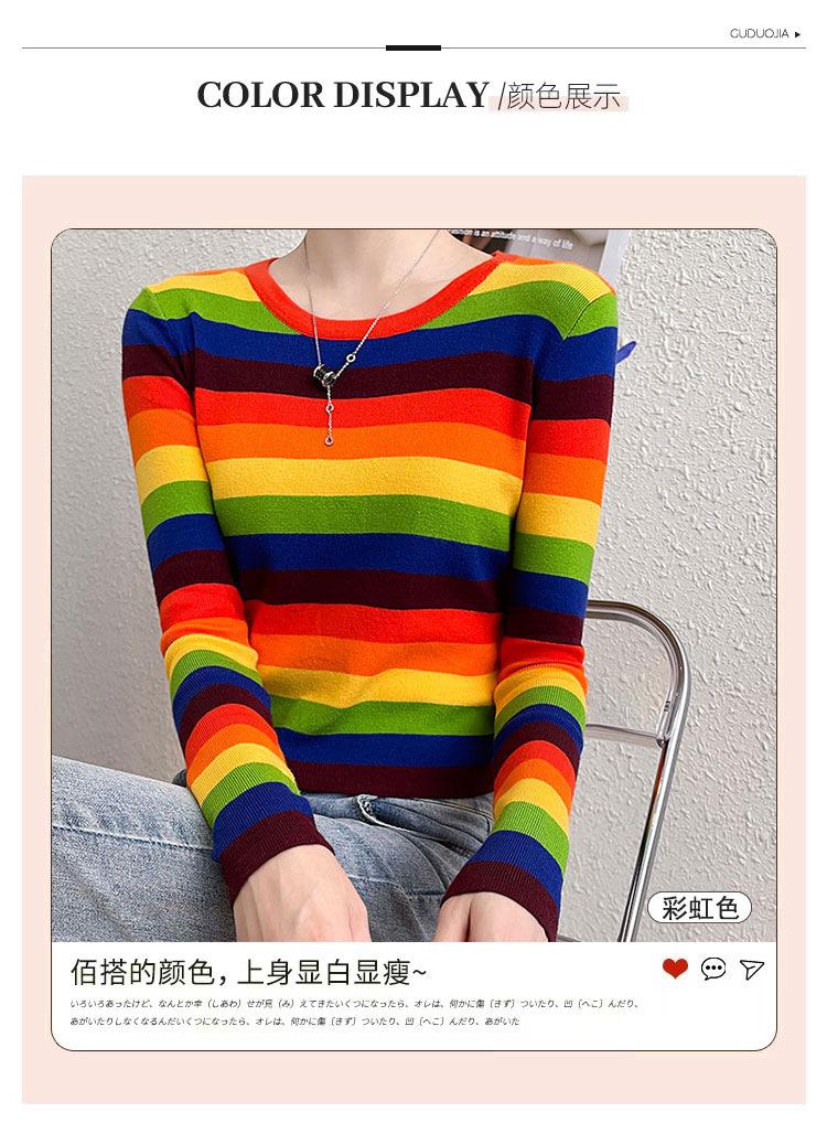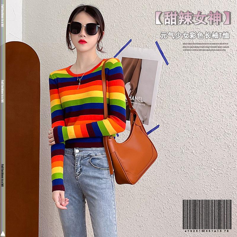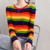 Suéter de Punto Fondo Camiseta de Manga Larga para Mujer Delgada Primavera Principios de Otoño Rayas Arcoíris Ropa 2025 Nuevo Top Corto con Ombligo Descubierto