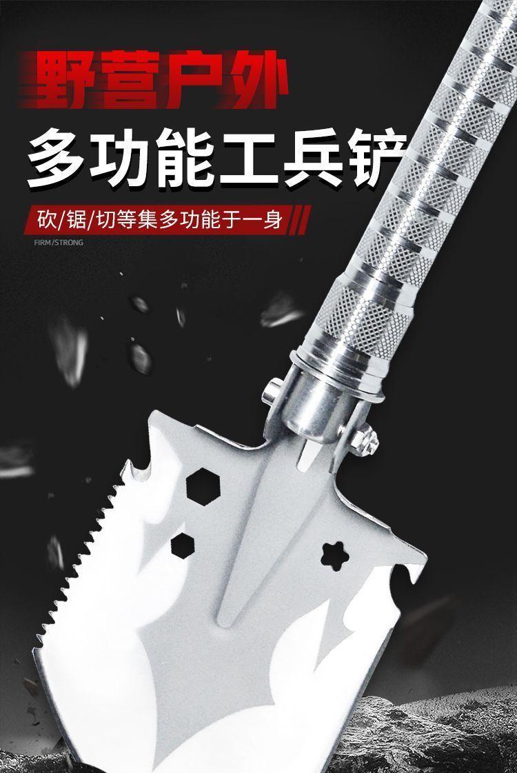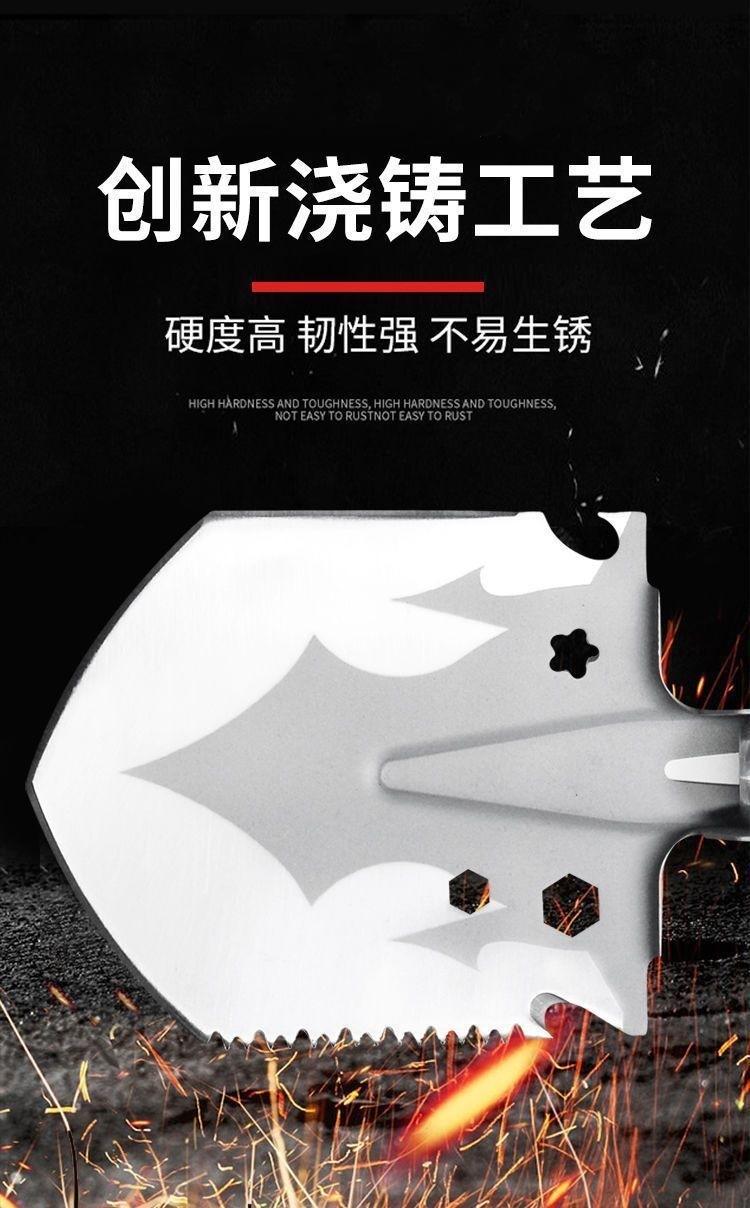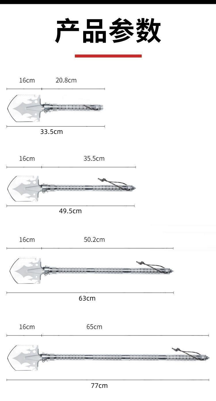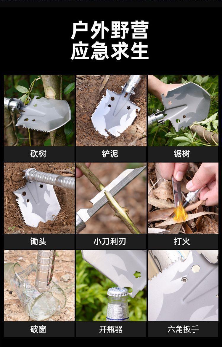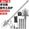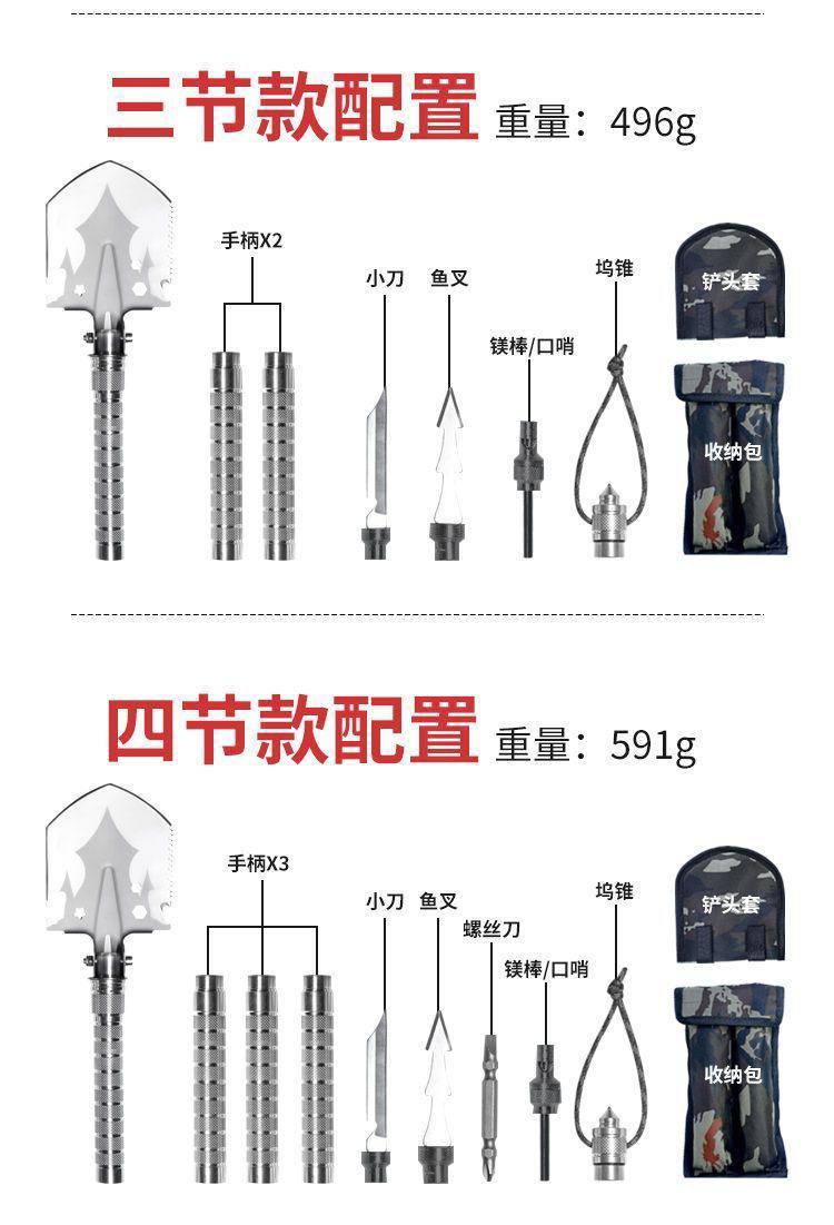 Cuatro sesiones al aire libre: cuatroTubo de unión, cabeza de pala, pedernal, silbato, cuchillo, arpón, destornillador, cono negro, cuerda de mano, cubierta para cabeza de pala, bolsa de almacenamiento (591g)