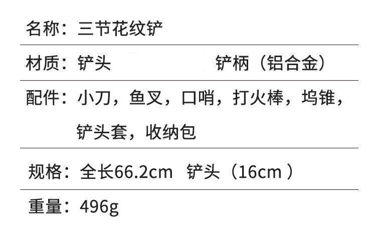 Exterior tres sesiones: tresTubo de sección, cabeza de pala, pedernal, silbato, cuchillo, arpón, cono negro, cuerda de mano, funda para cabeza de pala, bolsa de almacenamiento (4960g)
