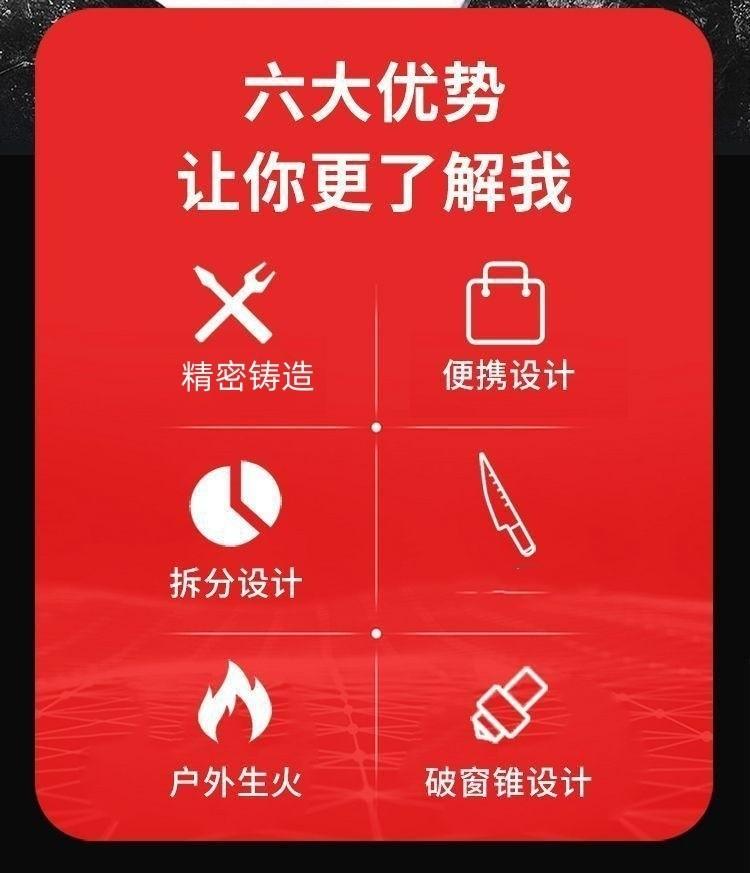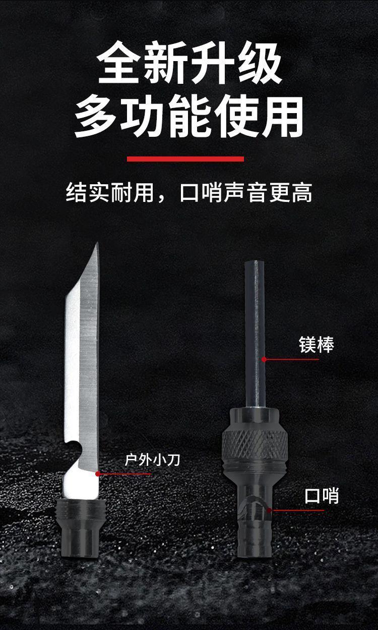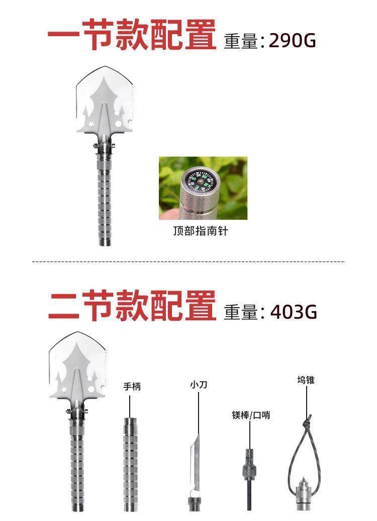 Exterior de dos secciones: tubo de dos secciones, cabeza de pala, pedernal, silbato, cuchillo, cono negro, cuerda de mano (403g)
