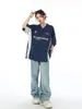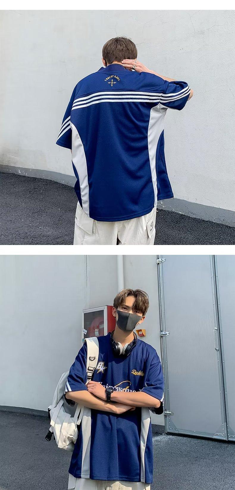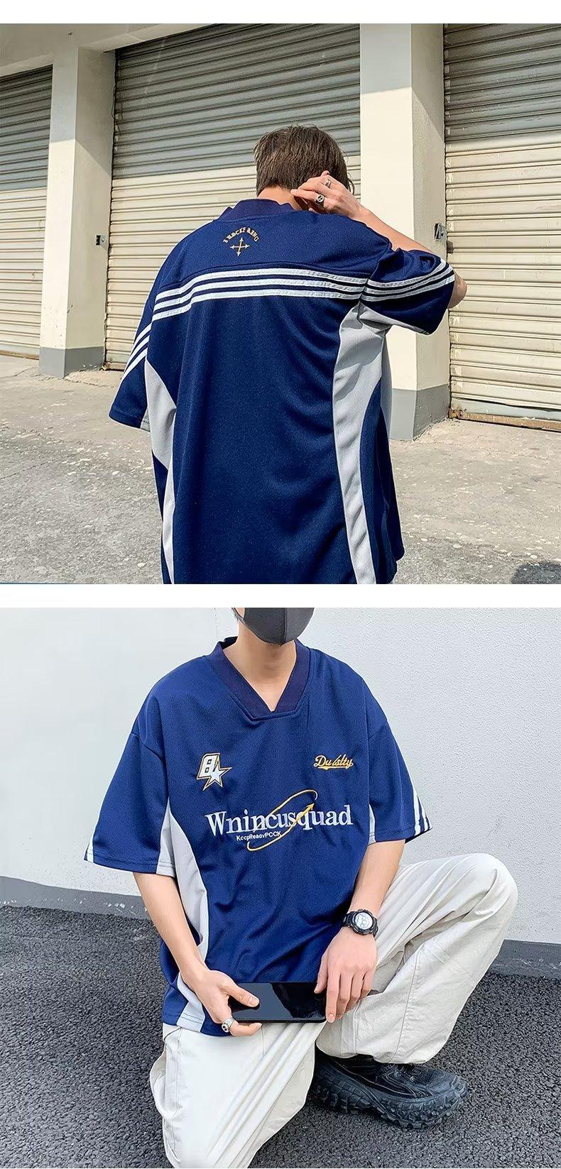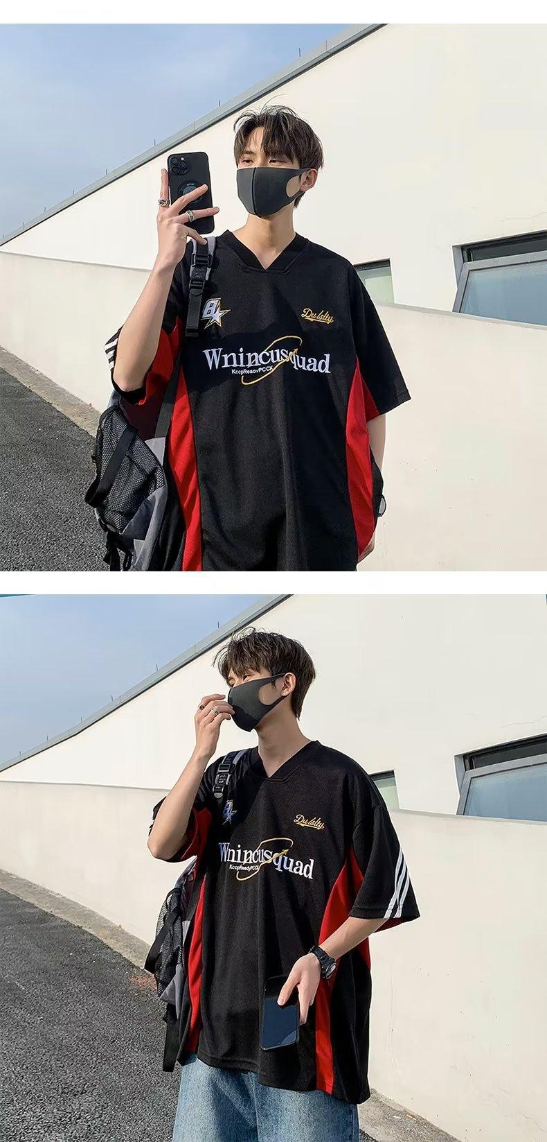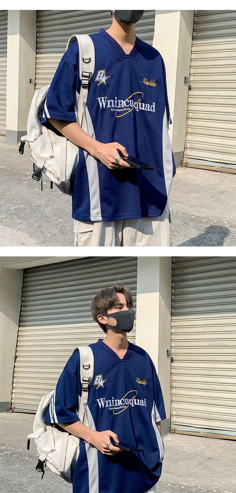 [SHOPEE Explosions] Jersey holgado de hip hop de media manga con cuello en V y bordado para hombre de estilo locomotora TH Cross-border
