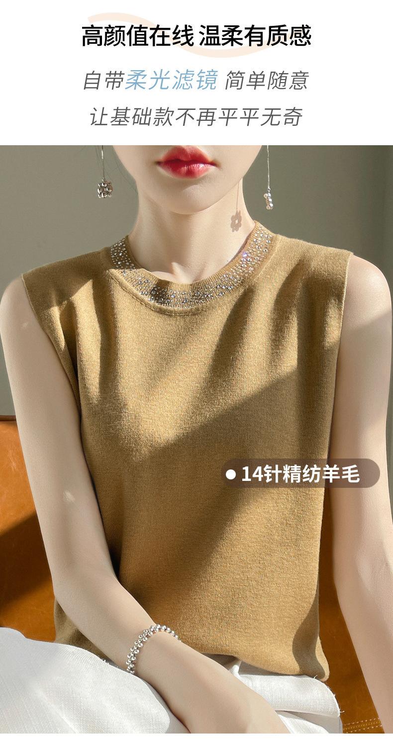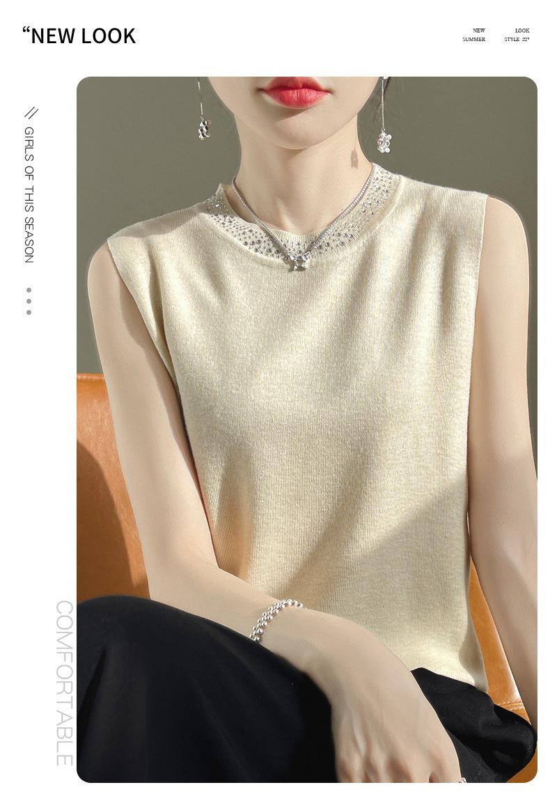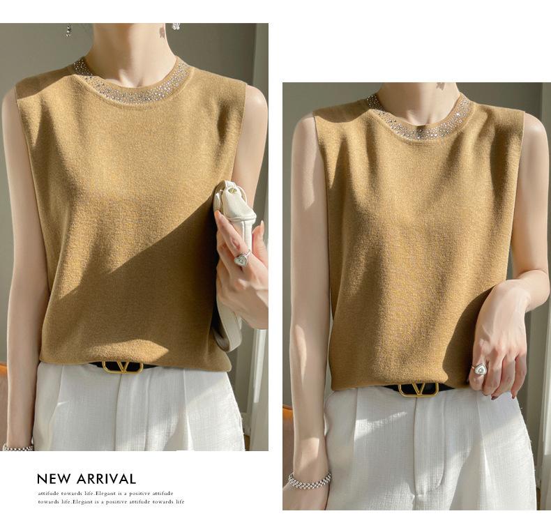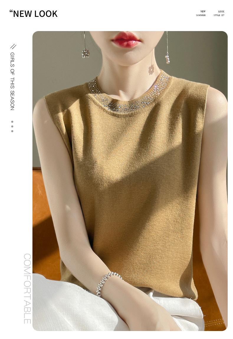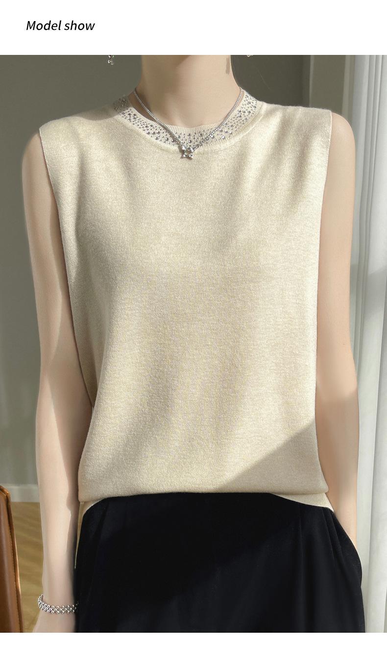 Chaleco informal de lana peinada de moda para mujer, top sin mangas de primavera y verano con cuello redondo y base interior de punto con tirantes de diamante.