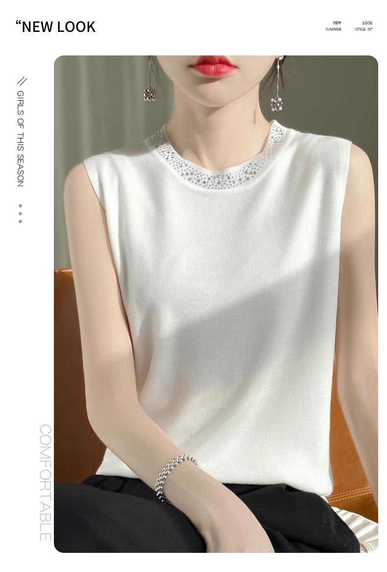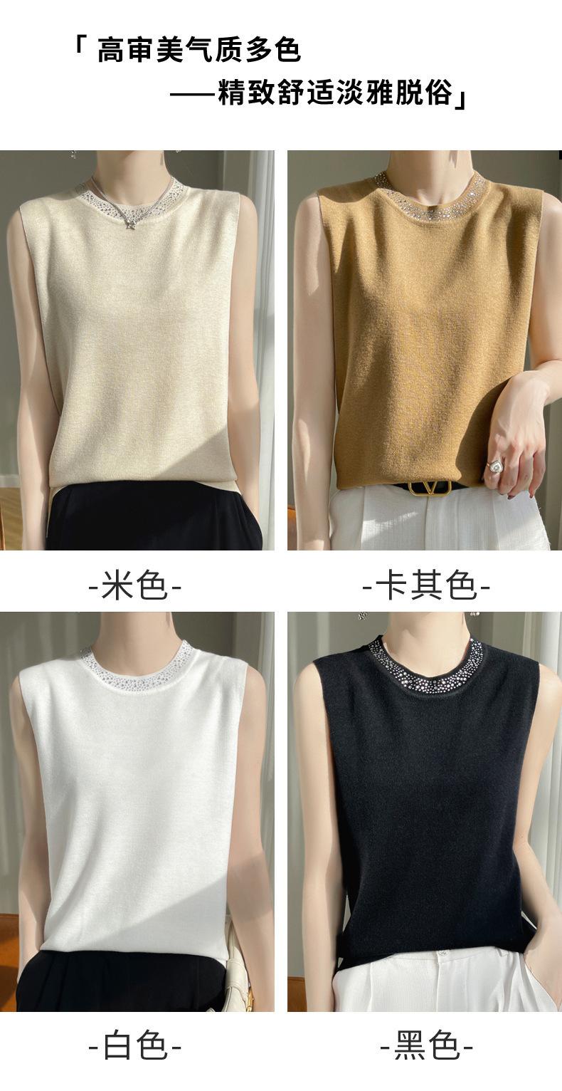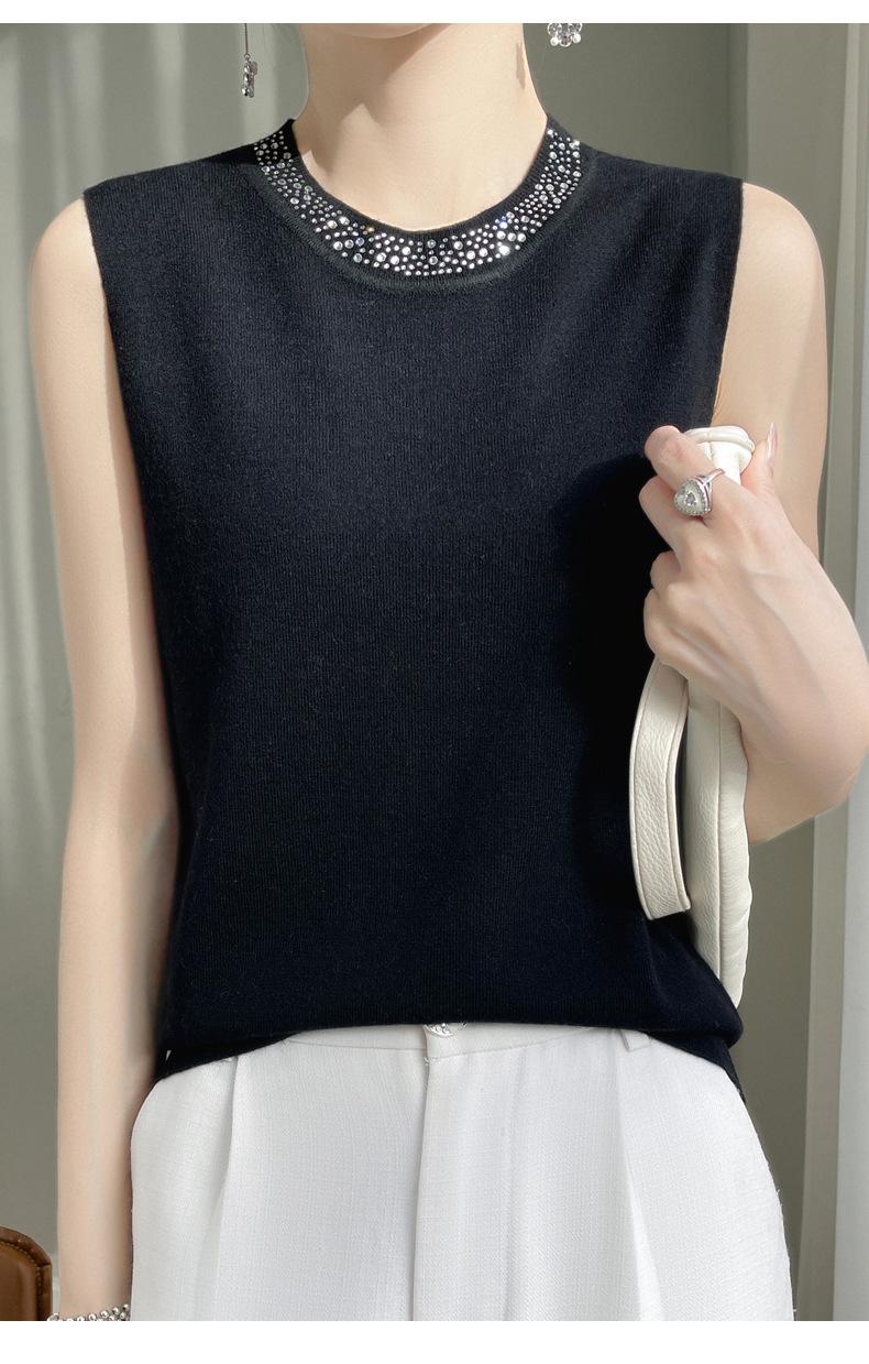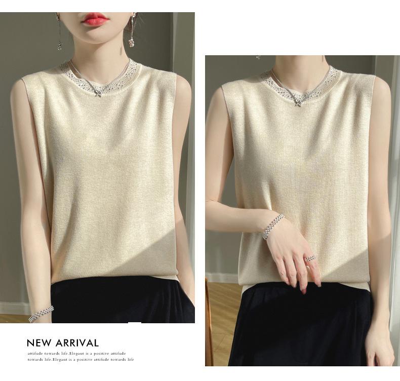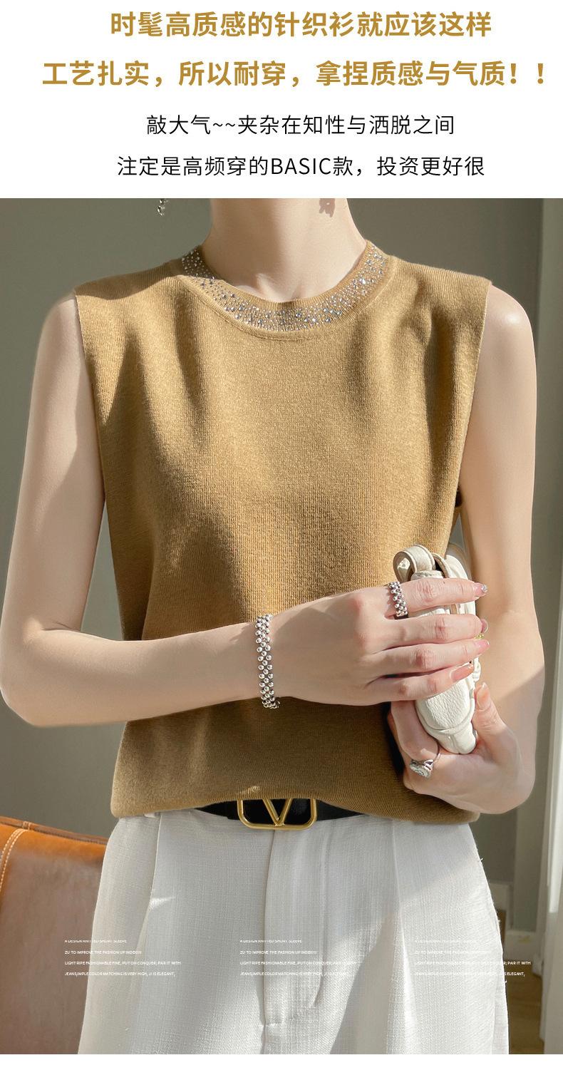 Chaleco informal de lana peinada de moda para mujer, top sin mangas de primavera y verano con cuello redondo y base interior de punto con tirantes de diamante.