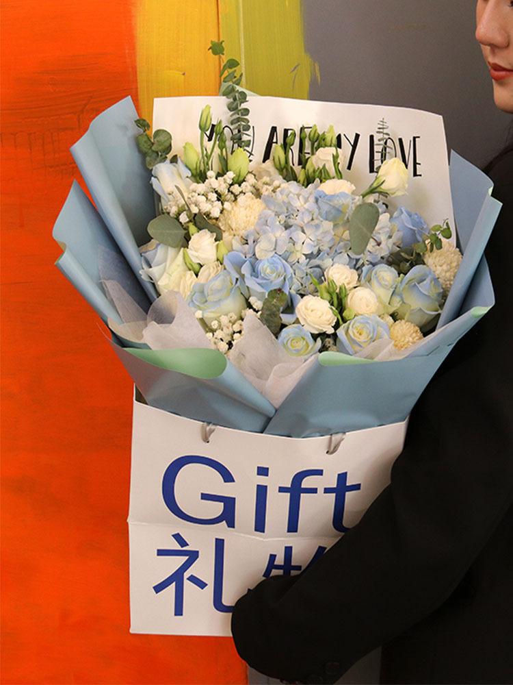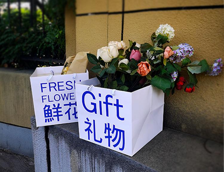 Gift bag; White cardboard; 28*28cm, Flower bag blue; White cardboard; 28*28cm, Flower bag green characters; Wh...