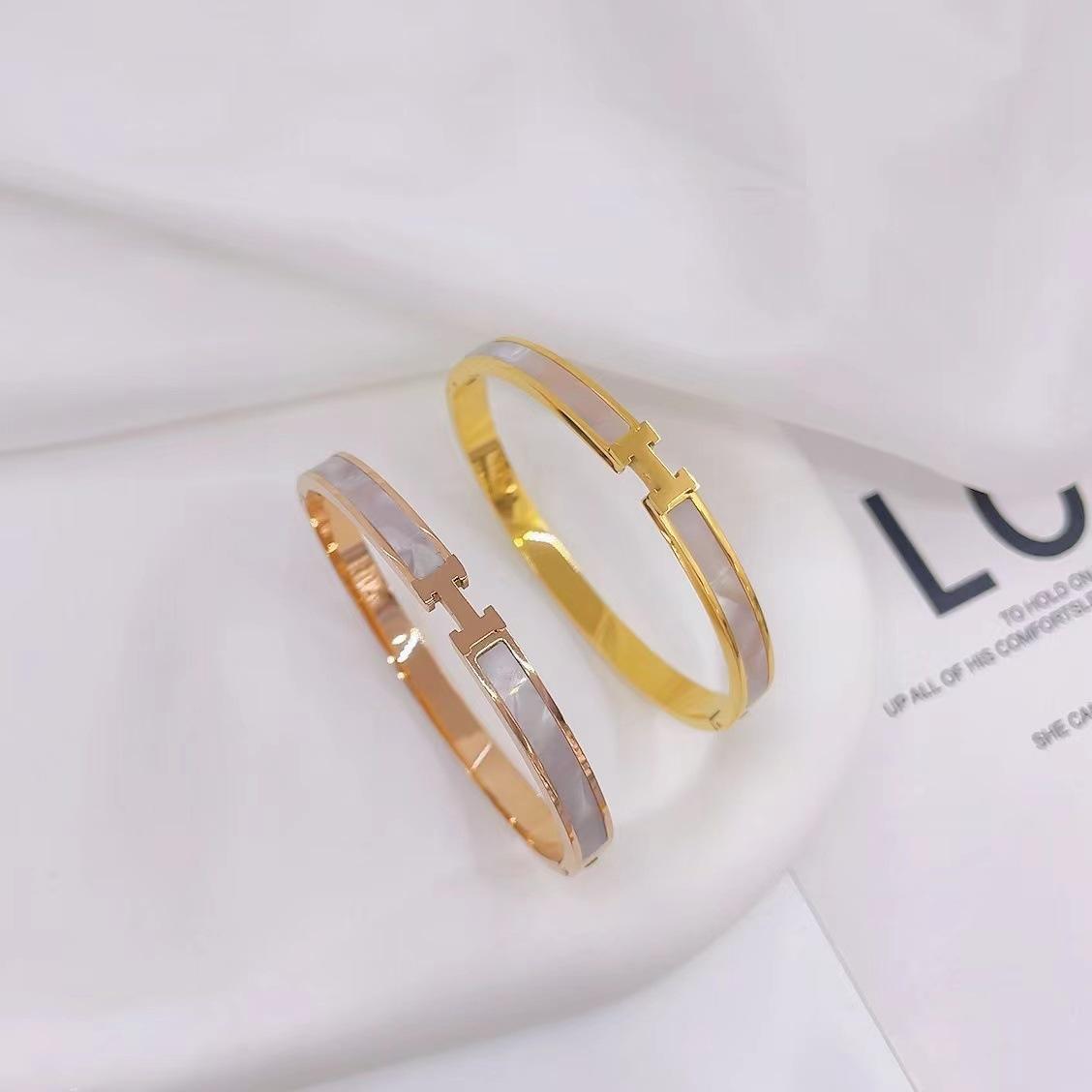 Venta caliente Pulsera de acero de titanio con letra H chapada en oro grueso de 18k con concha blanca, pulsera de oro rosa de diseño nicho, tendencia ins¥14Compre ya |