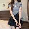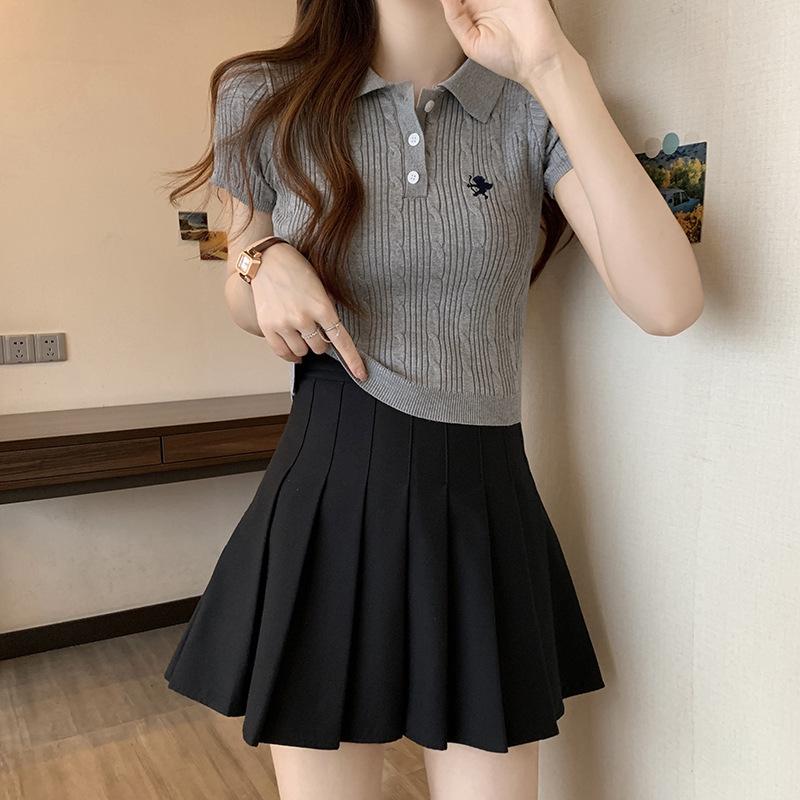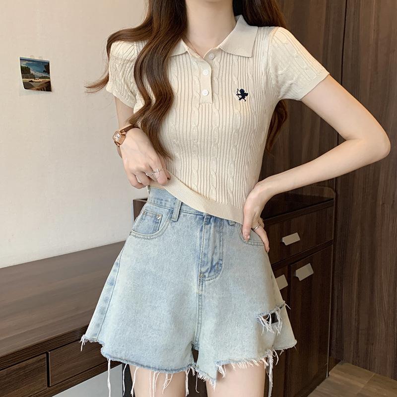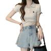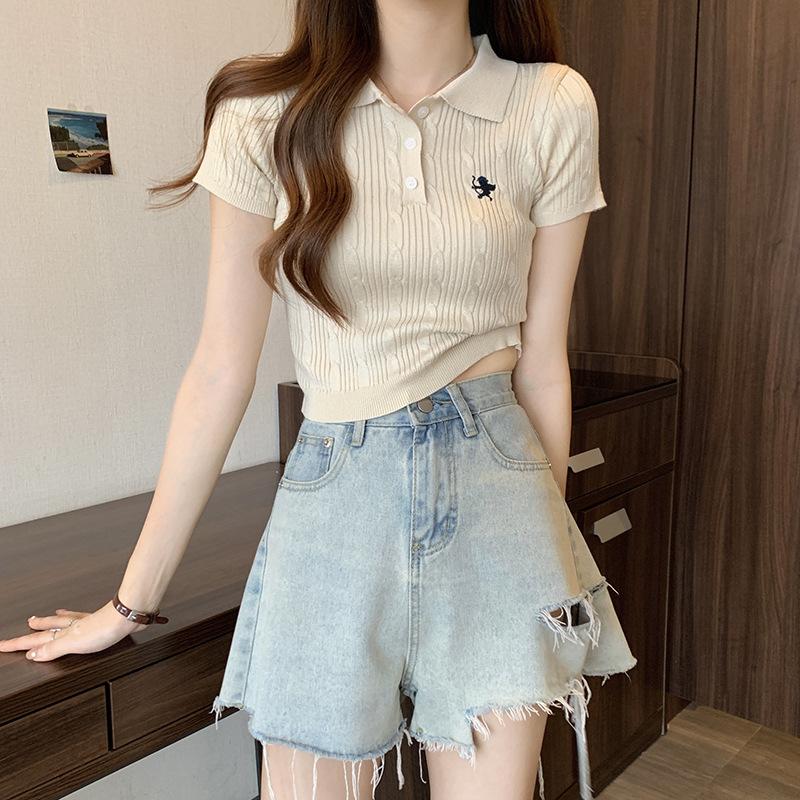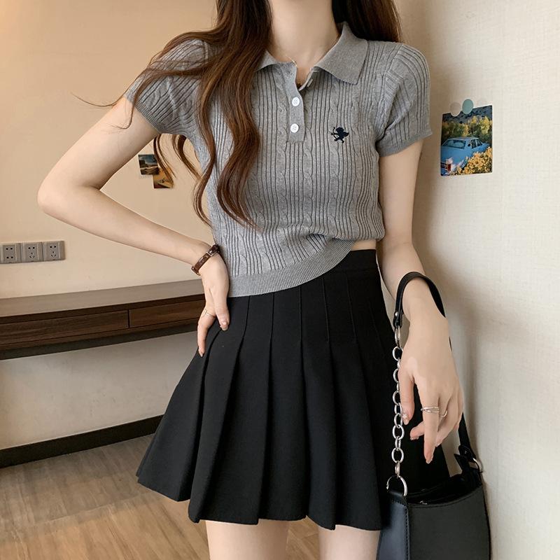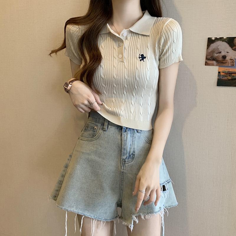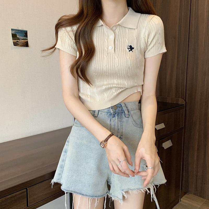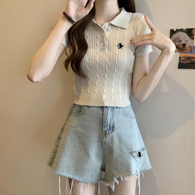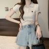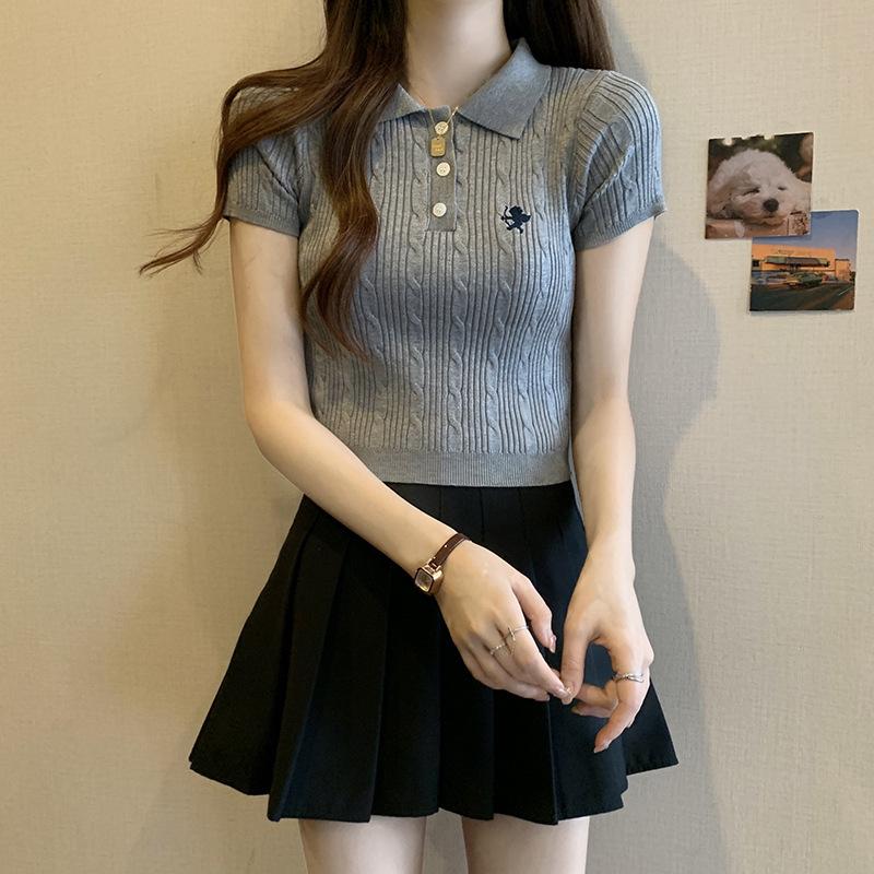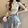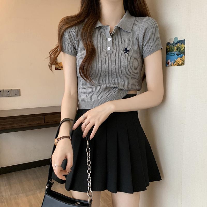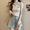 Chic Dulce y Picante Verano Moda Nicho Francesa Camisa de Punto con Cuello Polo Camiseta de Manga Corta Top Corto Ajustado para Mujer
