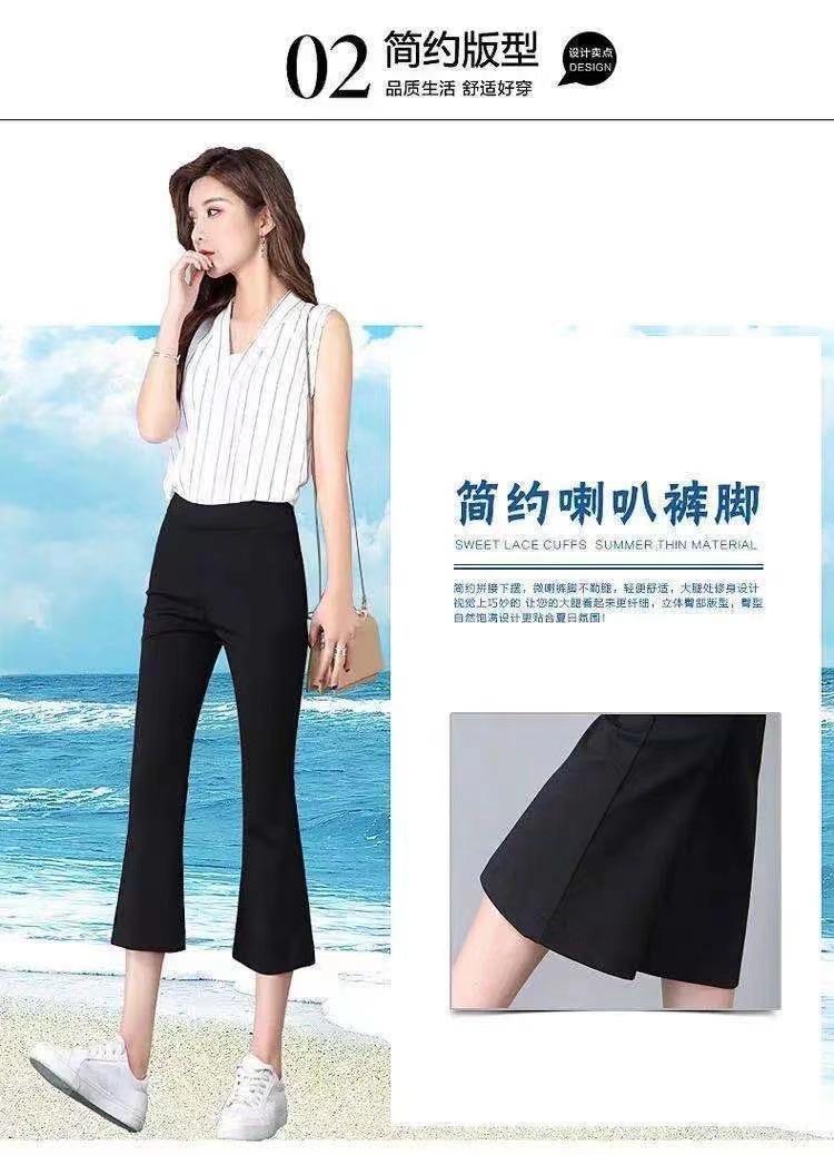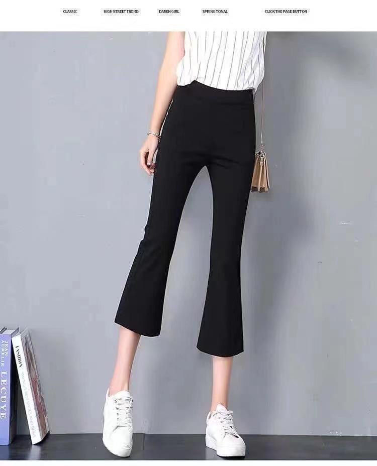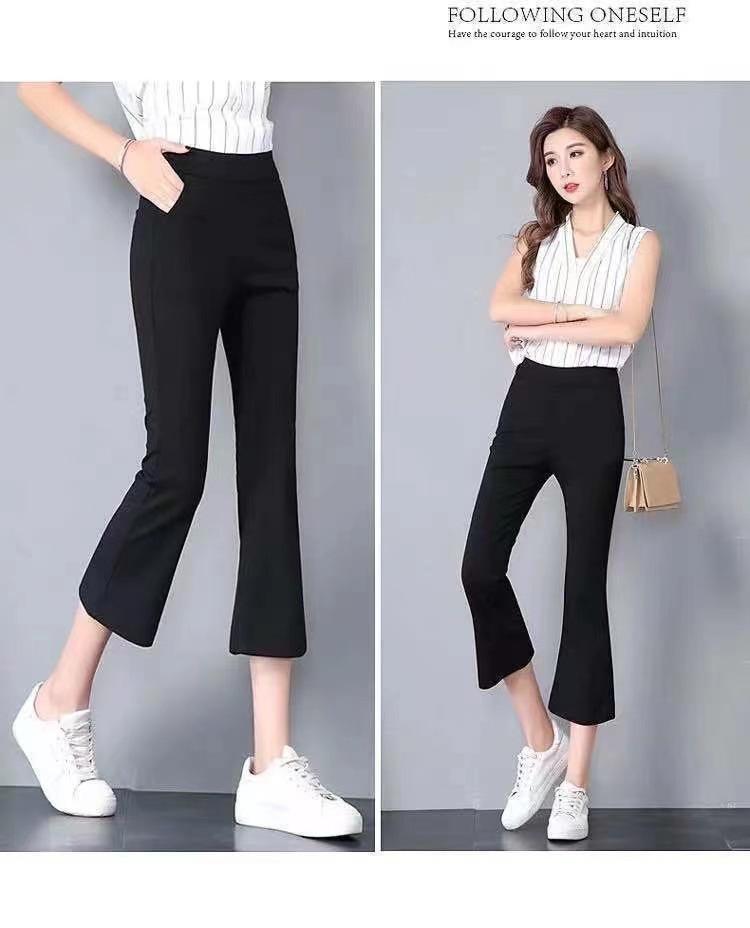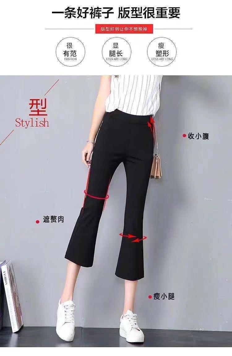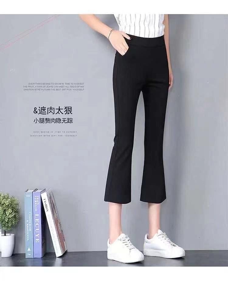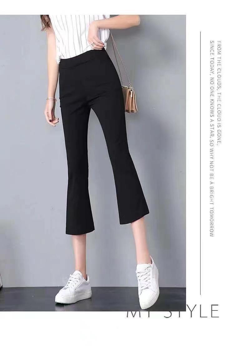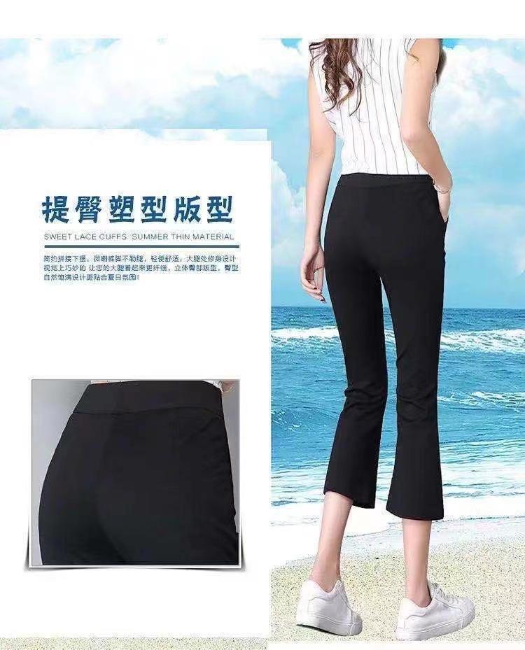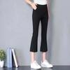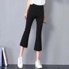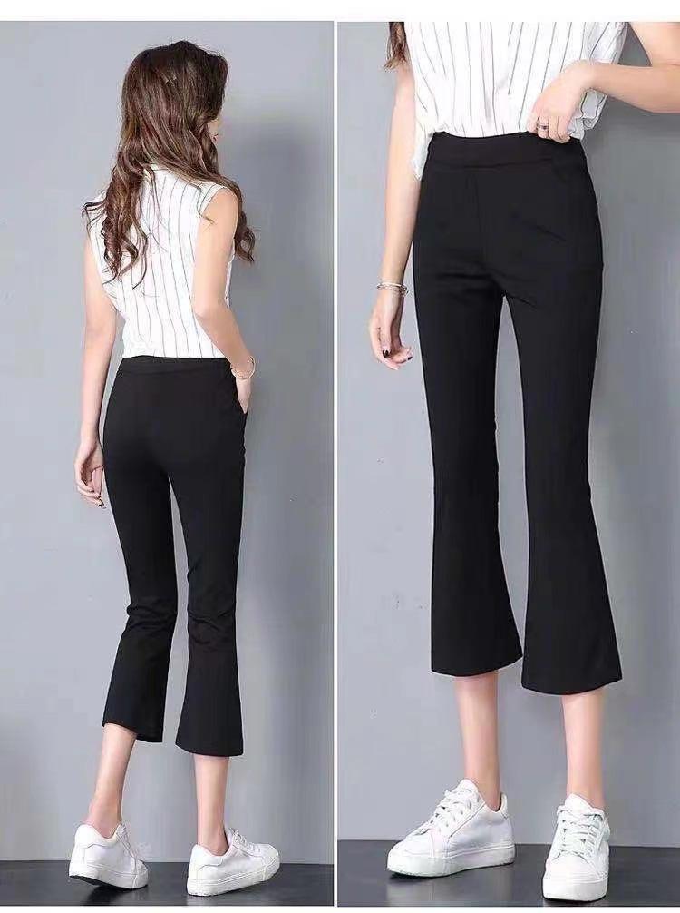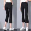 Pantalones acampanados de siete puntos drapeados para mujer en verano cintura alta elásticos negros de pierna ancha versátiles corte ajustado acampanados