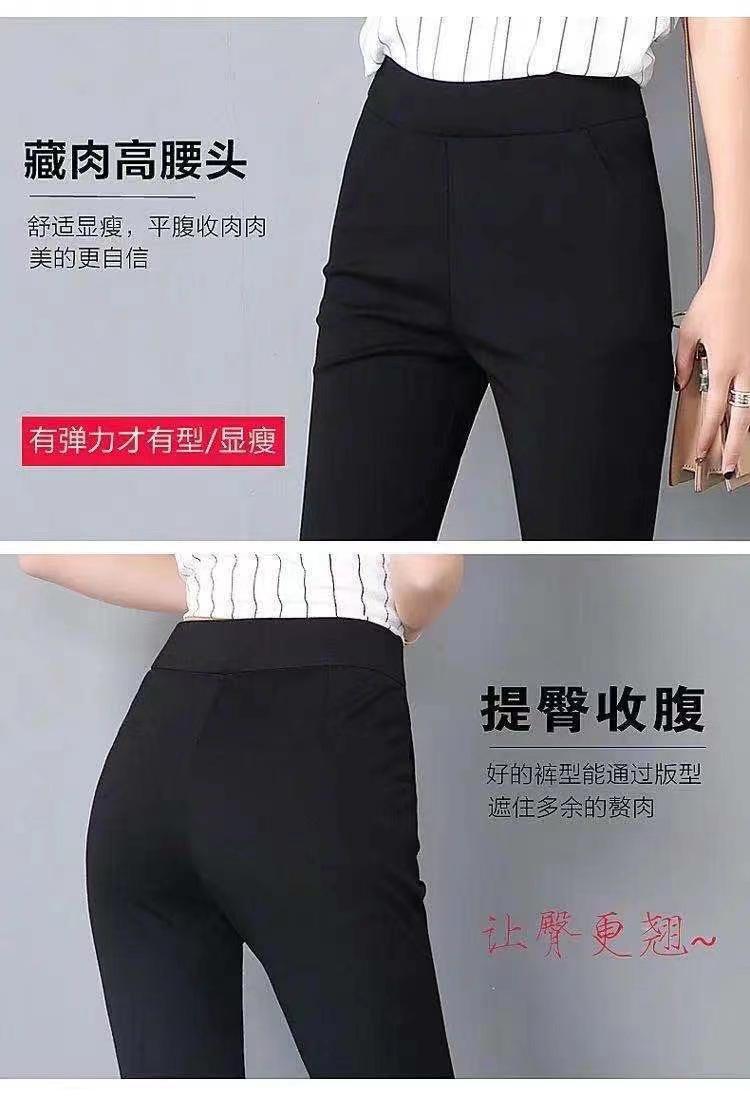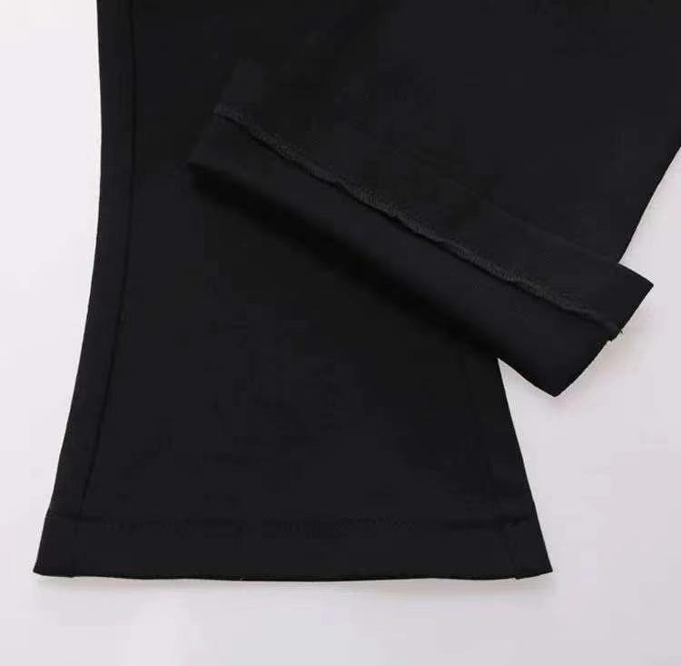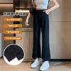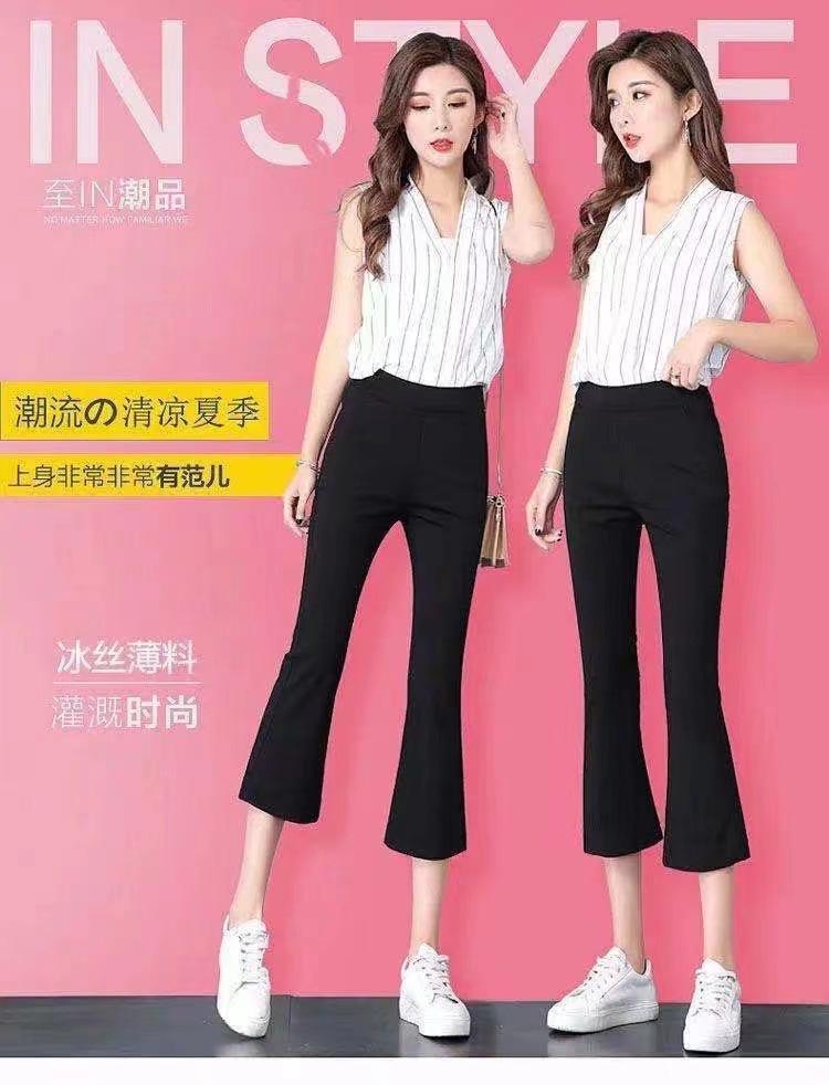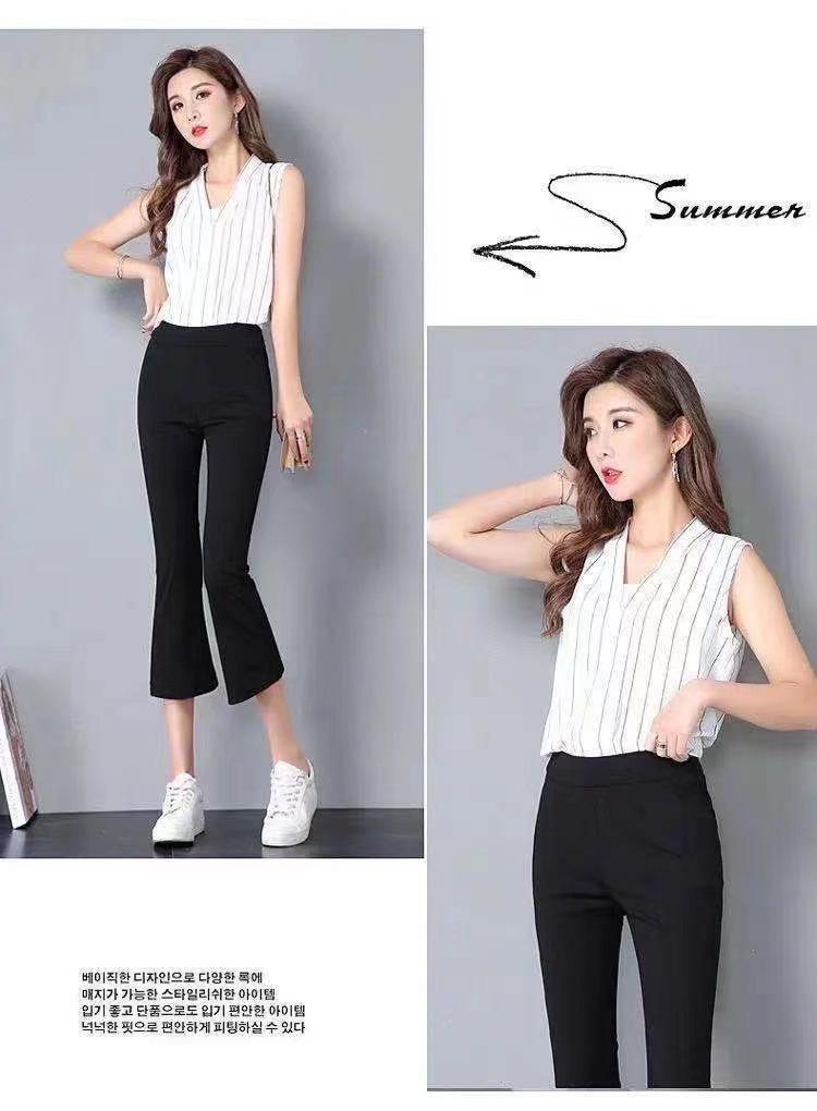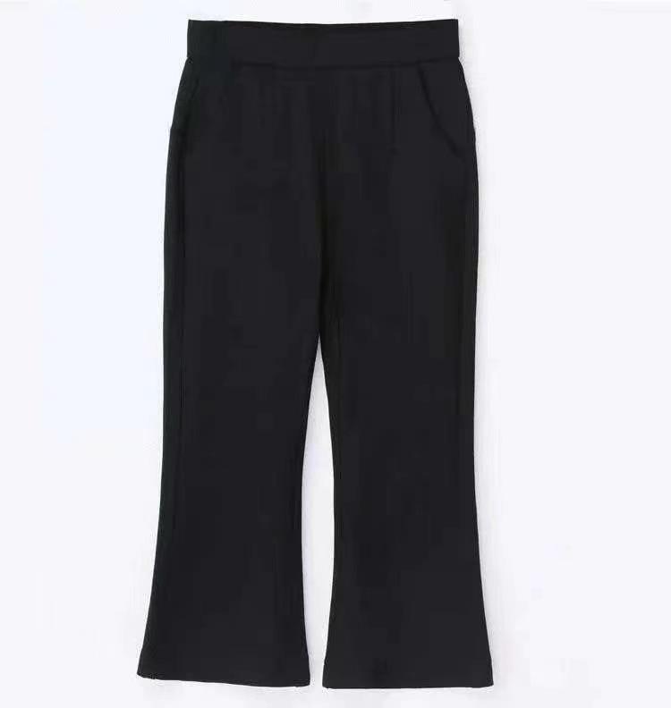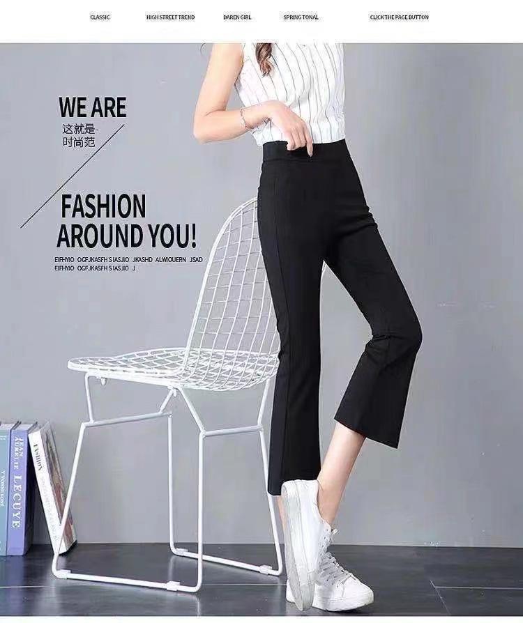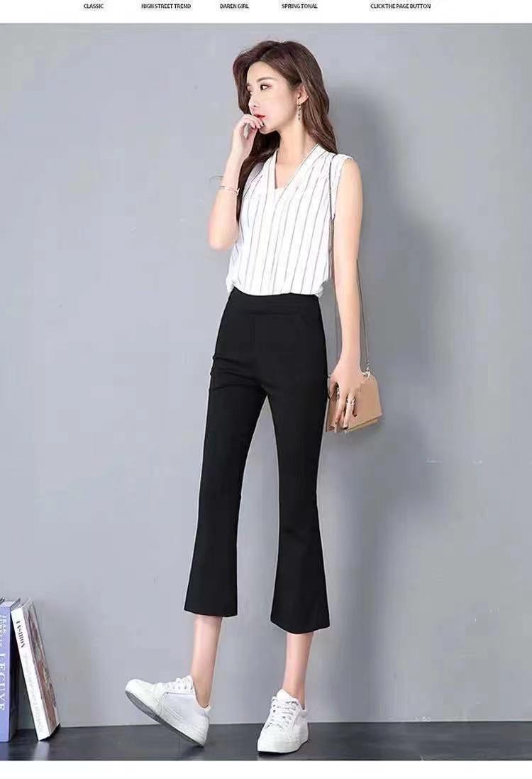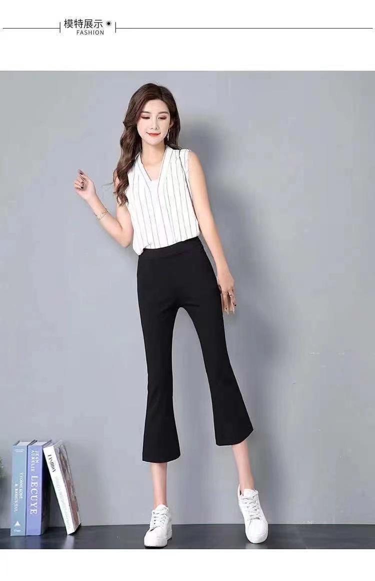 Pantalones acampanados de siete puntos drapeados para mujer en verano cintura alta elásticos negros de pierna ancha versátiles corte ajustado acampanados