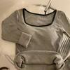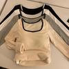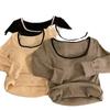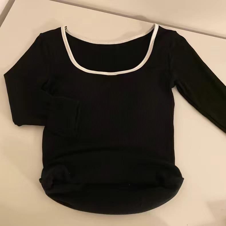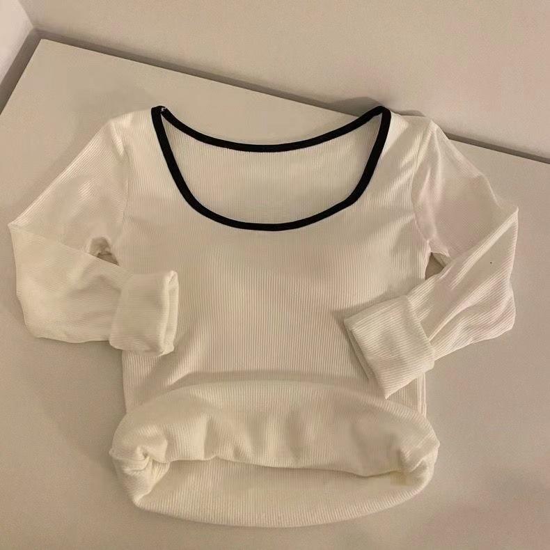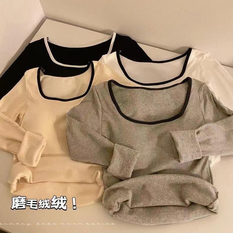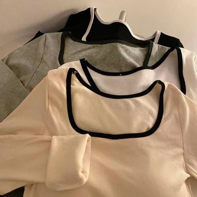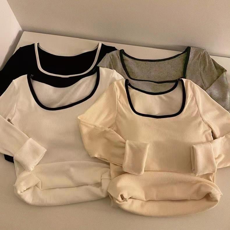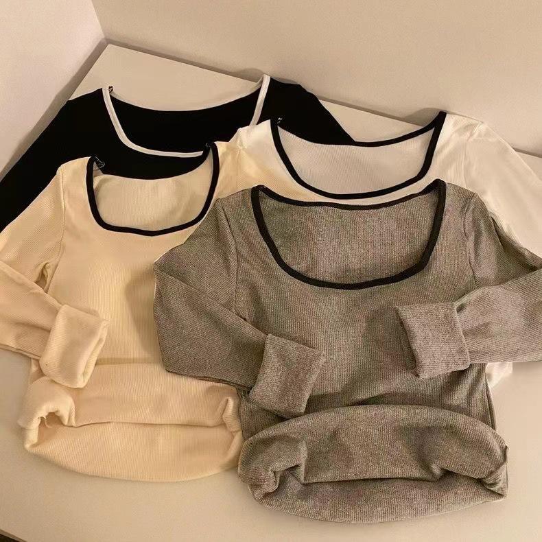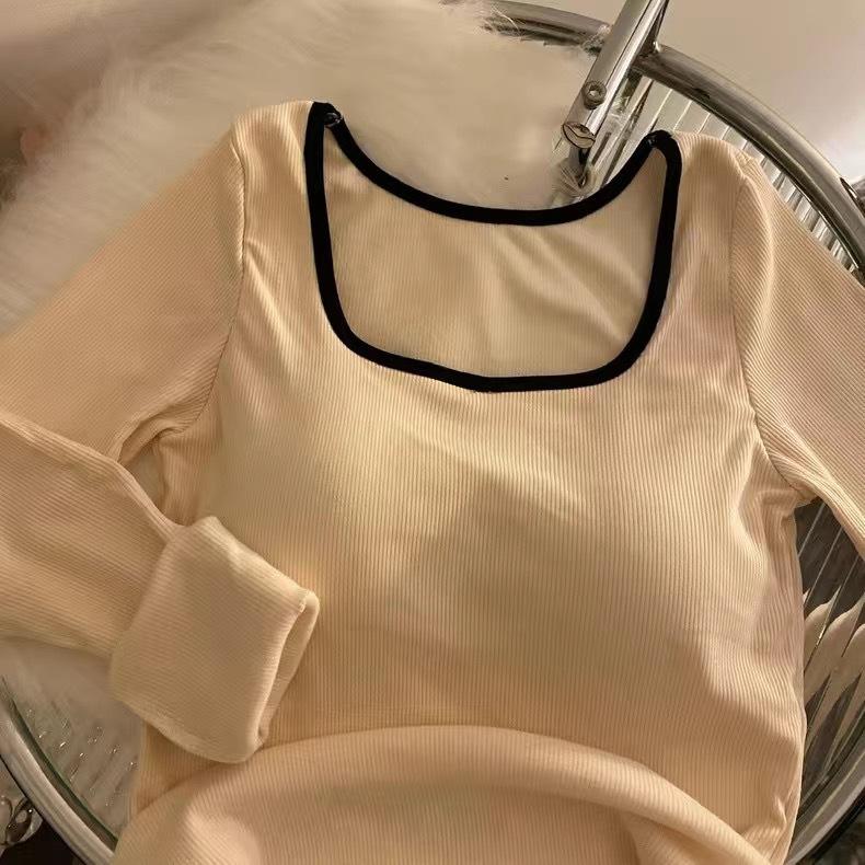 Blusa de manga larga cepillada para chica nueva de estilo coreano para otoño e invierno, diseño de color en contraste para mujer con base de cuello cuadrado adelgazante y ajustado en el pecho