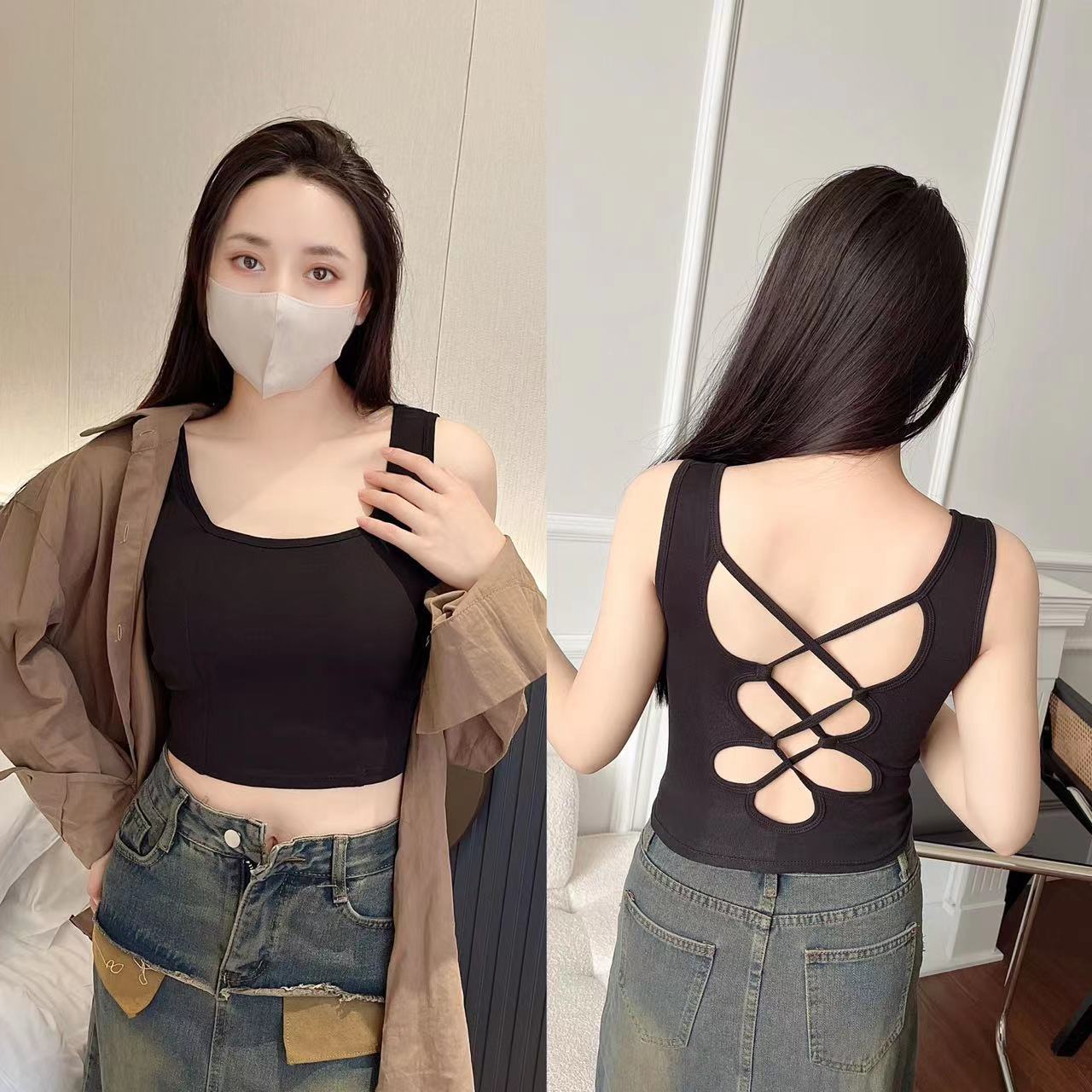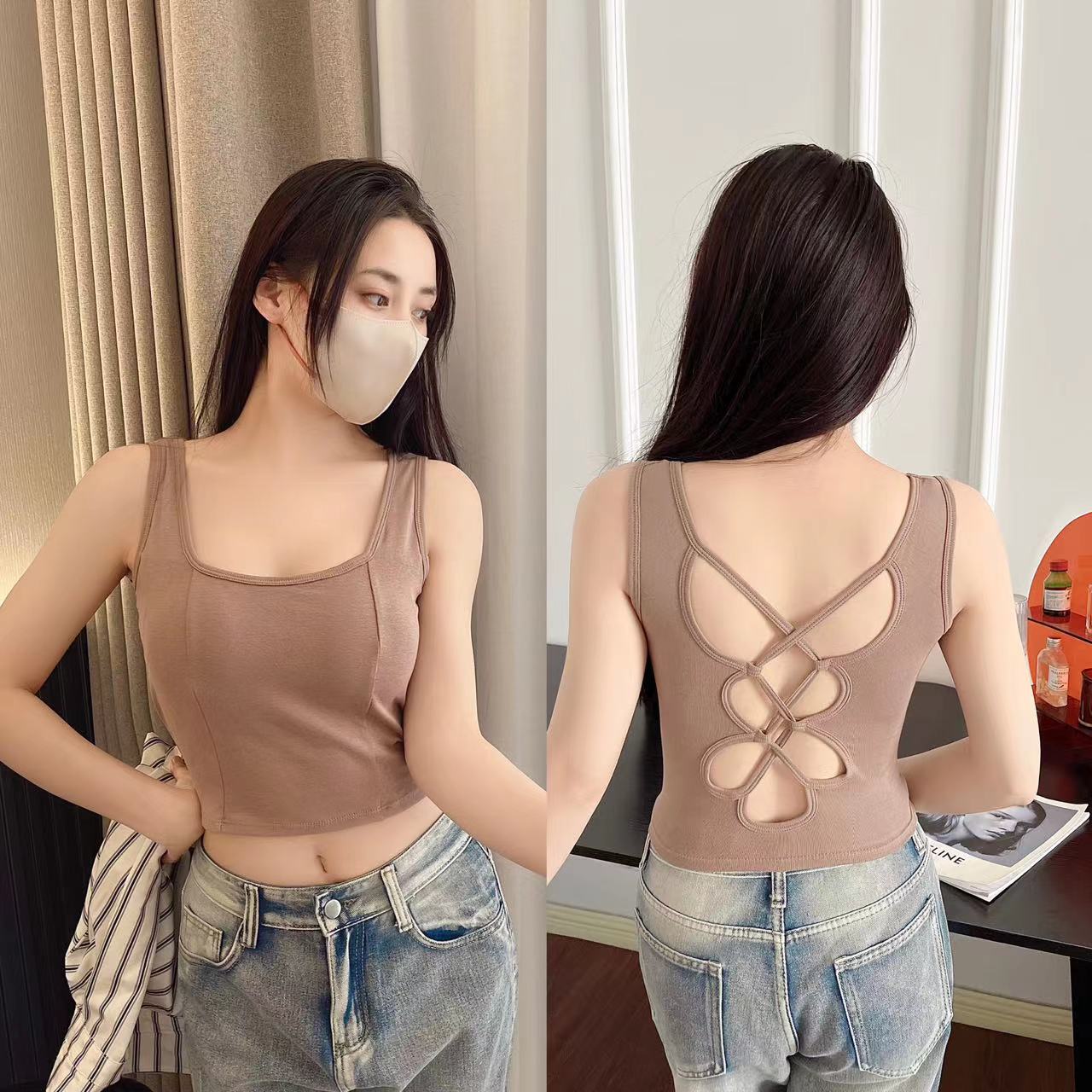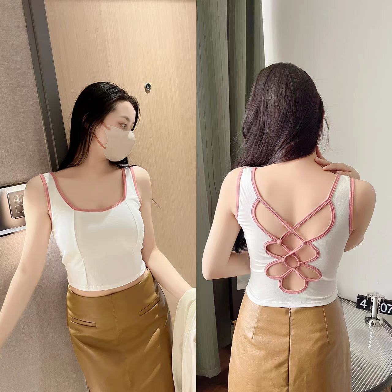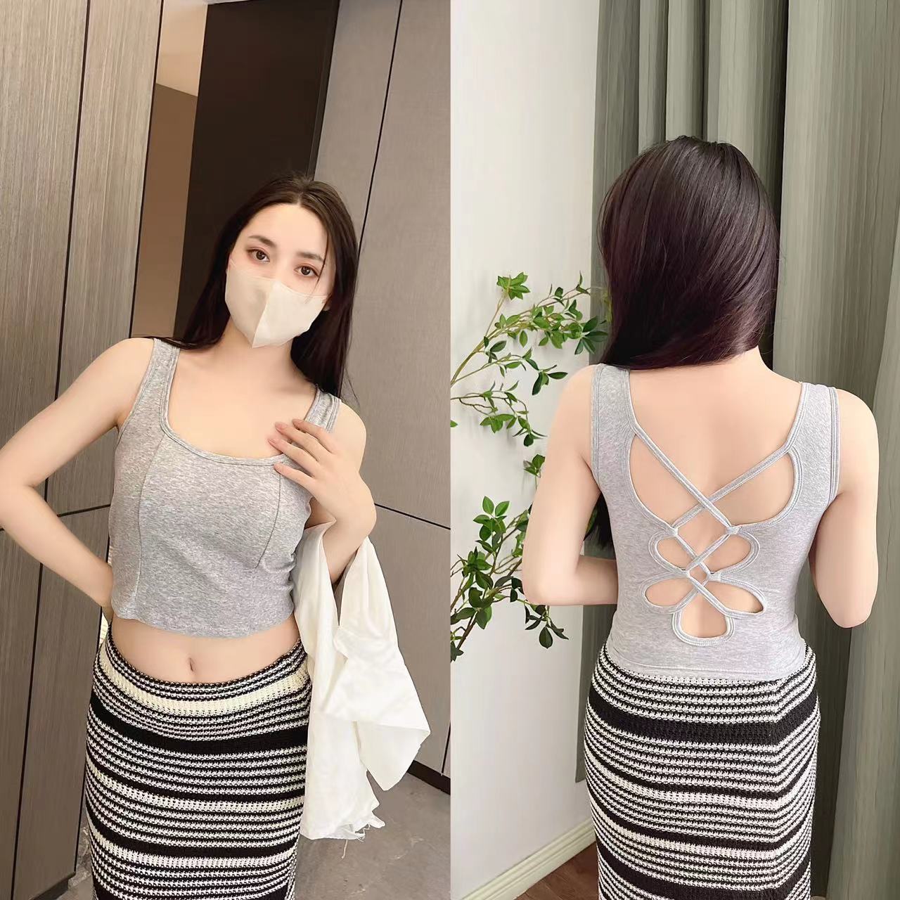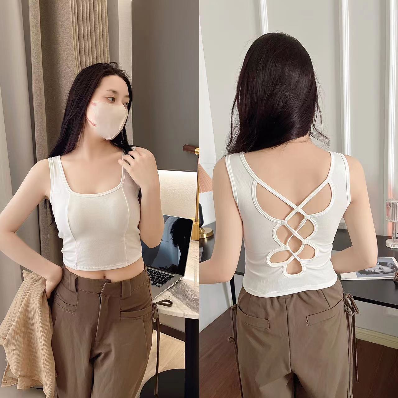 Nuevo Algodón Primavera y Verano Chaleco Pequeño Copa Fija Tirante con Almohadilla para el Pecho Ropa Interior para Mujer Espalda Hermosa Hombro Ancho Calado Ropa Interior para Usar por Fuera