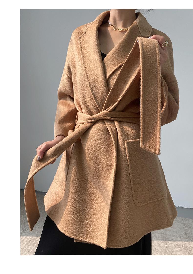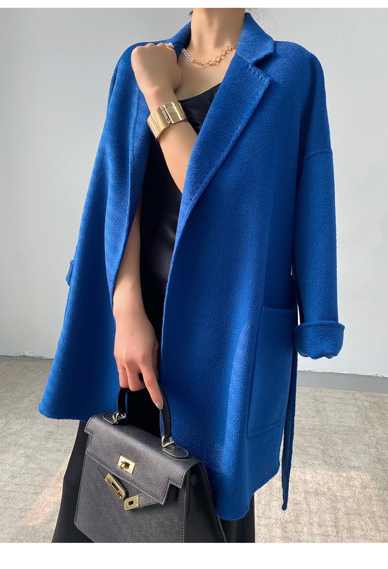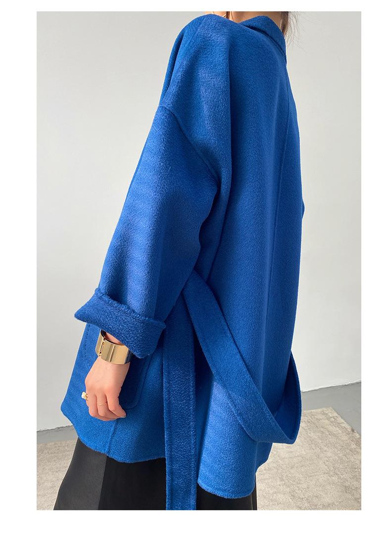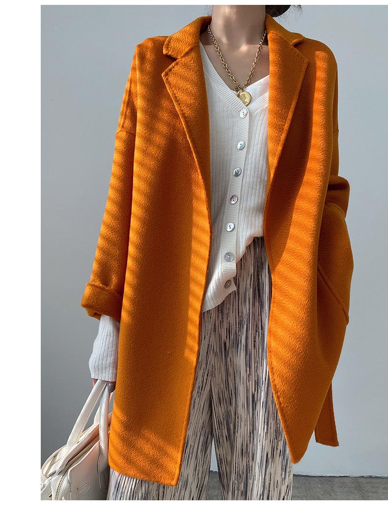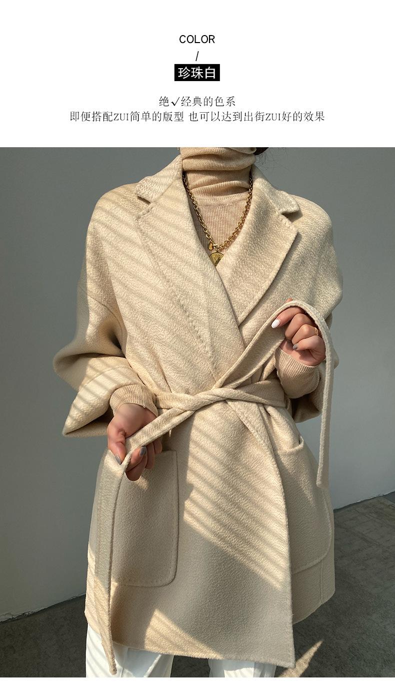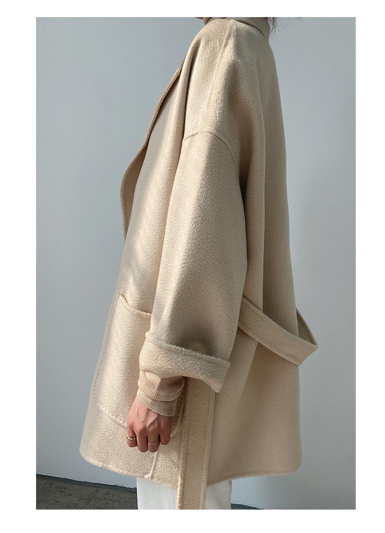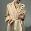 Abrigo de Lana de Doble Vista con Patrón de Ondas de Agua, Largo Medio, Cuello Tipo Traje, Lazo, Versátil, Elegante, Abrigo de Lana Holgado