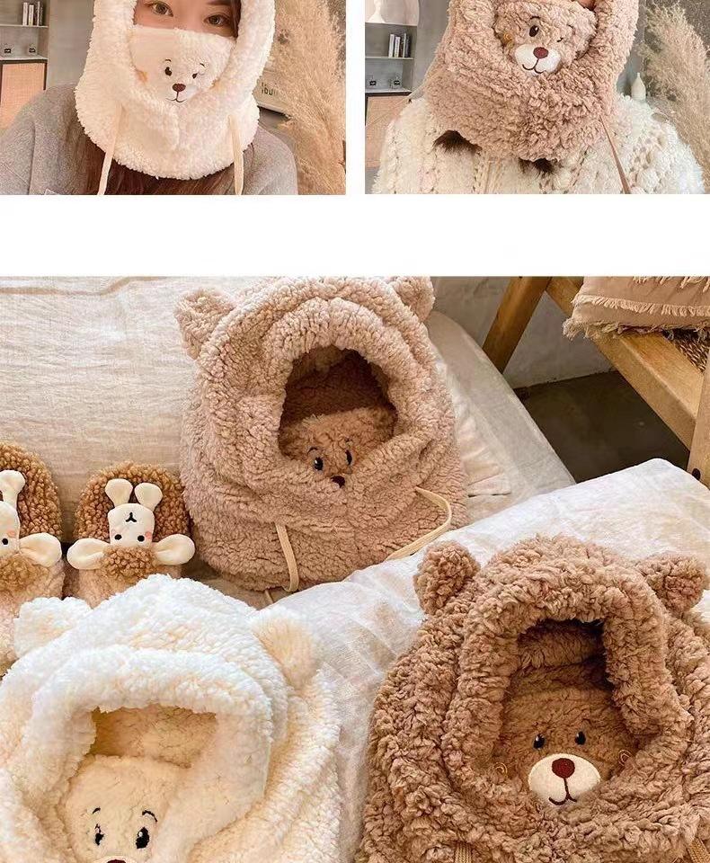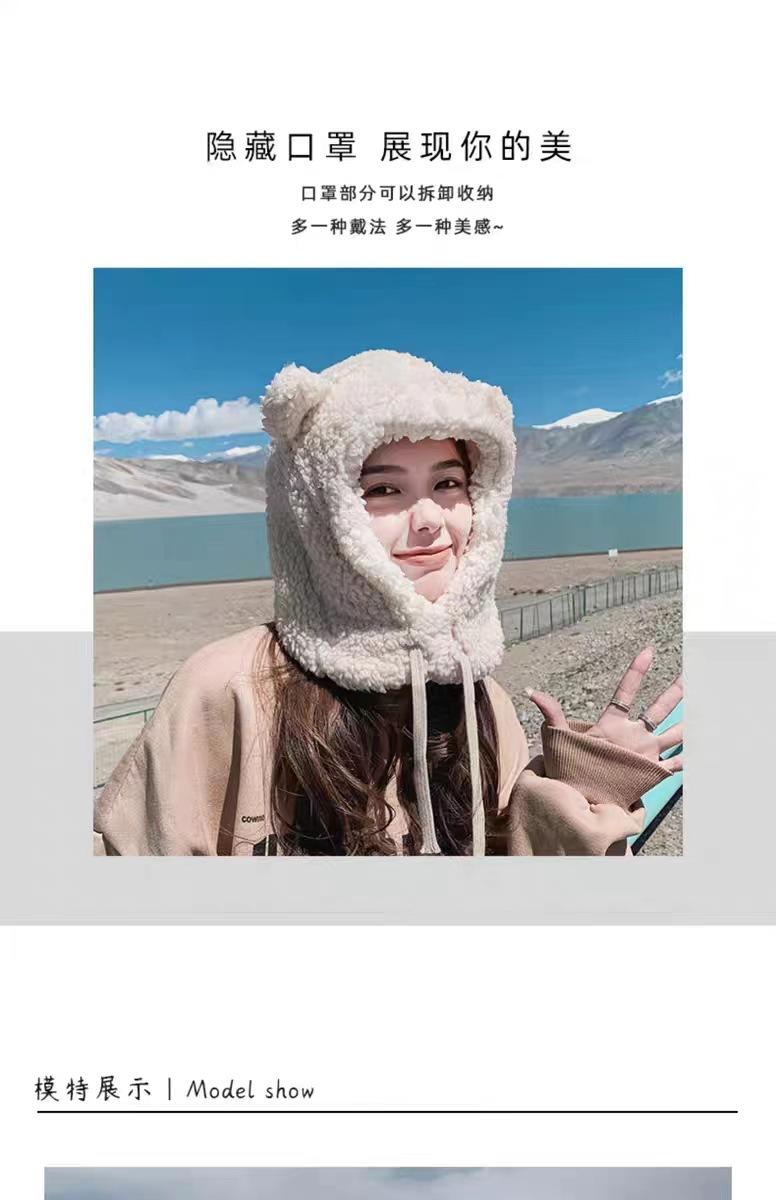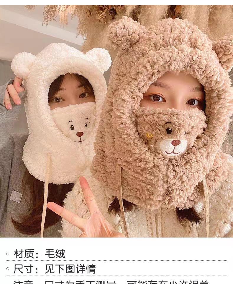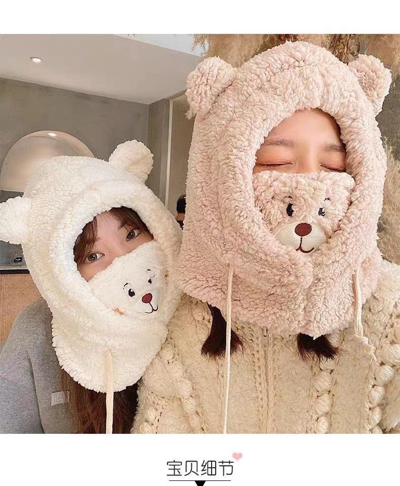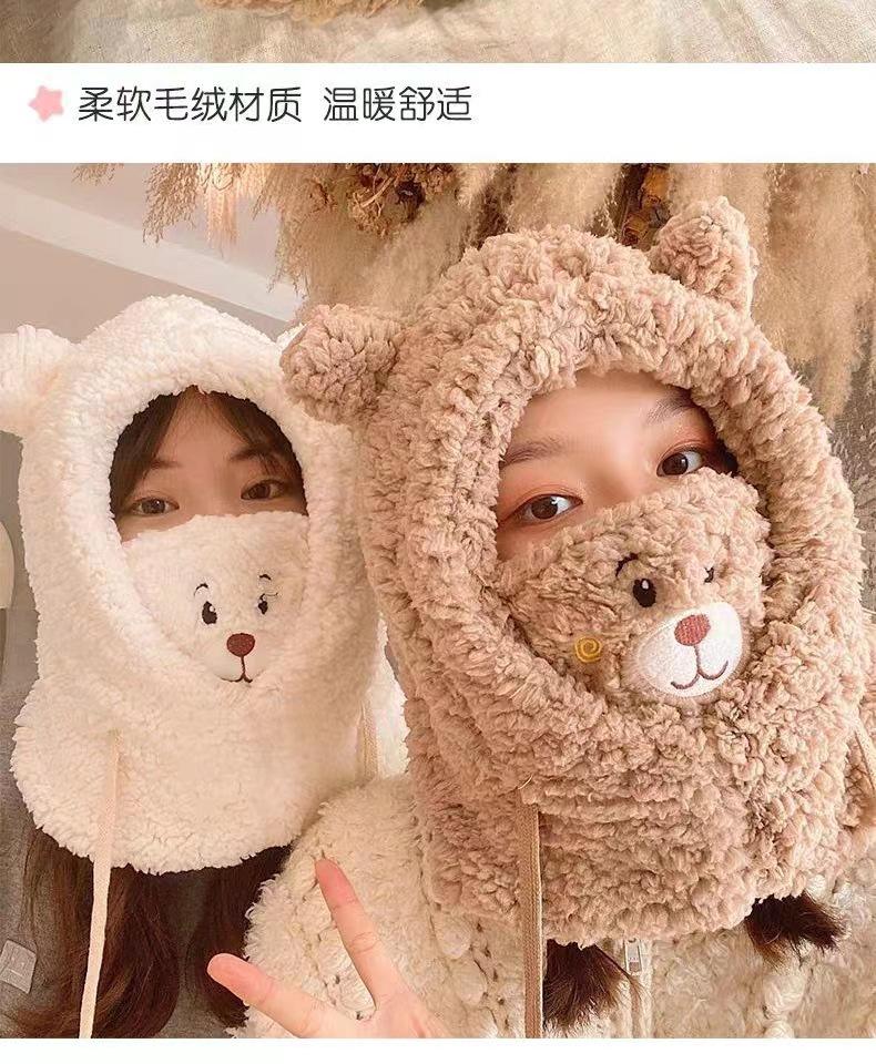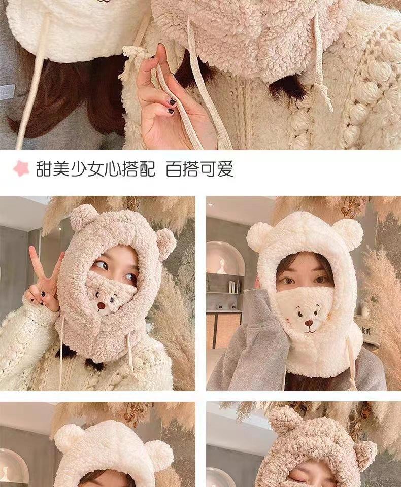 Gorro integrado con máscara de oso de peluche para mujer, otoño e invierno, estilo coreano, para ciclismo, resistente al viento, cálido, con protección para los oídos, gorro Lei Feng