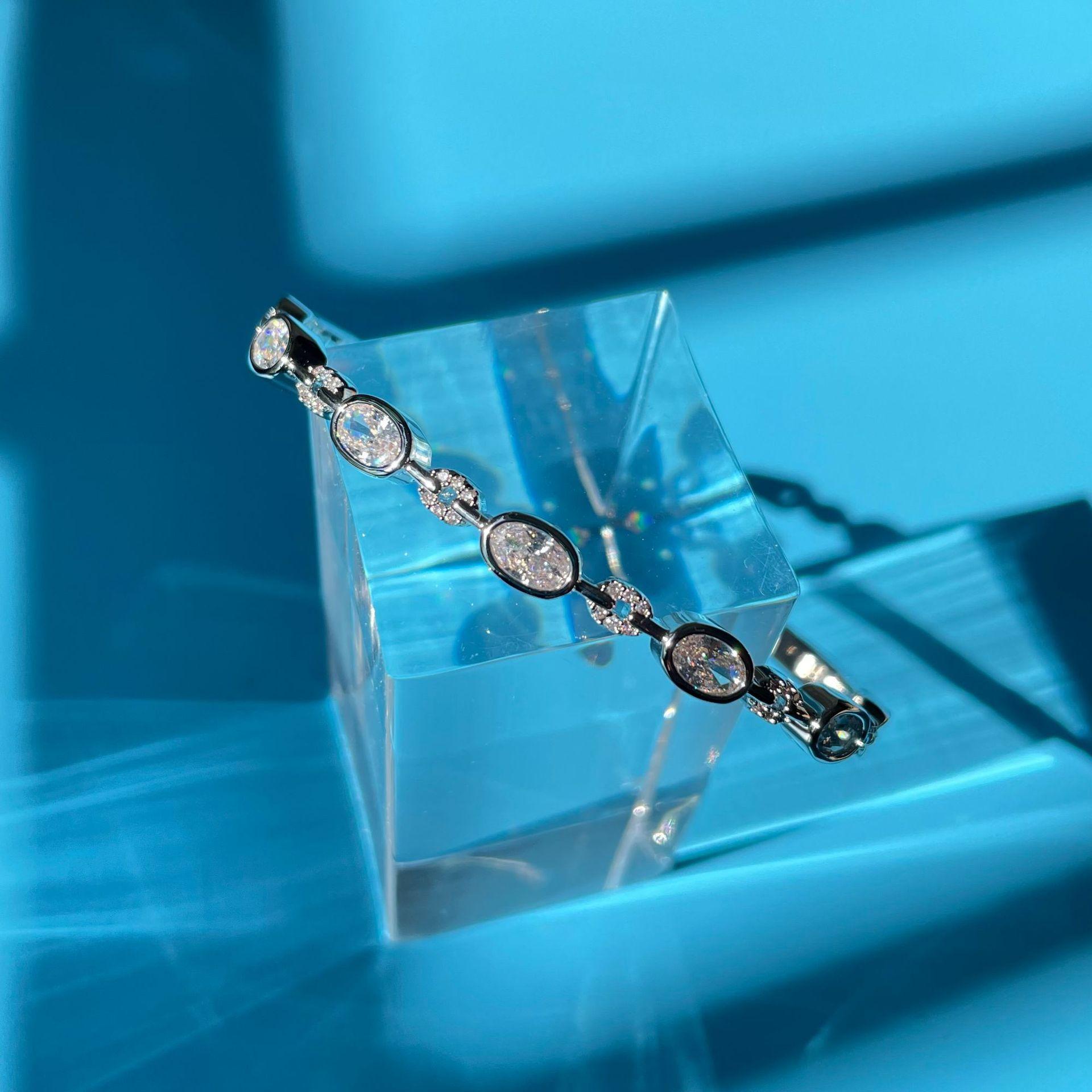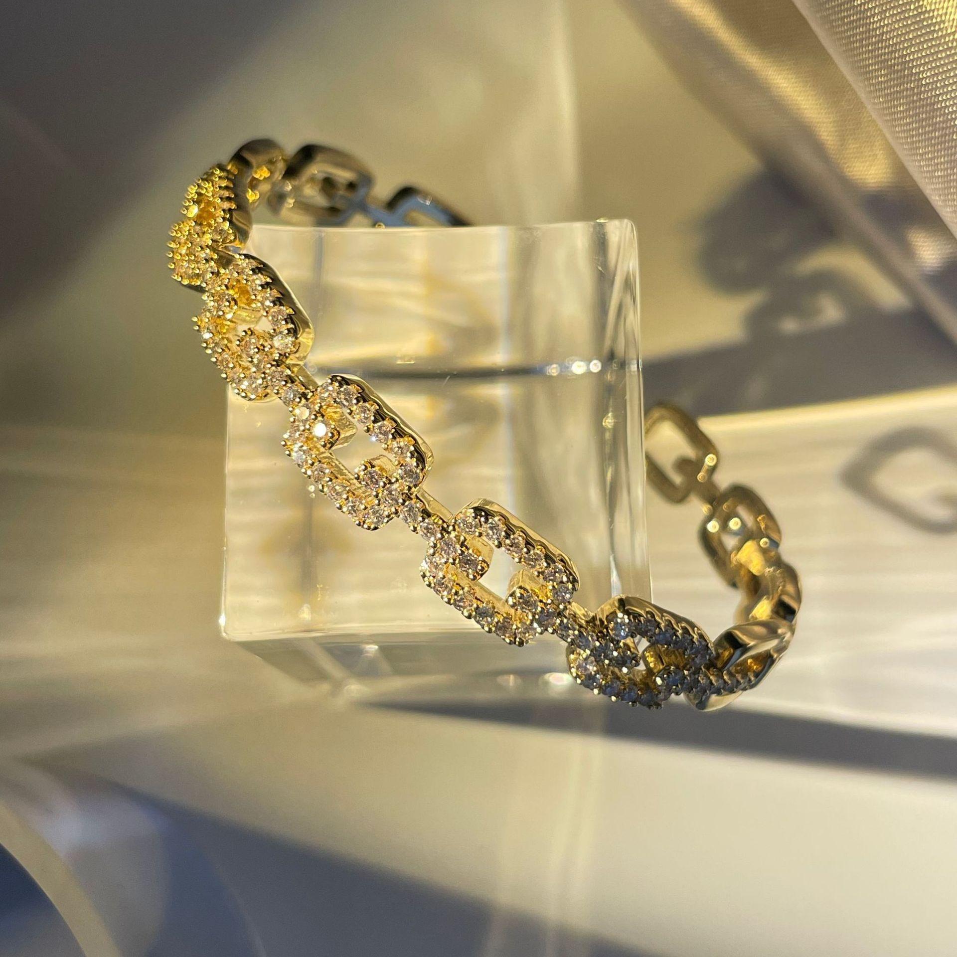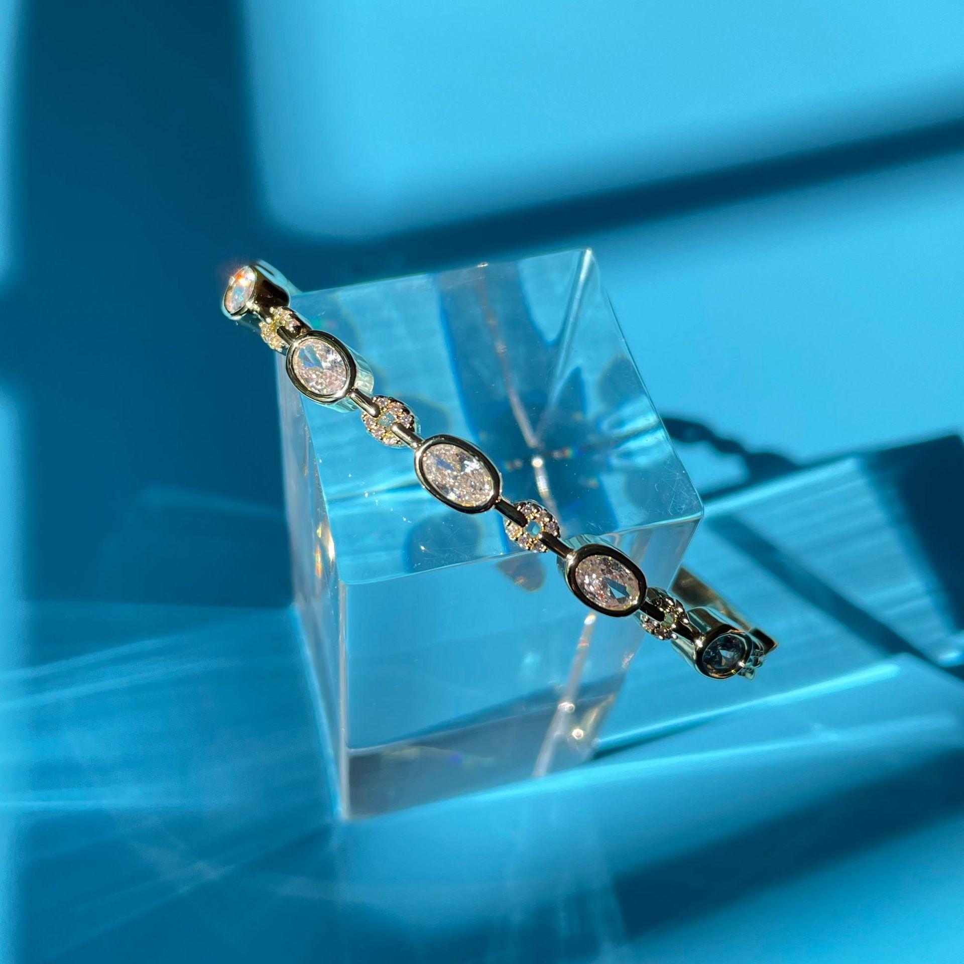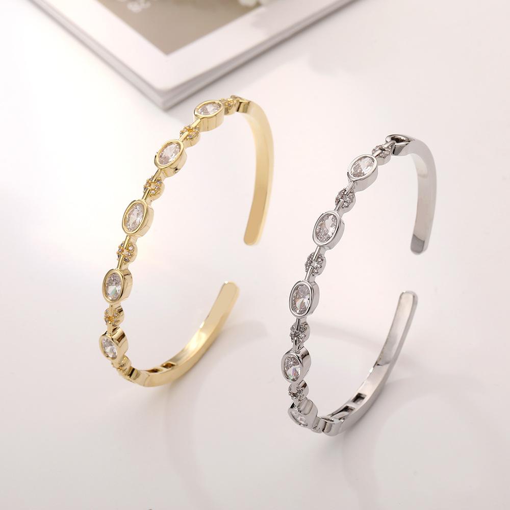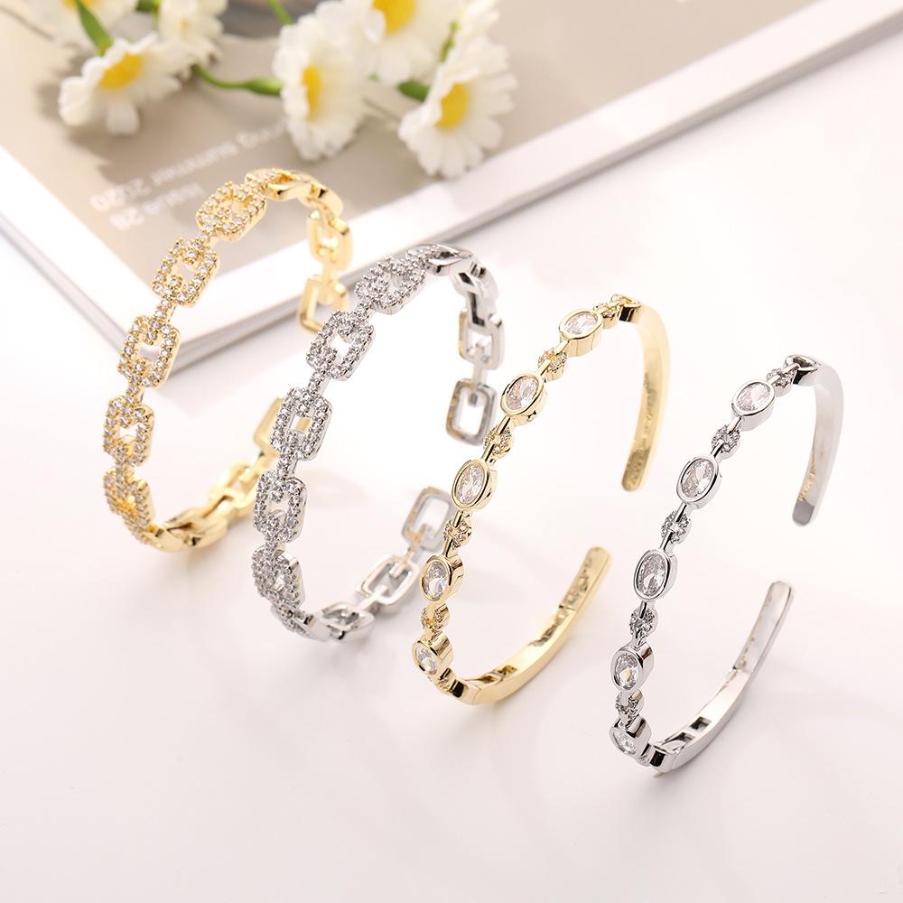 Gold geometric chain open bracelet, White gold geometric chain open bracelet, Gold oval zircon open bracelet, ...