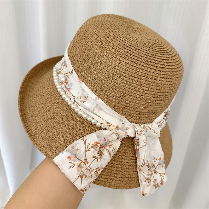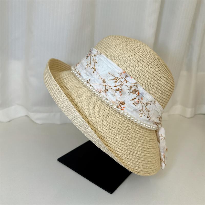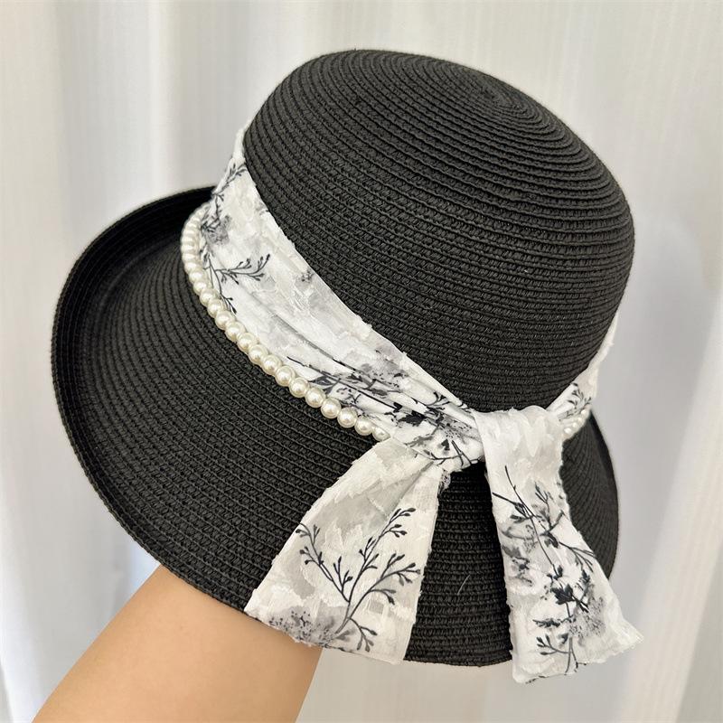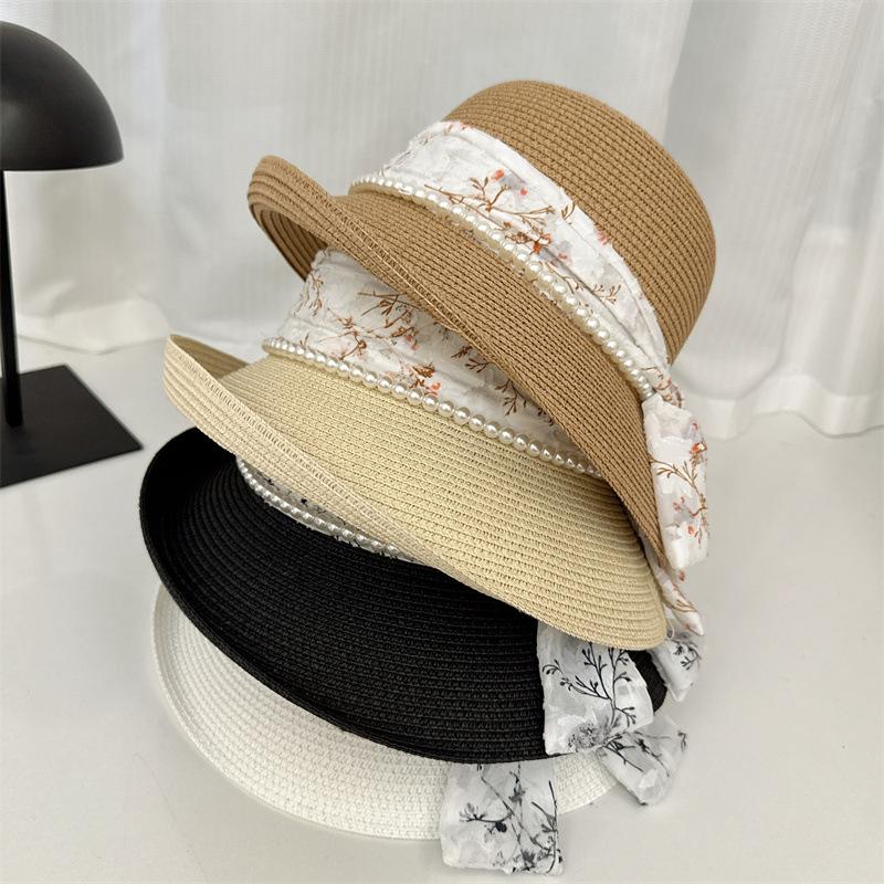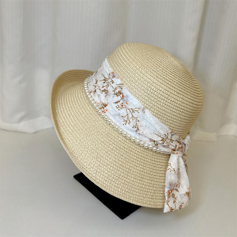 Sombrero de Paja de Ala Ancha con Lazo Floral de Perlas Guofeng para Viaje de Verano, Sombrero de Cubo de Moda para Mujer con Protección Solar
