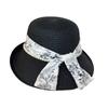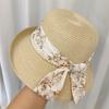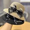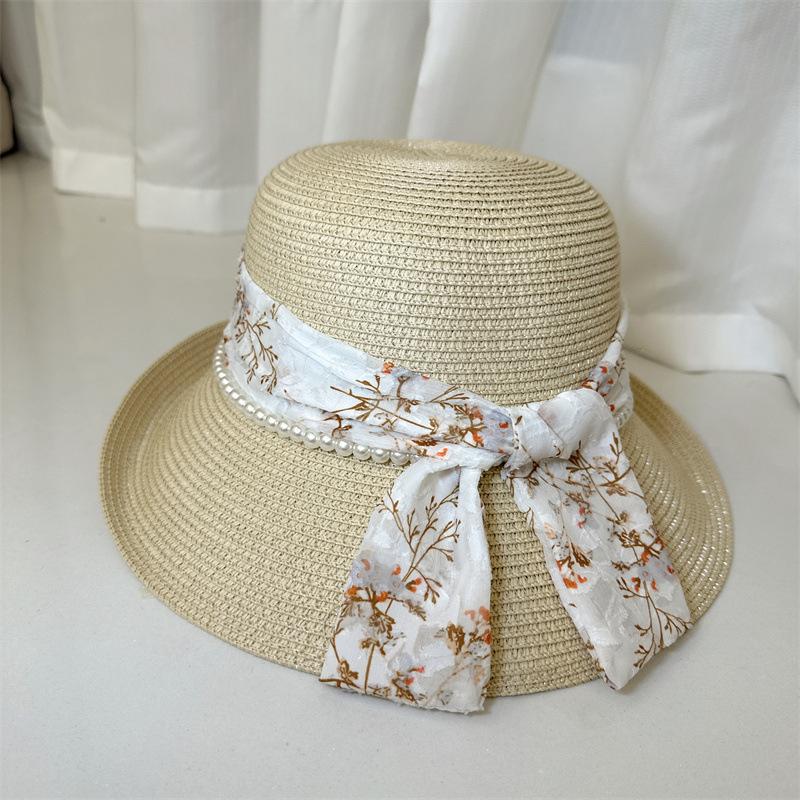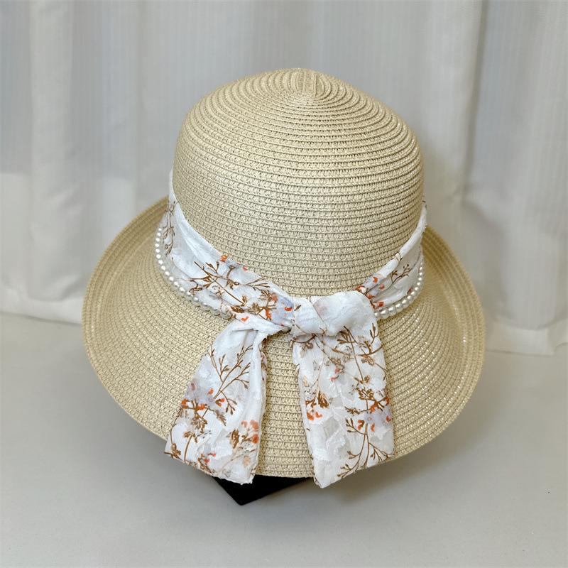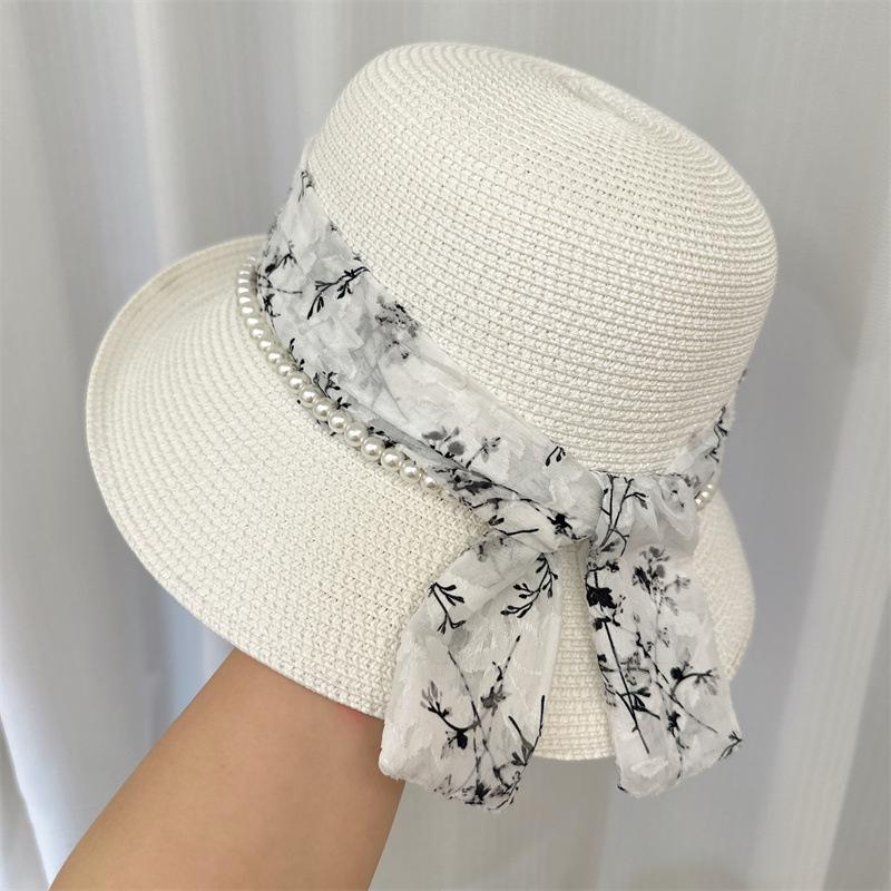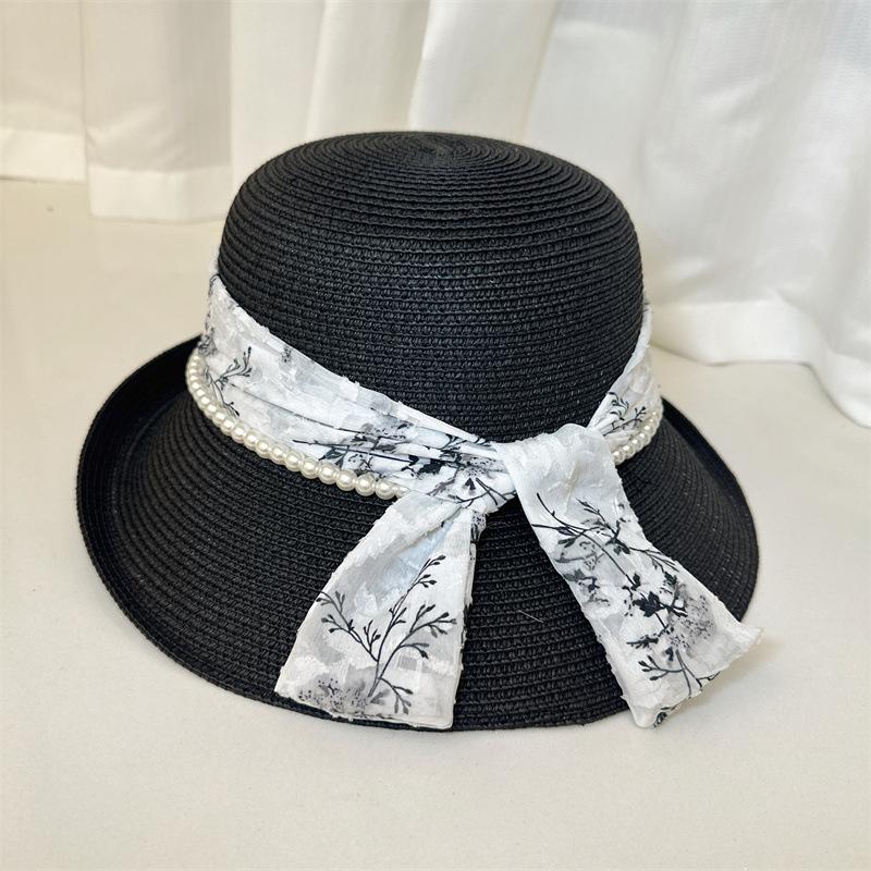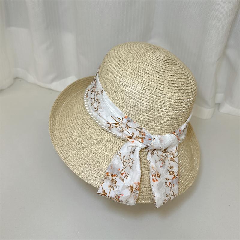 Sombrero de Paja de Ala Ancha con Lazo Floral de Perlas Guofeng para Viaje de Verano, Sombrero de Cubo de Moda para Mujer con Protección Solar