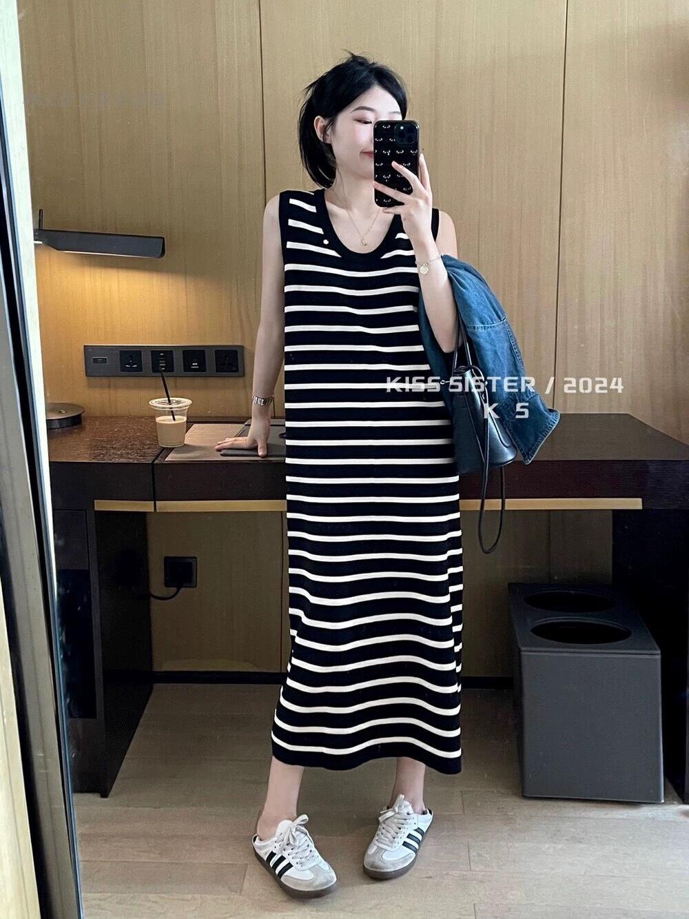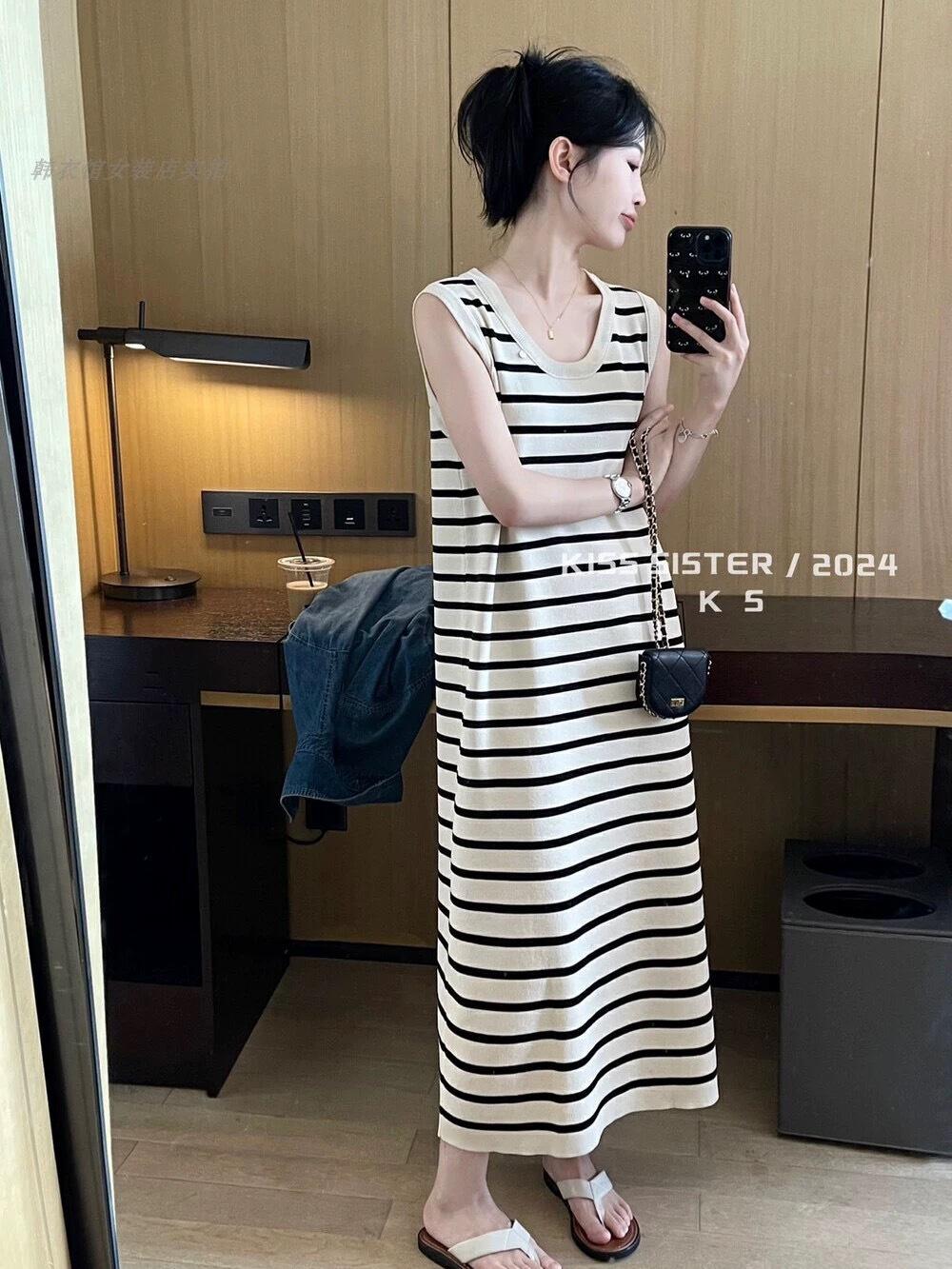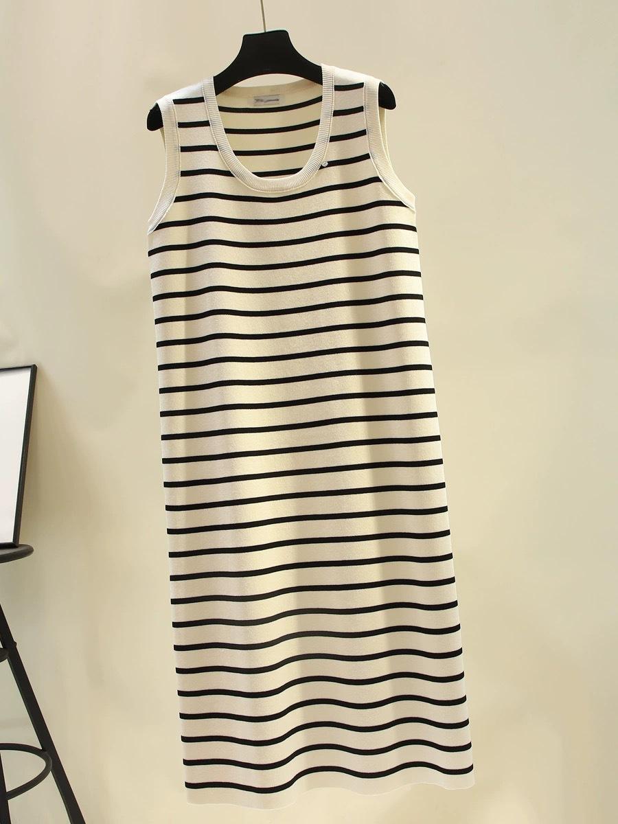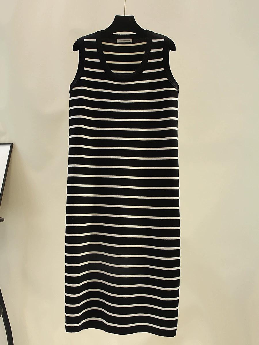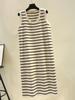 Vestido Tejido sin Mangas con Cuello U de Rayas en Contraste para Mujer Verano Nuevo Estilo Vestido Pequeño Chic y Hermoso