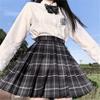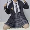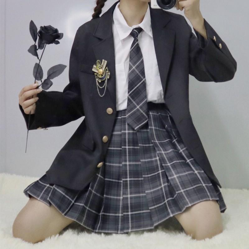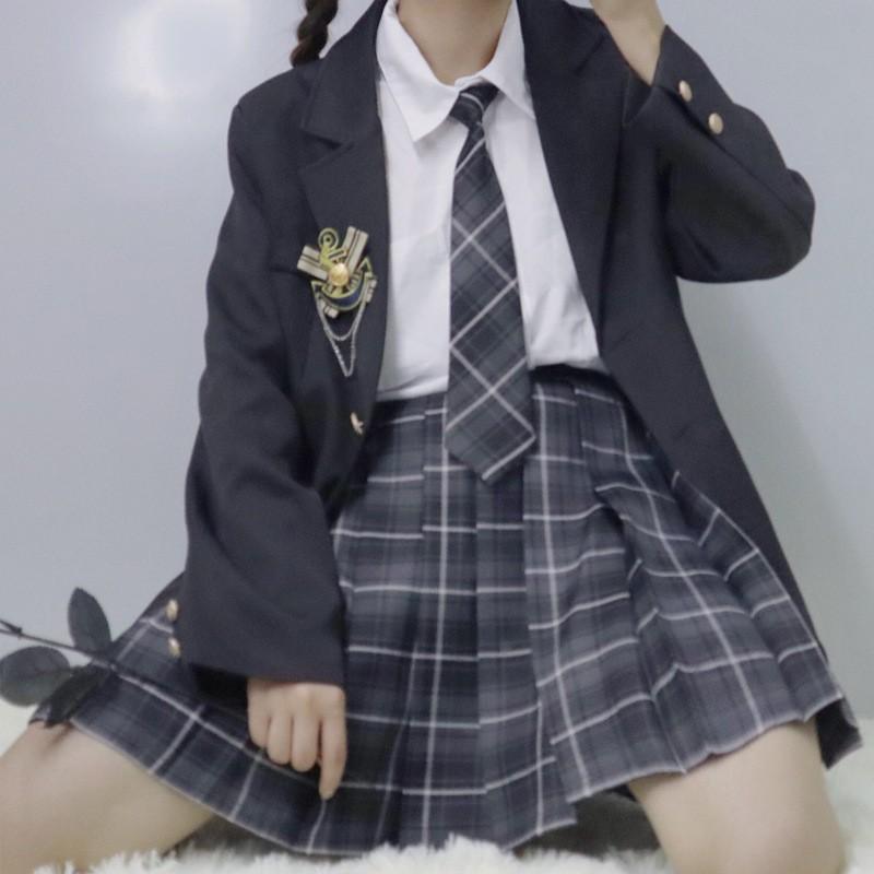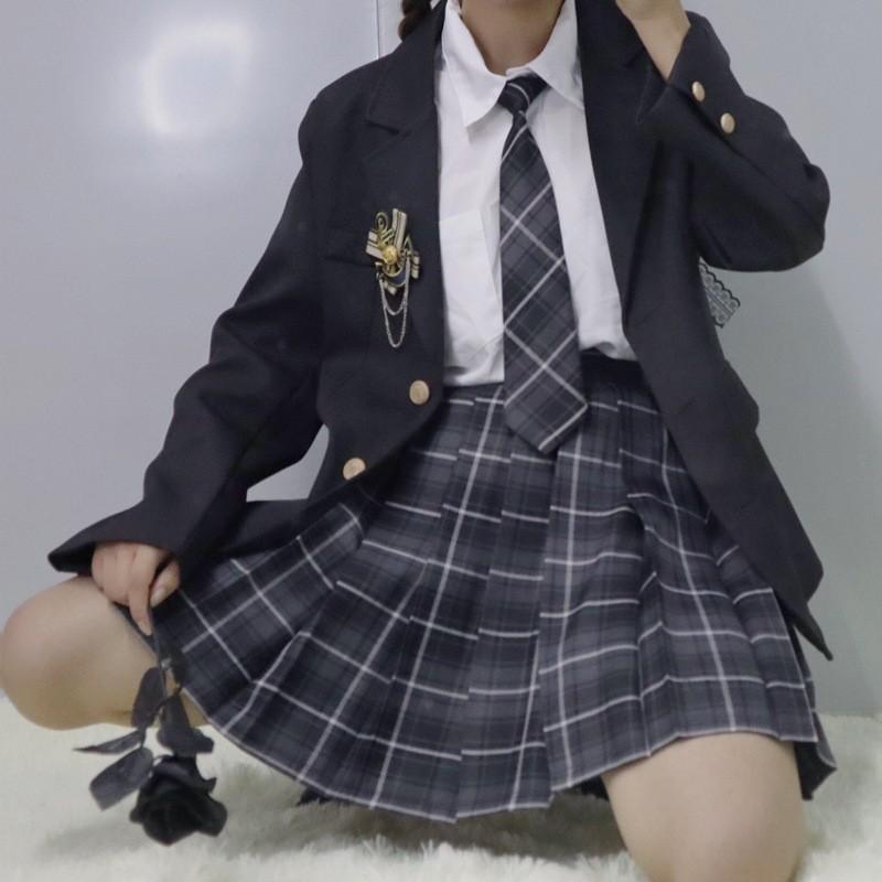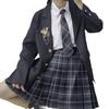Falda a cuadros gris ceniza Conjunto de uniforme Jk Falda plisada de manga larga para mujer Traje blazer negro Estilo universitario